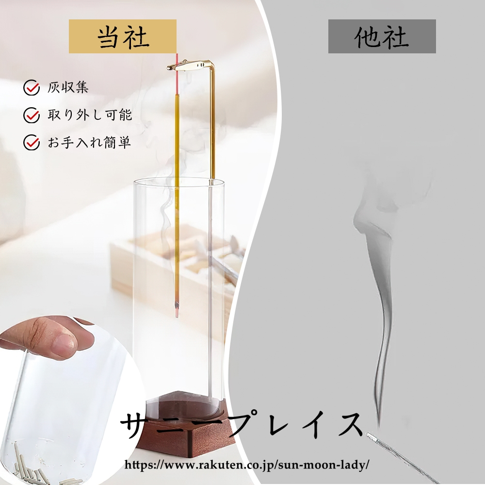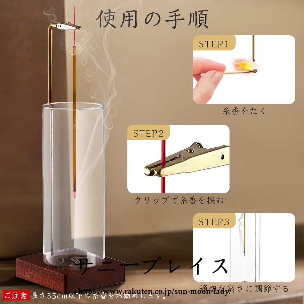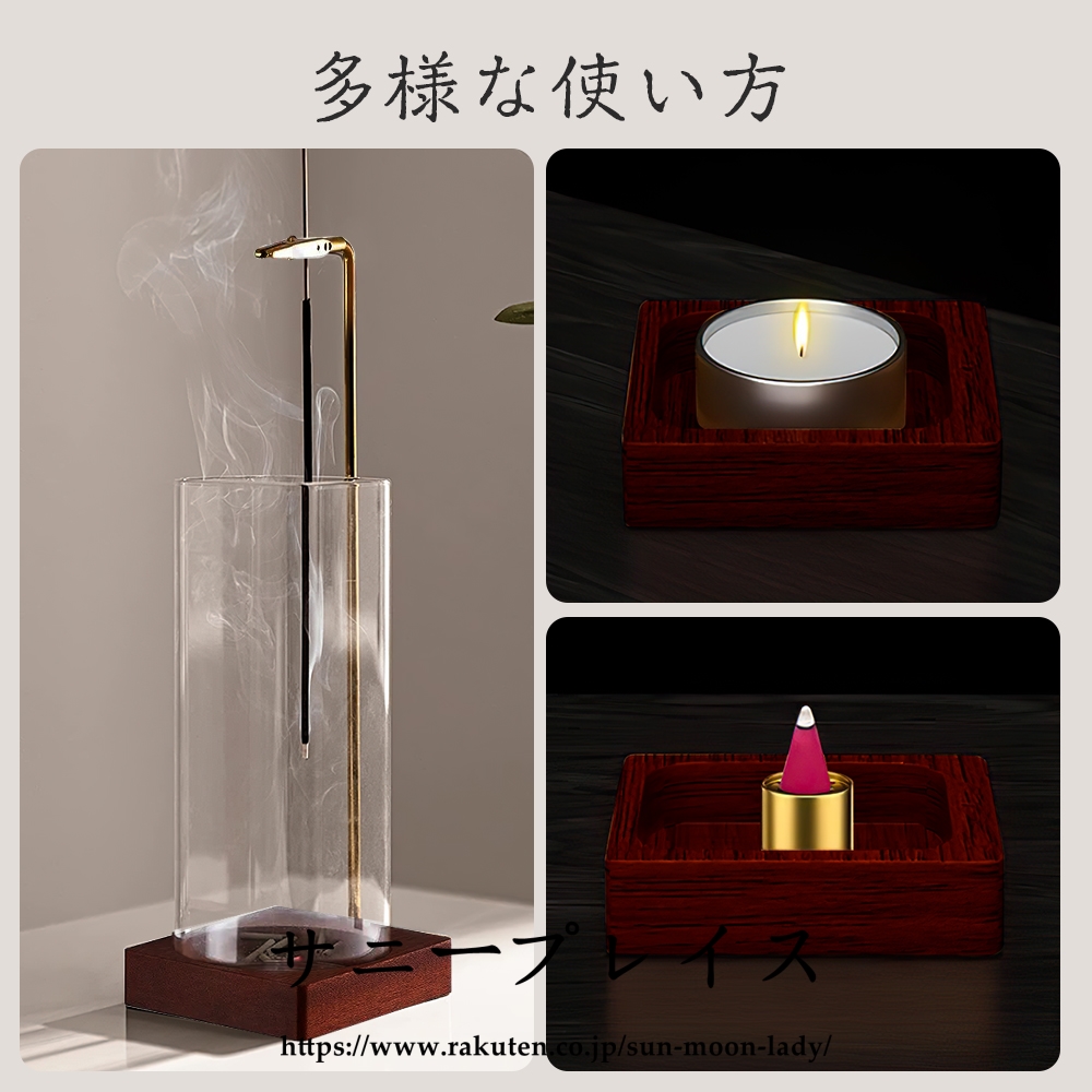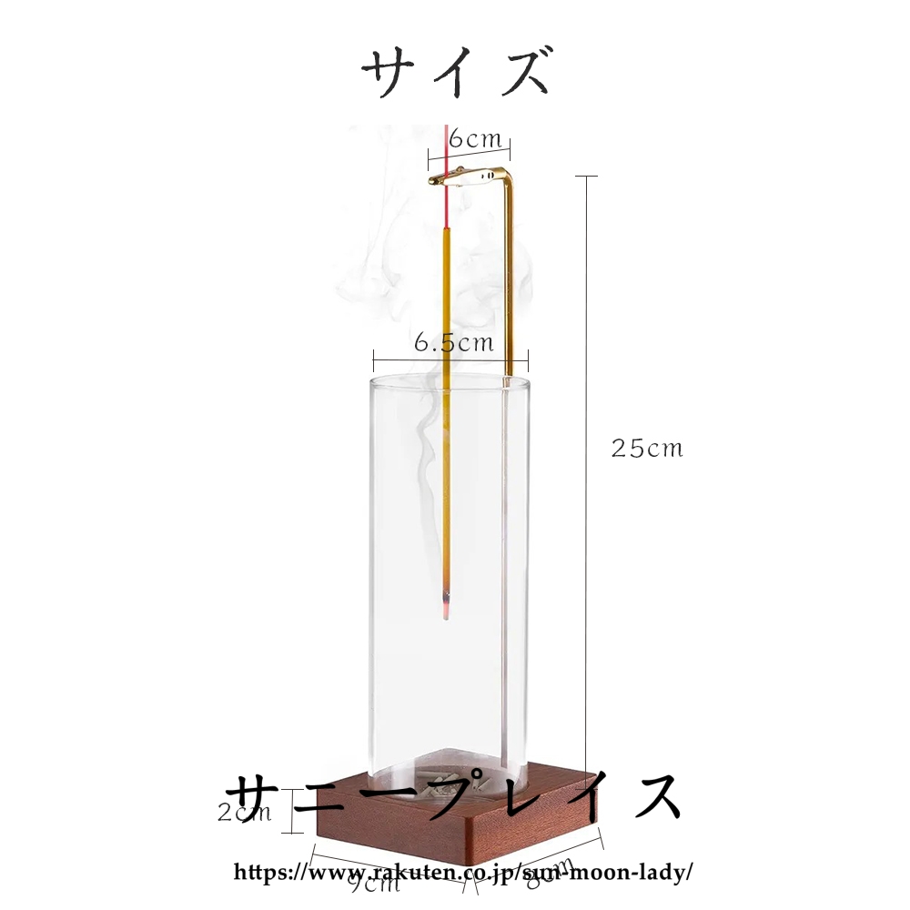 ベースはクルミの木を採用、容器はガラス製透明感があり、どんなインテリアにもマッチするので様々なシーンで活躍します。 リビング、仏壇 、書斎、 玄関先のほかホテル、カフェ、ヨガルーム、イベント会場等ゲストのおもてなしの香りとして活用 線香立てのクリップ部分は長時間の使用可能な黄銅素材なので高温で酸化しにくい変形のしにくいです。