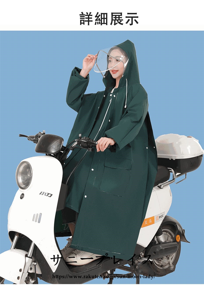 【大きな二重つば付き】フードに透明で取り外し可能なレインバイザーが装着されており、視界をクリアにしながら防滴、防風、防雪の効果を発揮します。顔をしっかり遮蔽するため、斜めからの雨でも顔が濡れず、風の強い日でもフードが飛ばされることがありません。フードは、雨水が入り込まないように調整することができます。これがあれば、傘を差さずに、視界を遮ることなく安全に運転できるので、自転車やバイク、原付バイクを運転するときにとても便利です。