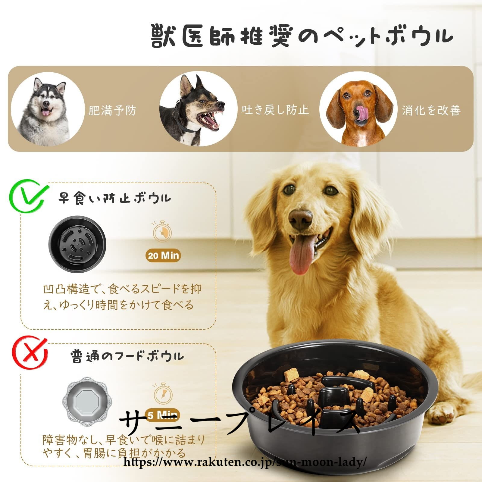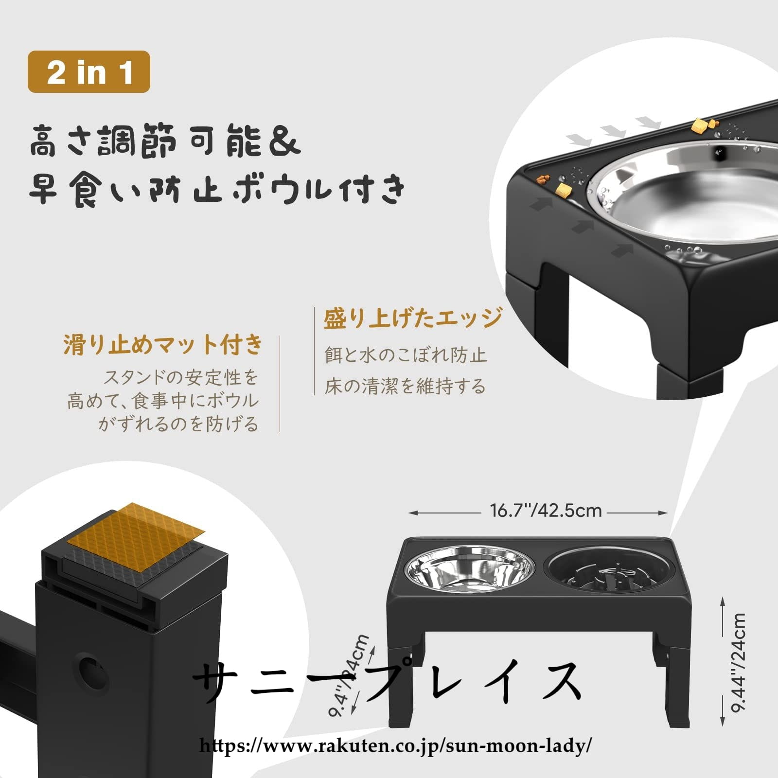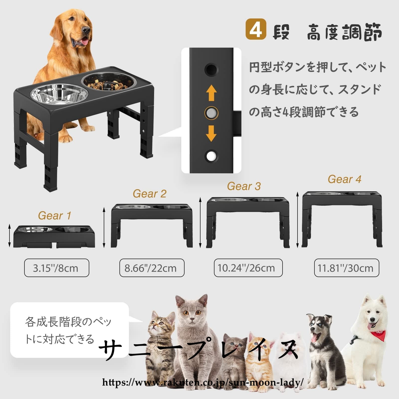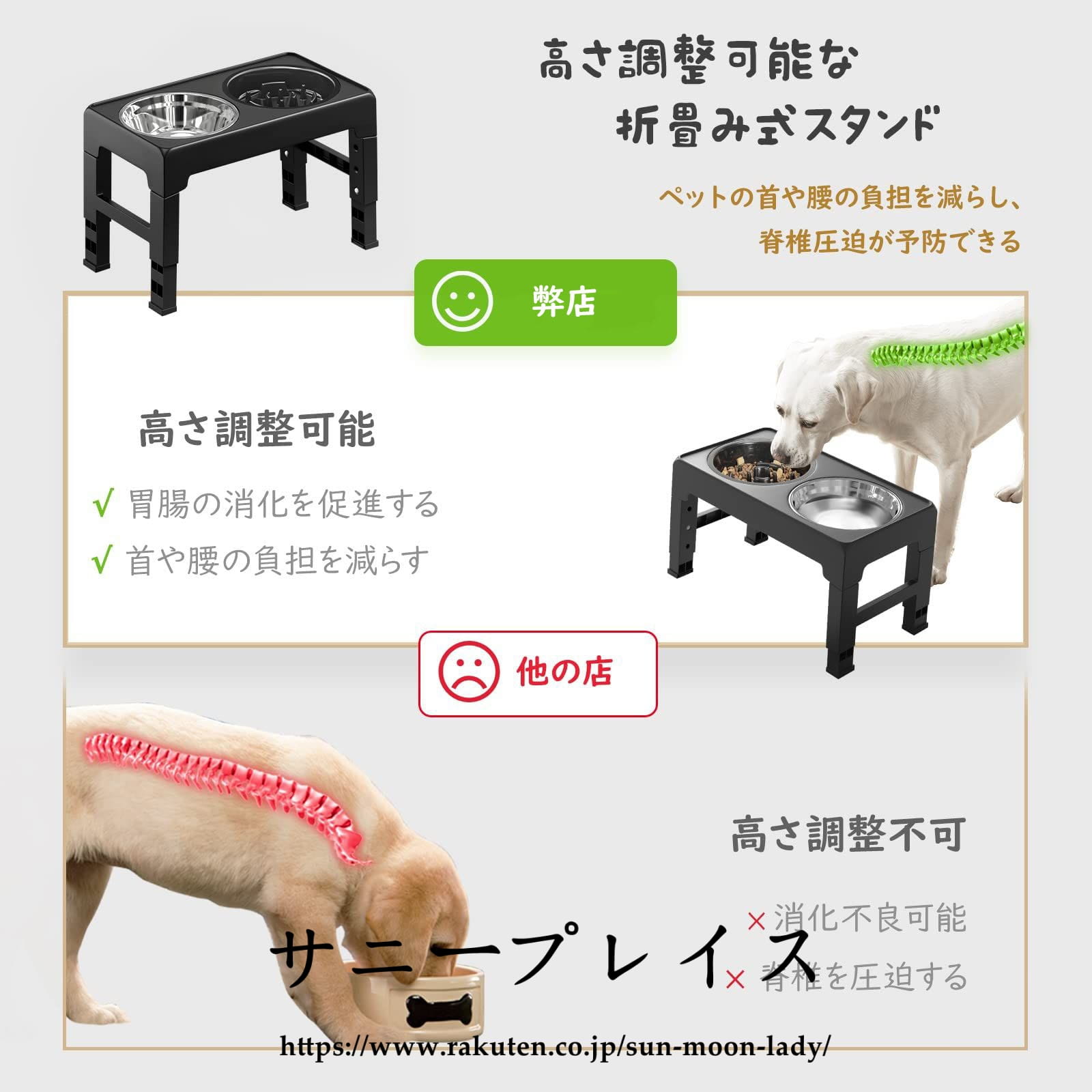 「ペットボウルスタンド付き 高さ4段調節可」 高さ4段調節可能のペットボウルスタンド付き、ペットの身長に合わせて調整できます。低姿勢で食べることはペットの体にさまざまな負担がかかります。低い姿勢で体を曲げて食べることは、食道を曲げ吐き戻しの原因となり、食事中・食後の吐き戻しを引き起こします。食器の高さを適切な高度まで調整することにより、吐き戻しが防止でき、より易く食べられます。それに、ペットの首や腰の負担を減らし、脊椎圧迫が予防できます。