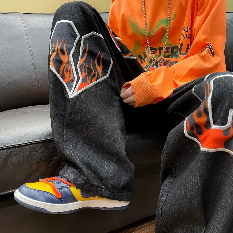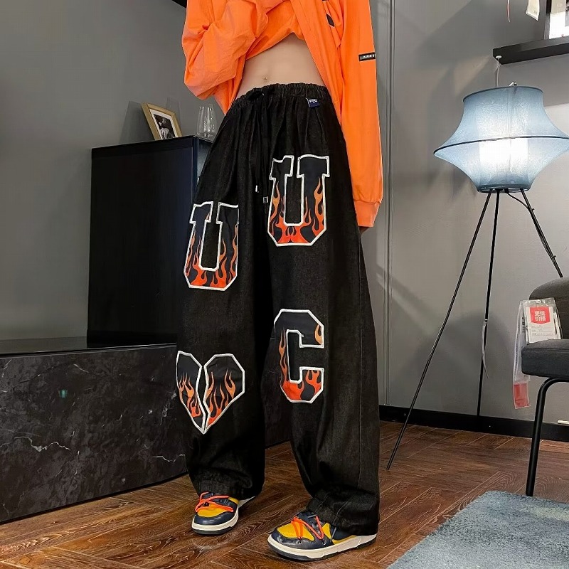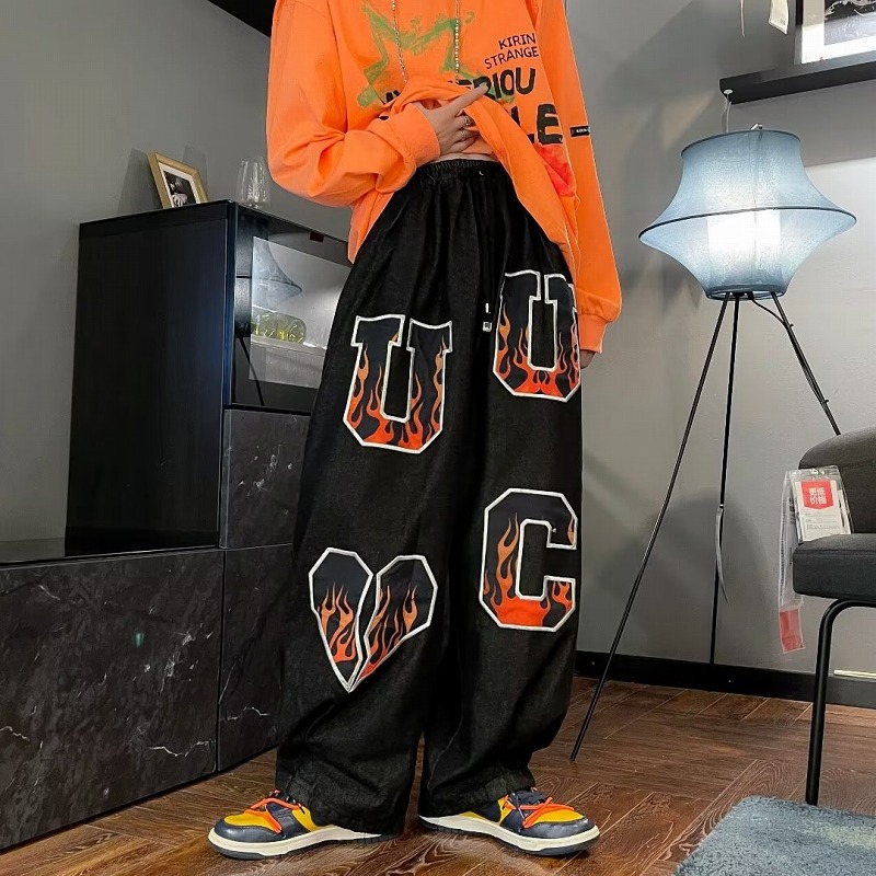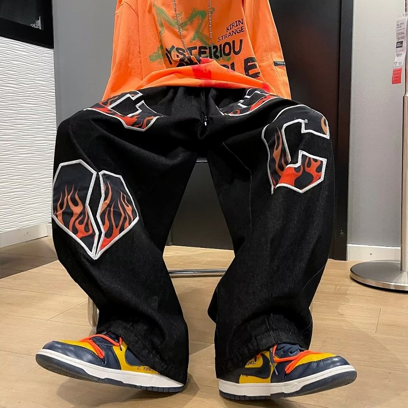 パンツ ズボン 切り替え 体型カバー 刺繍 刺しゅう デニム 大きいサイズあり 原宿系ファッション 韓国風ダンス 衣装 ヒップホップ HIPHOP 個性 奇抜 かわいい 青文字系 ボトムス レディース