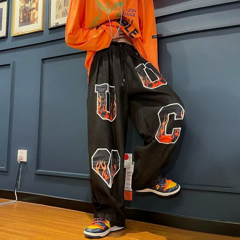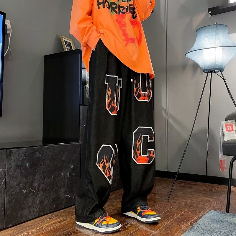 パンツ ズボン 切り替え バイカラー 配色 体型カバー デニム 落書き 大きいサイズあり ユニセックス 男女兼用 原宿系ファッション 韓国風ダンス 衣装 ヒップホップ HIPHOP 個性 奇抜 かわい