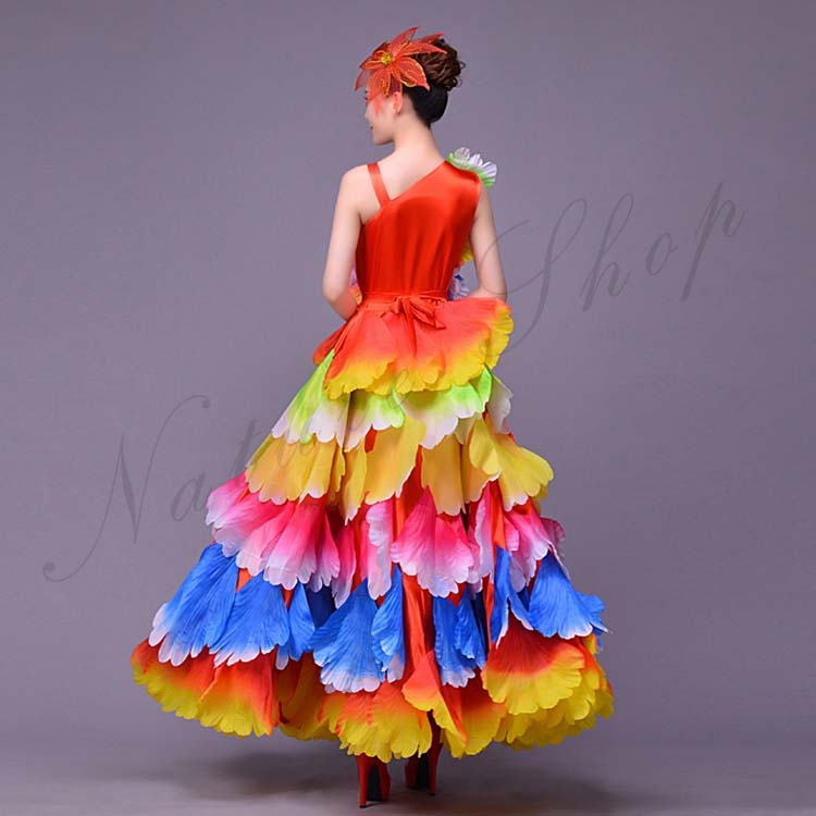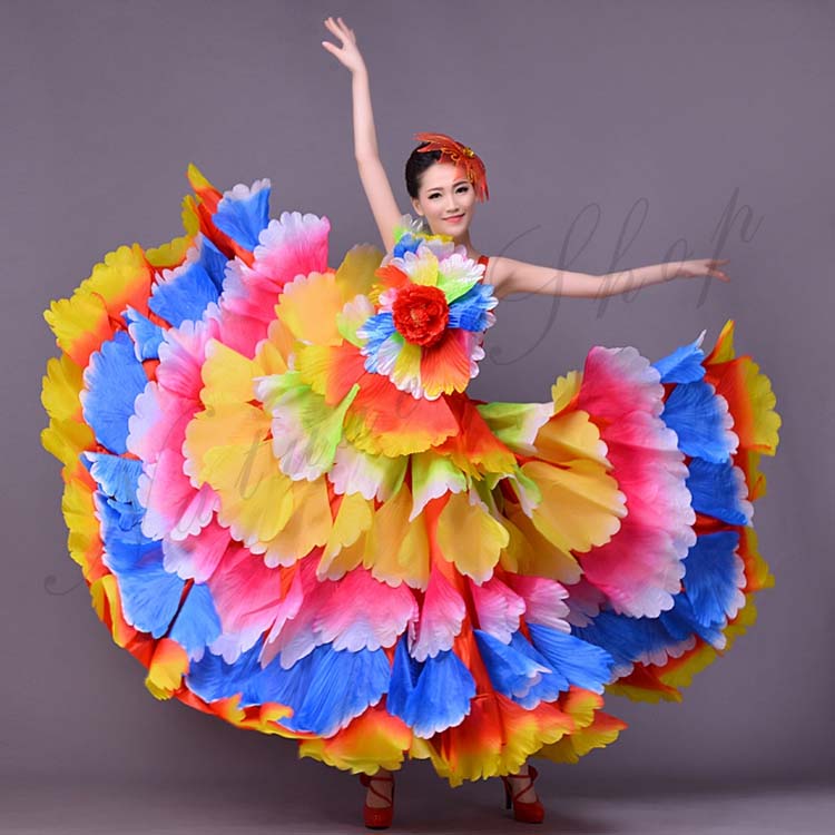 広がる大きい裾 マキシ丈 グラデーション 360°合唱服 L レディース ワンピース 大人 フラメンコ ロング丈 ラテン 花びら ドレス マルチカラー ロング ワルツ 華やか XL 古典ダンス