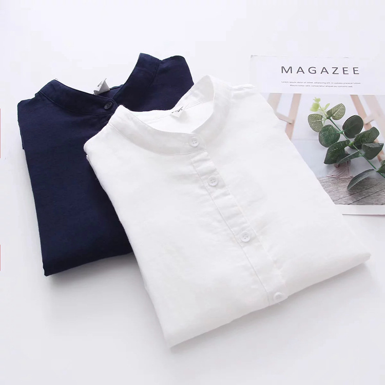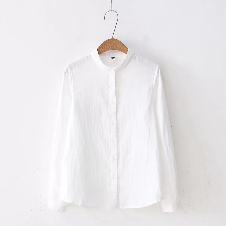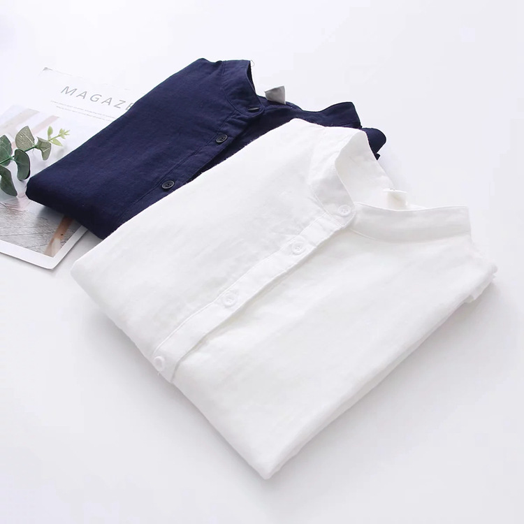 ダブルガーゼ シャツ 綿シャツ レディース 綿 ブラウス バンドカラーシャツ ハイネック 長袖 シャツ 2重ガーゼ 綿 コットン 通気性 膨らみ 無地 春 夏 秋 ネイビー ホワイト 白