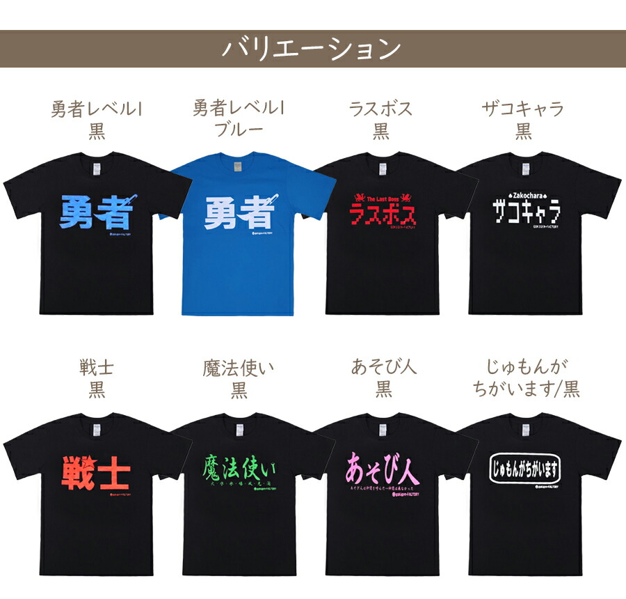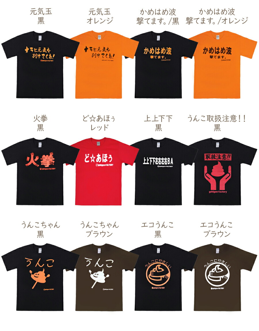 horizontal-key: 品番19109:勇者レベル1 黒 品番19109:勇者レベル1 ブルー 品番00229:ラスボス 黒 品番00230:ザコキャラ 黒 品番19110:戦士 黒 品番19111:魔法使い 黒 品番19112:遊び人 黒 19127:じゅもんがちがいます 黒 品番19038:元気玉 黒 品番19038:元気玉 オレンジ かめはめ波撃てます。 黒 かめはめ波撃てます。 オレンジ 品番21012:火拳 黒 品番19020:ど☆あほぅ レッド 品番19050:上上下下 黒 品番00182:うんこ取扱注意!! 黒 品番19009:うんこちゃん 黒 品番19009:うんこちゃん ブラウン 品番19092:エコうんこ 黒 品番19092:エコうんこ ブラウン