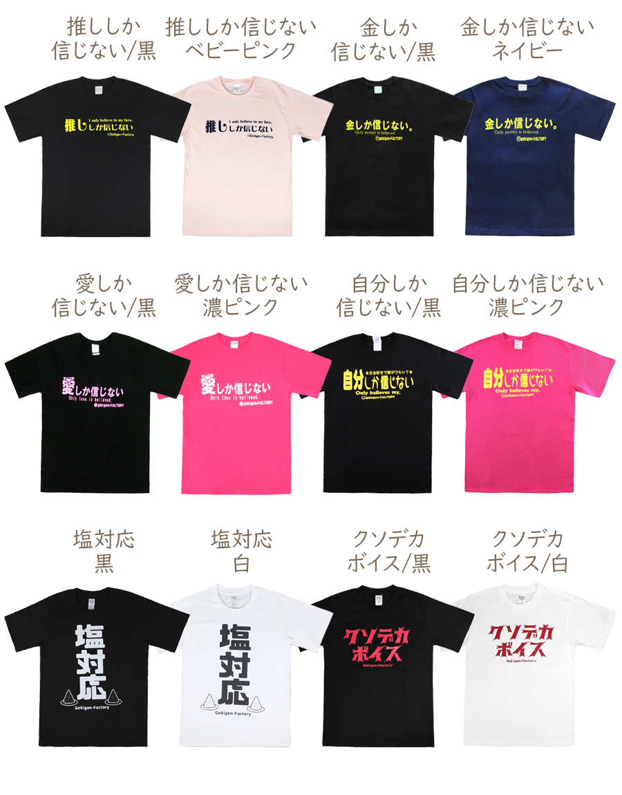 horizontal-key: 品番19019:ネガティブ 黒 品番00266:本番に弱い 黒 品番00236:天才 黒 品番00254:カフェイン中毒 黒 品番00240:都会は病む。 黒 品番00259:うっかり番長 黒 品番00258:超絶★暇人 黒 品番00252:ただいま故障中?黒 品番00268:推ししか信じない?黒 推ししか信じない?ベビーピンク 品番19035:金しか信じない 黒 金しか信じない ネイビー 品番19071:愛しか信じない 黒 愛しか信じない 濃ピンク 品番00117:自分しか信じない 黒 自分しか信じない 濃ピンク 品番00214:塩対応 黒 品番00214:塩対応 白 品番00253:クソデカボイス 黒 品番00253:クソデカボイス 白