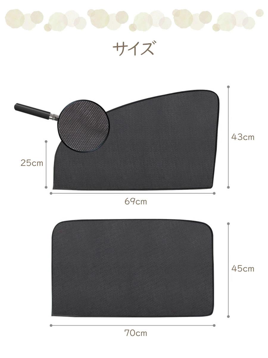 ・長方形:70cm * 45cm * 45cm商品説明 ■汎用タイプのサイドガラス用サンシェード。