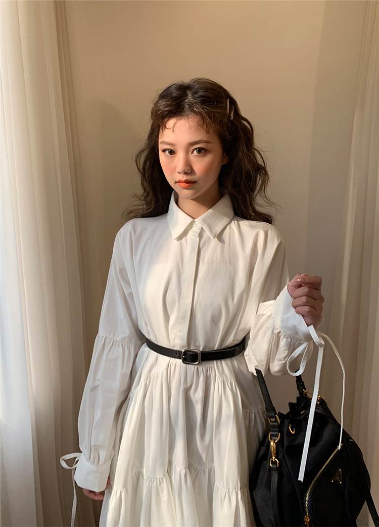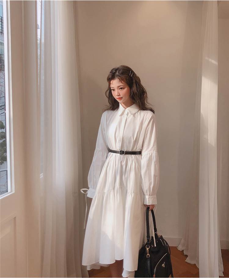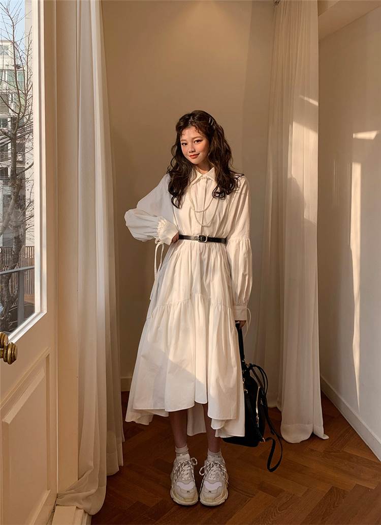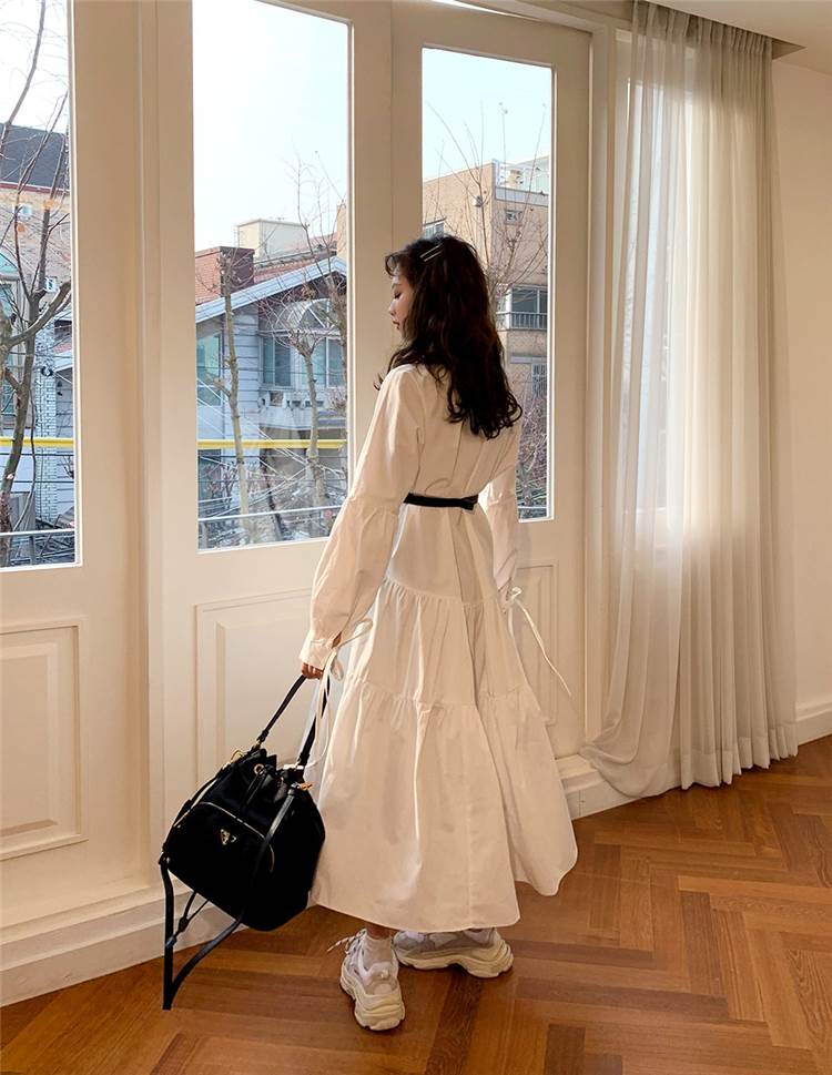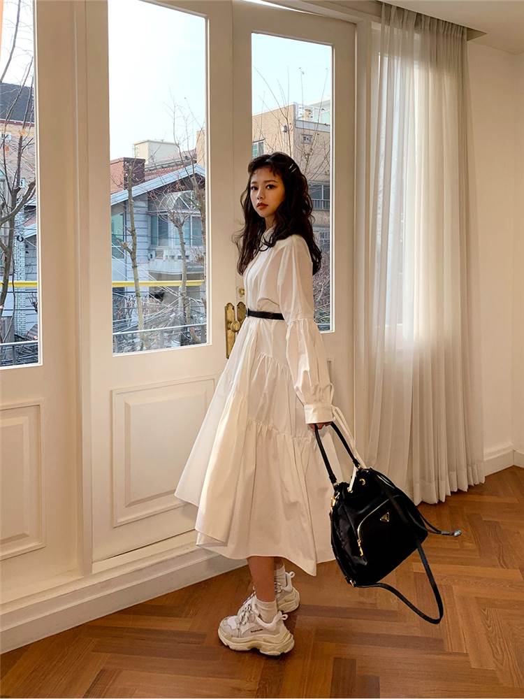 ワンピース ロング丈 袖あり 長袖 襟付き スタンドカラー フレア Aライン ウエストマーク かわいい 大人可愛い きれいめ シンプル カジュアル 大人 上品 おしゃれ お洒落 大人女子 こなれ感 ラフ ラブリー キュート ガーリー 主役級 存在感 無地 春 秋 20代 30代 レディース 女性用 デート 女子会 休日 旅行 コーデ スタイル 楽ちん 体系カバー インスタ映え サイズ S M L XL 色展開 白 ホワイト