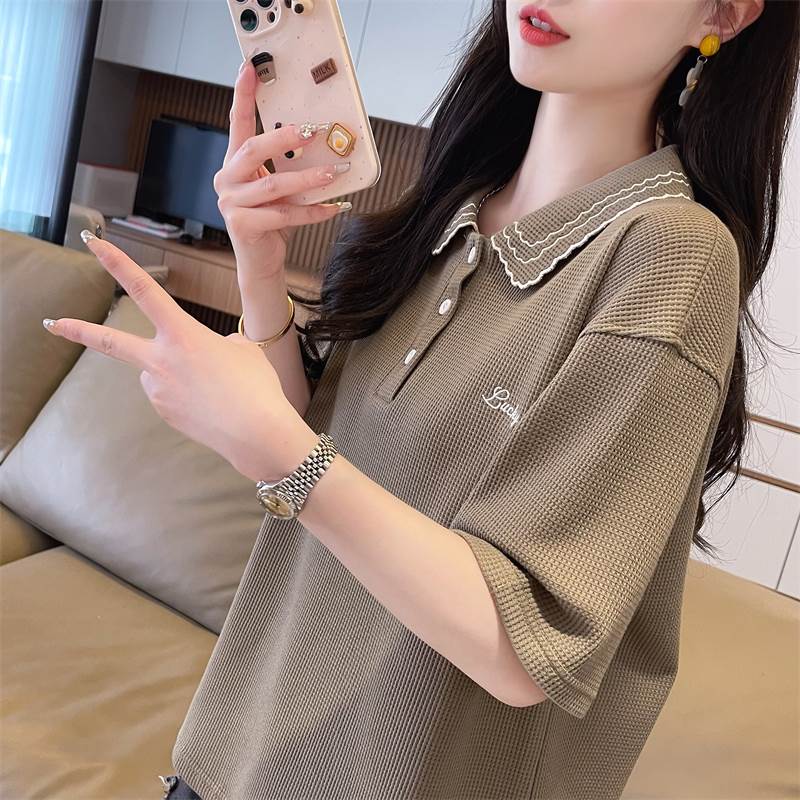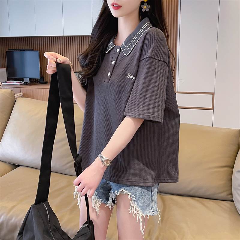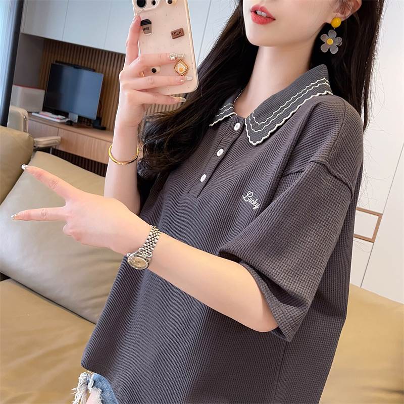 レディース トップス ポロシャツ ミドル丈 半袖 5分袖 襟付き 襟刺繍 ワイド ストレート かわいい 大人可愛い きれいめ シンプル カジュアル おしゃれ ラフ メンズライク ガーリー すっきり 無地 夏 学生 学校 通学 デート お出かけ 休日 コーデ 楽ちん 体型カバー M L XL 2XL ゆったり ゆる ダークグレー カーキ アプリコット
