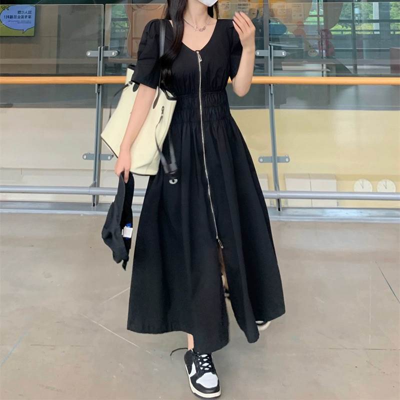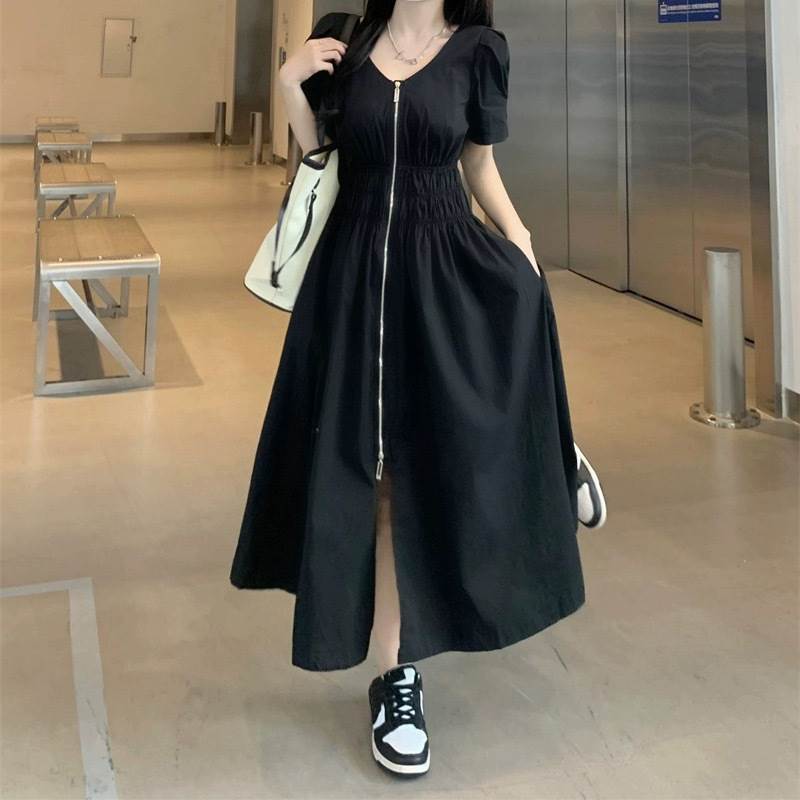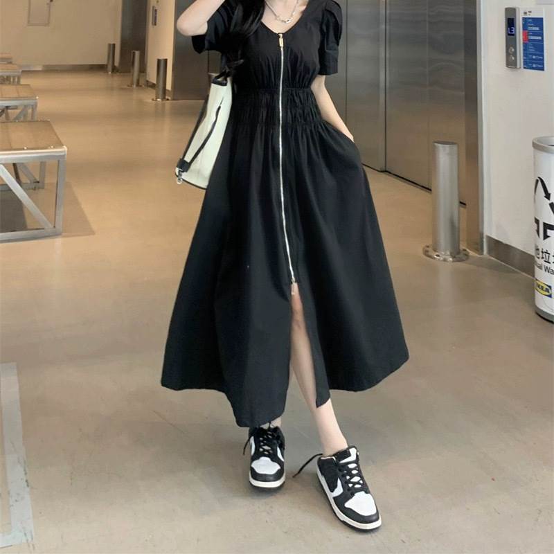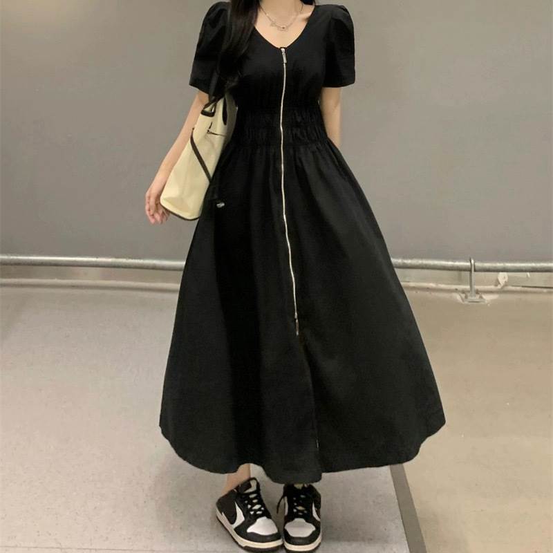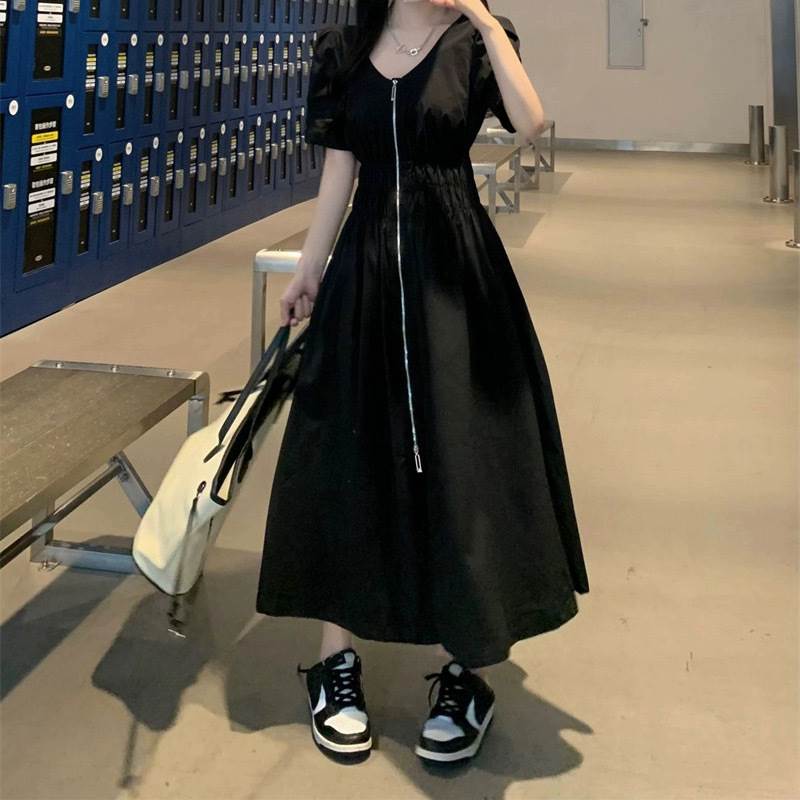レディース スカート ワンピース 前開き ロングスカート ロング丈 半袖 パフスリーブ Vネック フレア スリム Aライン ストリート ファスナー ジップアップ 大人可愛い シンプル カジュアル おしゃれ かっこいい こなれ感 ラフ ルーズ クール 抜け感 キュート 無地 春 夏 ママ 学生 デート お出かけ アウトドア 旅行 公園 女子会 休日 ショッピング モノトーン 韓国 コーデ 楽ちん 体型カバー 脚長 普段使い M L XL 2XL 3XL 4XL 大きいサイズ ゆったり ゆる 黒 ブラック