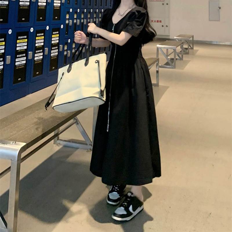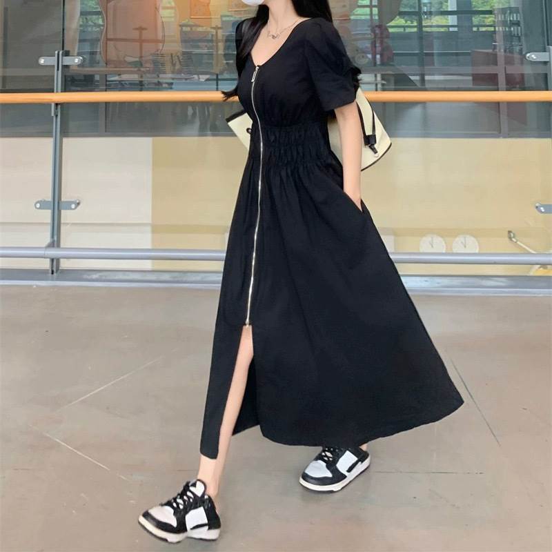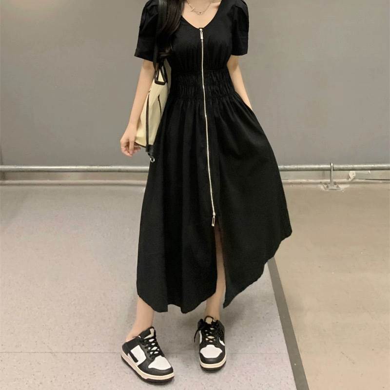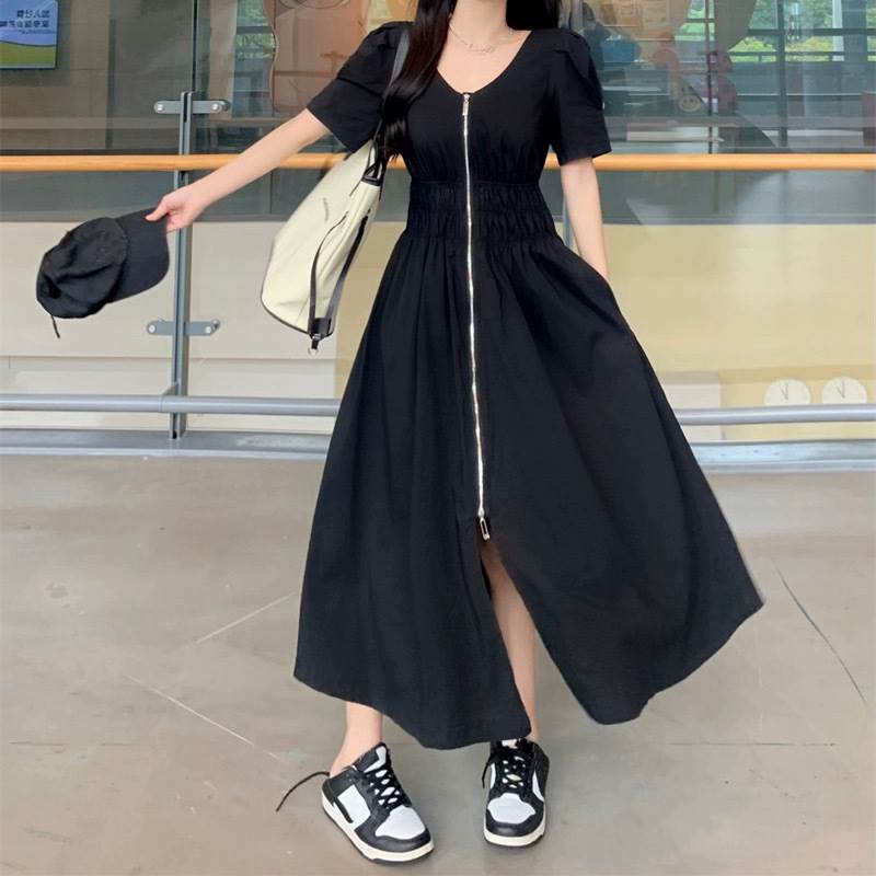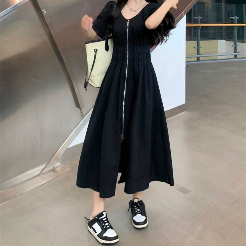 レディース スカート ワンピース 前開き ロングスカート ロング丈 半袖 パフスリーブ Vネック フレア スリム Aライン ストリート ファスナー ジップアップ 大人可愛い シンプル カジュアル おしゃれ かっこいい こなれ感 ラフ ルーズ クール 抜け感 キュート 無地 春 夏 ママ 学生 デート お出かけ アウトドア 旅行 公園 女子会 休日 ショッピング モノトーン 韓国 コーデ 楽ちん 体型カバー 脚長 普段使い M L XL 2XL 3XL 4XL 大きいサイズ ゆったり ゆる 黒 ブラック