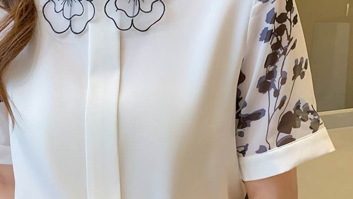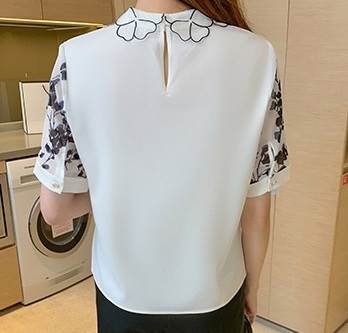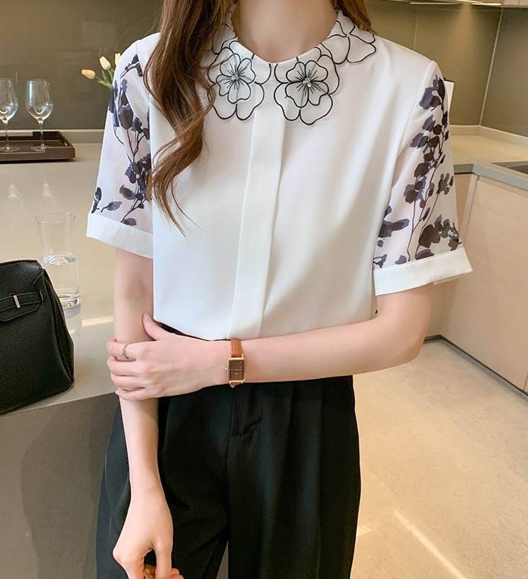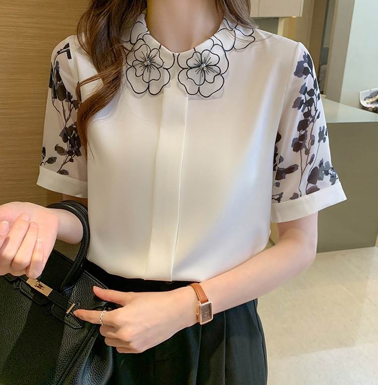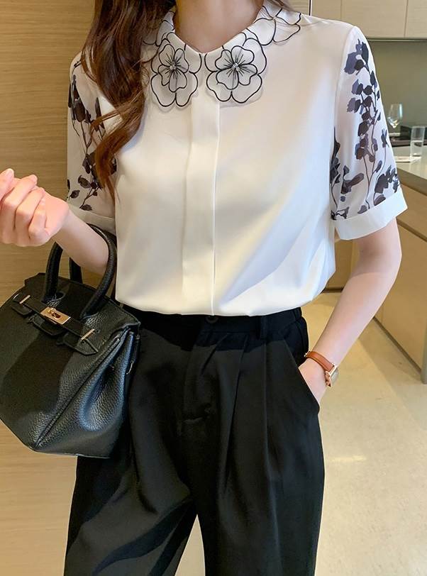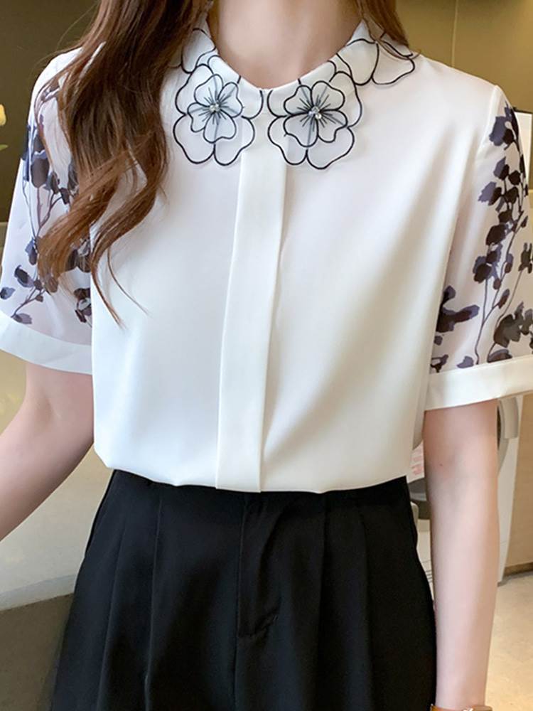 トップス 半袖 袖あり シャツ ブラウス 透かし デザイン レトロ 刺繍 プリント 花柄 襟付き シンプル 大人 大人女子 おしゃれ お洒落 大人可愛い かわいい 可愛い 女子会 通勤 通学 OL オフィス お出かけ デート 旅行 休日 普段着 普段使い 着回し 10代 20代 レディース 夏 大きいサイズ S M L XL 2XL ホワイト 白