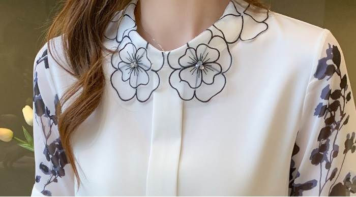 透かし花柄の襟が目を惹くシャツブラウス♪