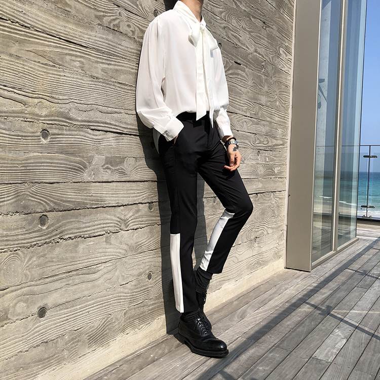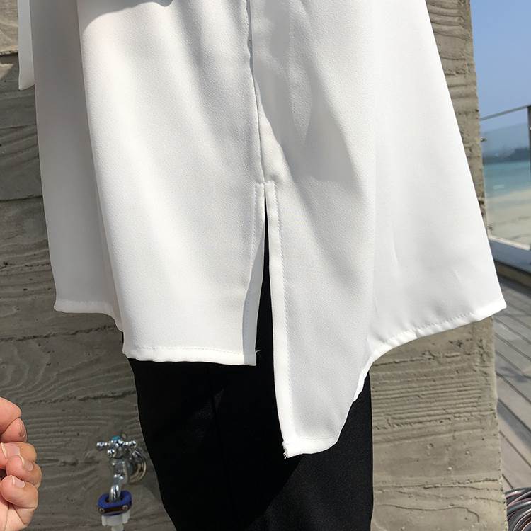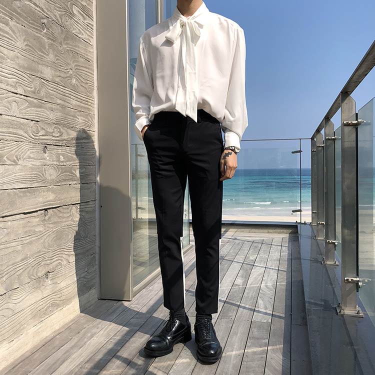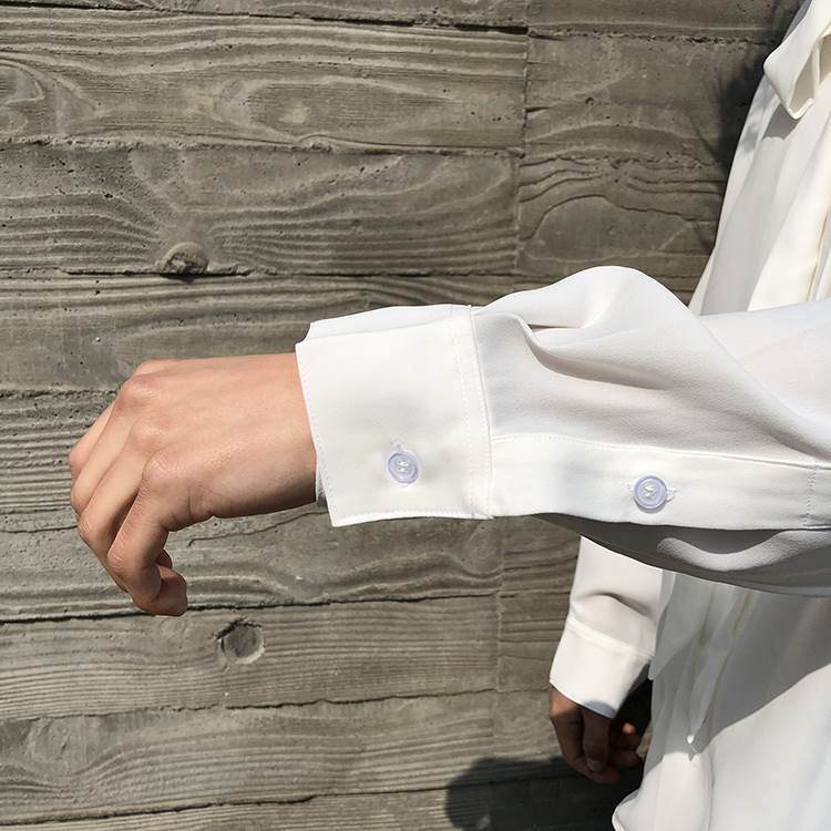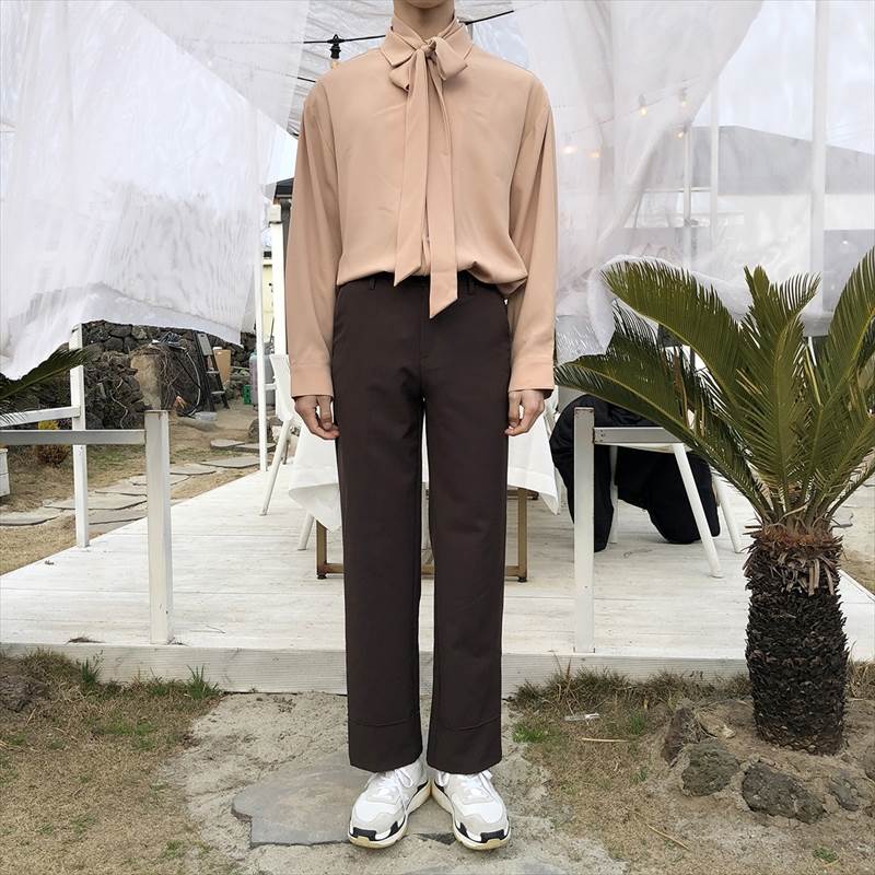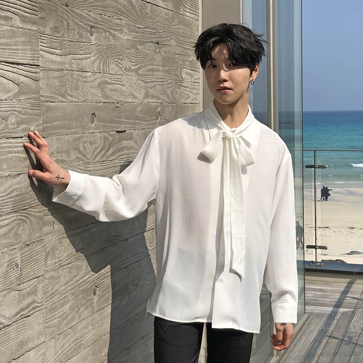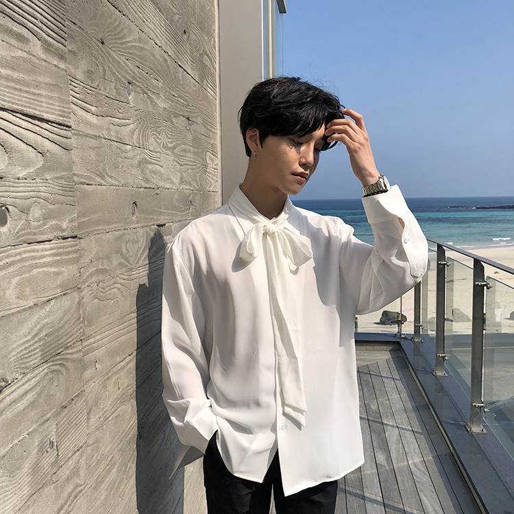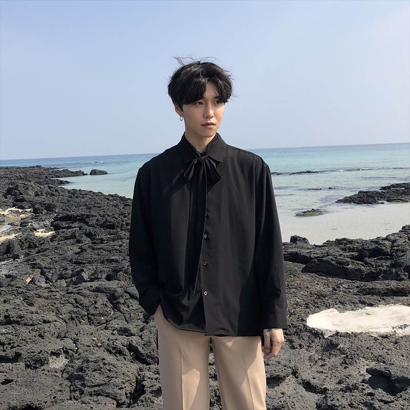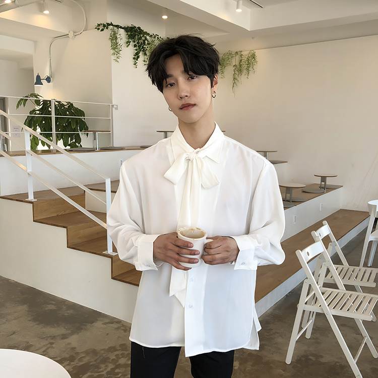 ブラウス トップス 長袖 メンズ レディース 男女兼用 韓国 リボン 前開き 襟付き ボウタイ かわいい シンプル カジュアル おしゃれ こなれ感 無地 春 秋 OL オフィス 通勤 通学 デート