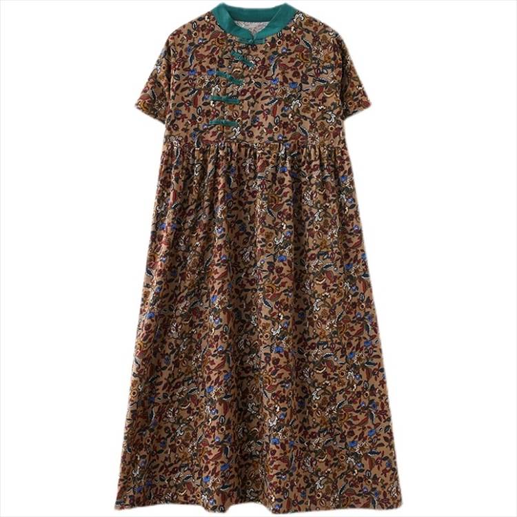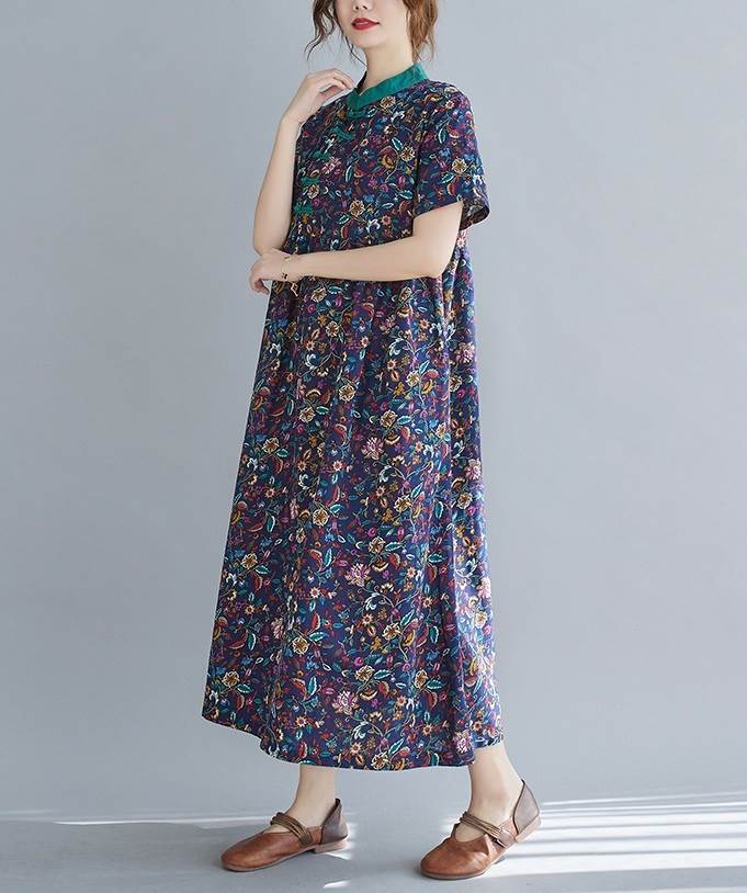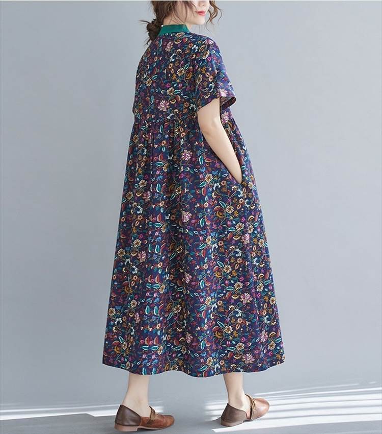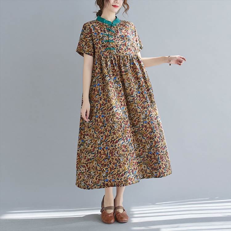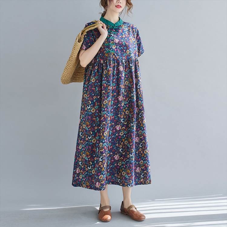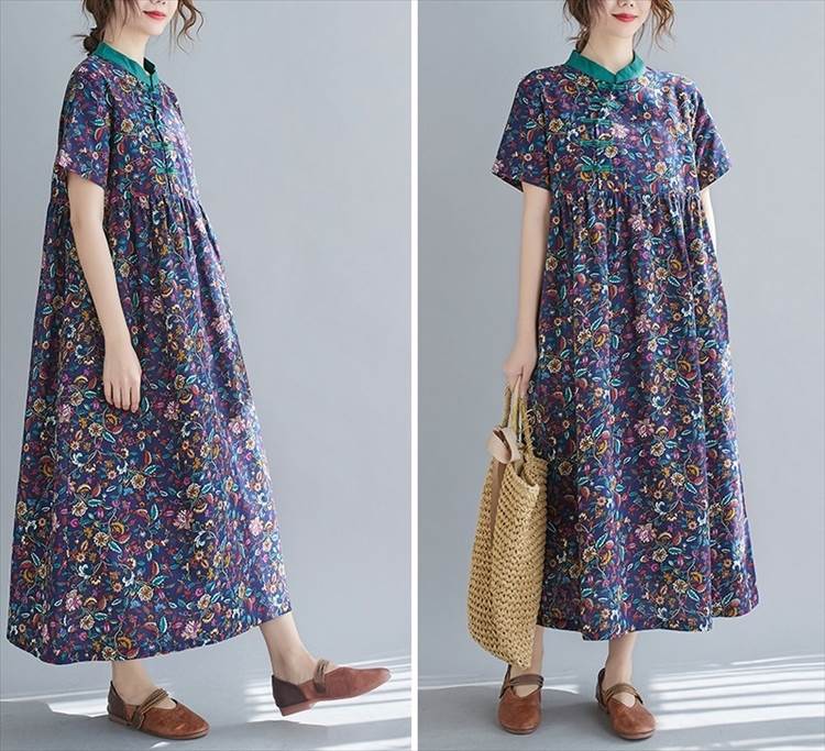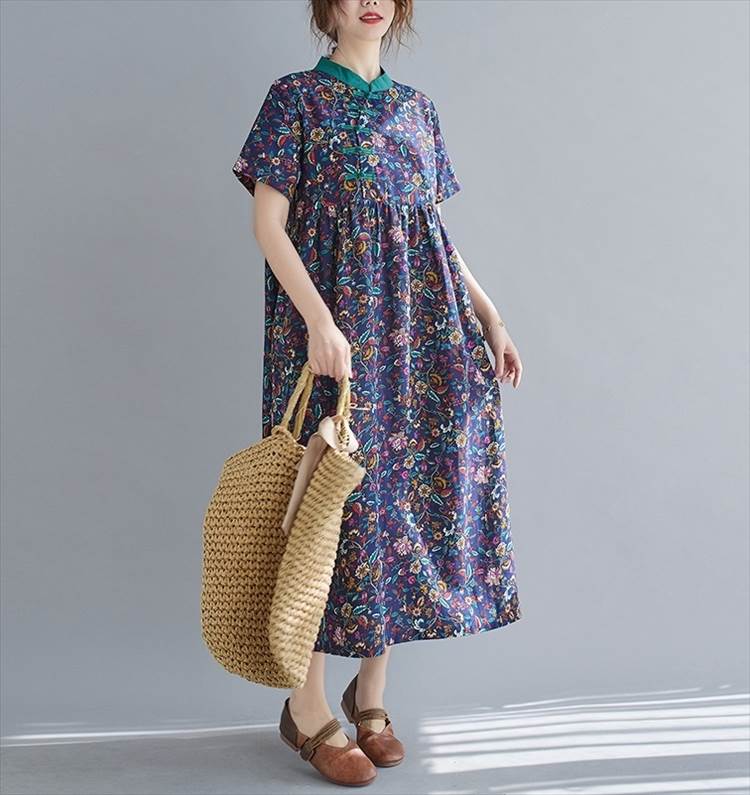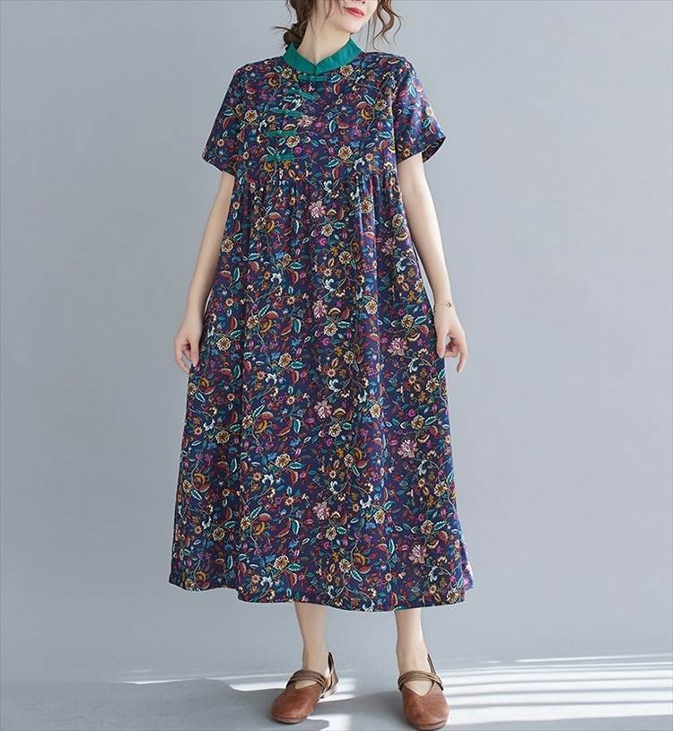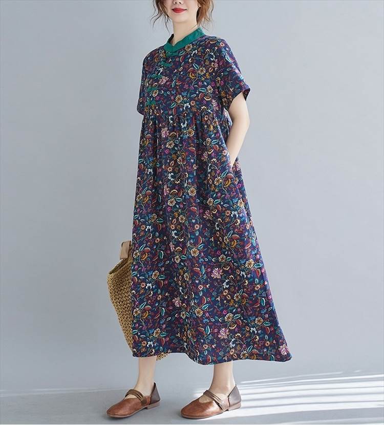 花柄 チャイナ風 ワンピース 膝下 ミモレ ミモレ丈 袖あり 半袖 スタンドカラー Aライン アシンメトリー 切り替えデザイン ポケット ハイウエスト 大人可愛い シンプル カジュアル 大人 おしゃれ お洒落 アジアン 大人女子 ルーズ 個性的 主役級 小花柄 プリント 夏 30代 40代 50代 レディース ママ マタニティ 通勤 デート お出かけ 公園デビュー 女子会 休日 旅行 普段使い 重ね着 韓国 楽ちん 体系カバー ゆったり 大きいサイズ M L XL 2XL 色展開 黄色 イエロー ネイビー