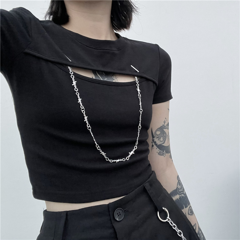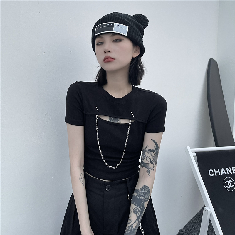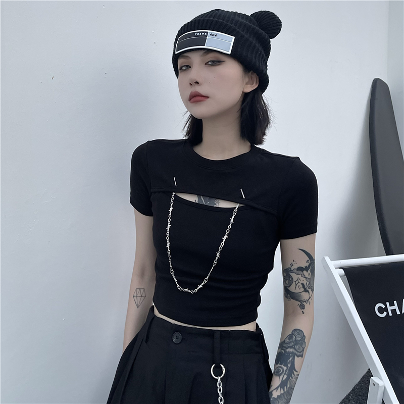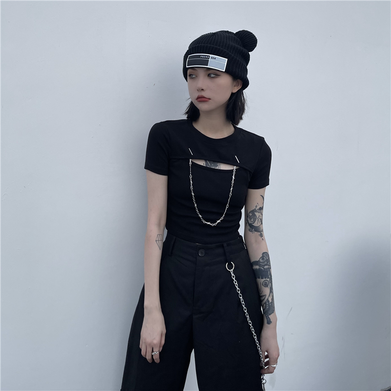 シルバー チェーン カット トップス 半袖 Tシャツ 黒 ブラック 無地 シンプル カットソー ミニ ショート丈 短い 短め へそ出し セクシー ダンス 衣装 ヒップホップ HIPHOP レディース ガールズ ストリート 個性的 奇抜 派手 チビT 韓国