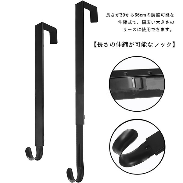 【39-66cm長さの伸縮が可能なフック】長さが39から66cmの調整可能な伸縮式で、幅広い大きさのリースに使用できます。