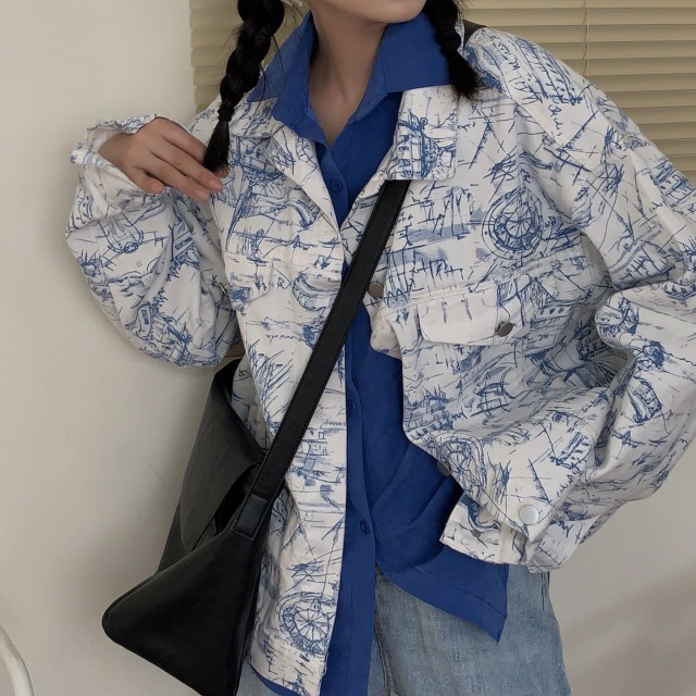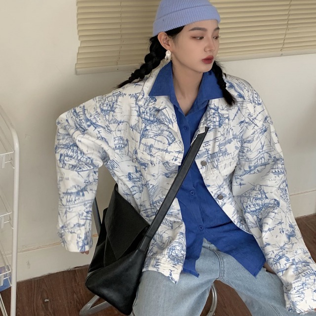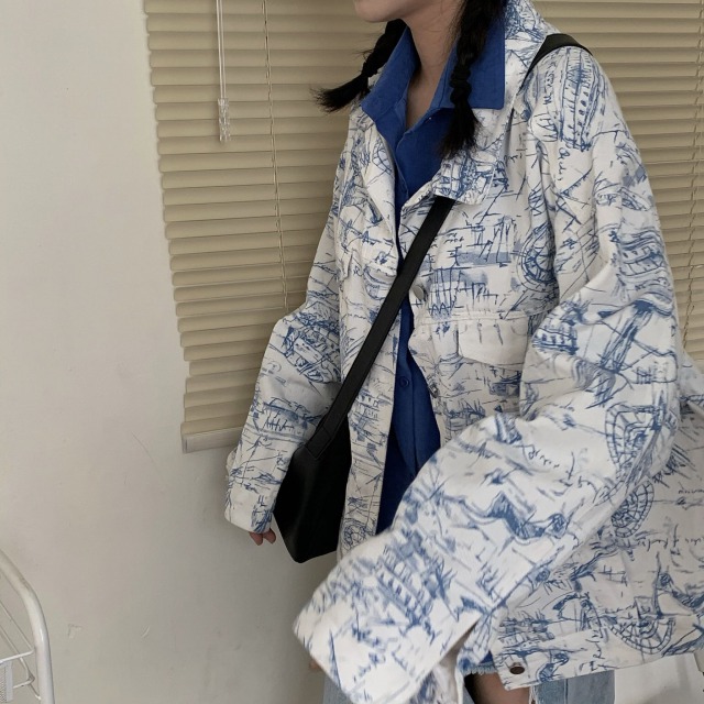 総柄 ジャケット デニム ジージャン Gジャン アウター 白 ホワイト 青 ブルー ヒップホップ HIPHOP レディース メンズ ガールズ ストリート 大きいサイズ ゆったり 奇抜 派手 個性的 スケーター 韓国 おしゃれ 可愛い かっこいい レトロ