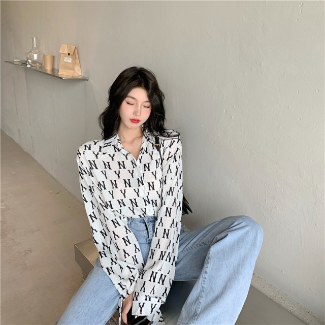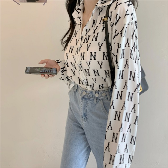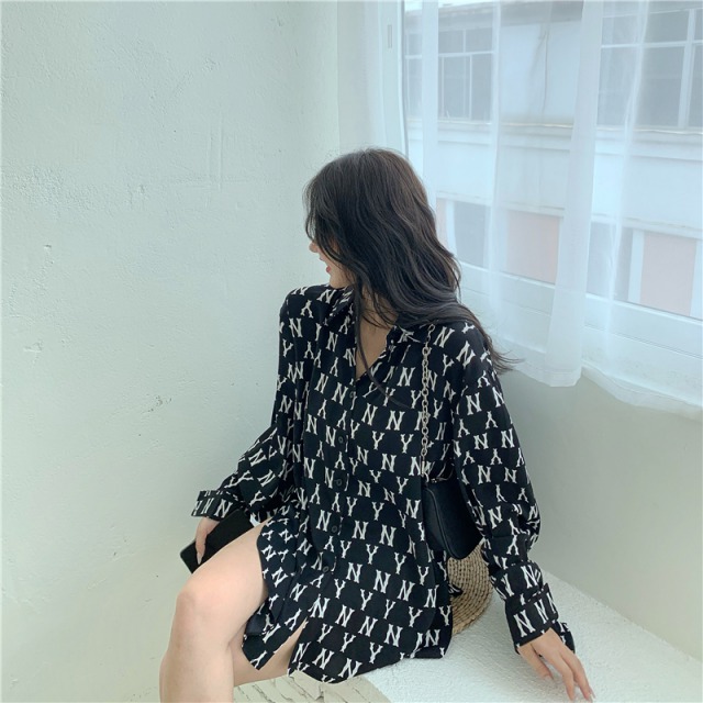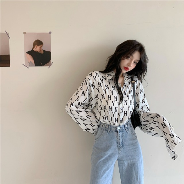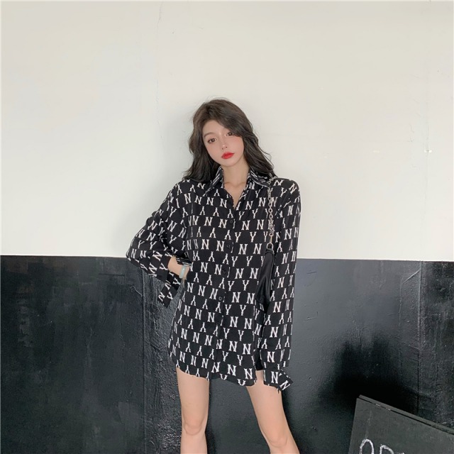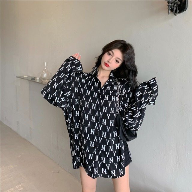 ロゴ 総柄 シャツ ブラウス 長袖 トップス Tシャツ 黒 ブラック 白 ホワイト レディース メンズ ユニセックス ヒップホップ HIPHOP ダンス 衣装 大きい 大きめ ビッグ 羽織り ガールズ モノクロ モノトーン 総柄 柄シャツ カットソー 韓国