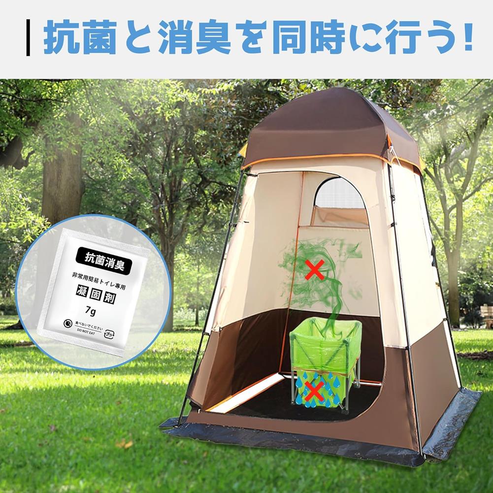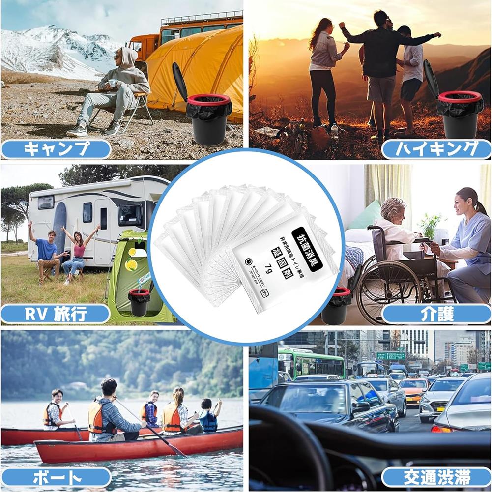 この凝固剤は、トイレのない環境でも安心して使用できる万能アイテムです。キャンプや登山、防災リュック、非常用持ち出し袋など、さまざまなシーンで活躍します。