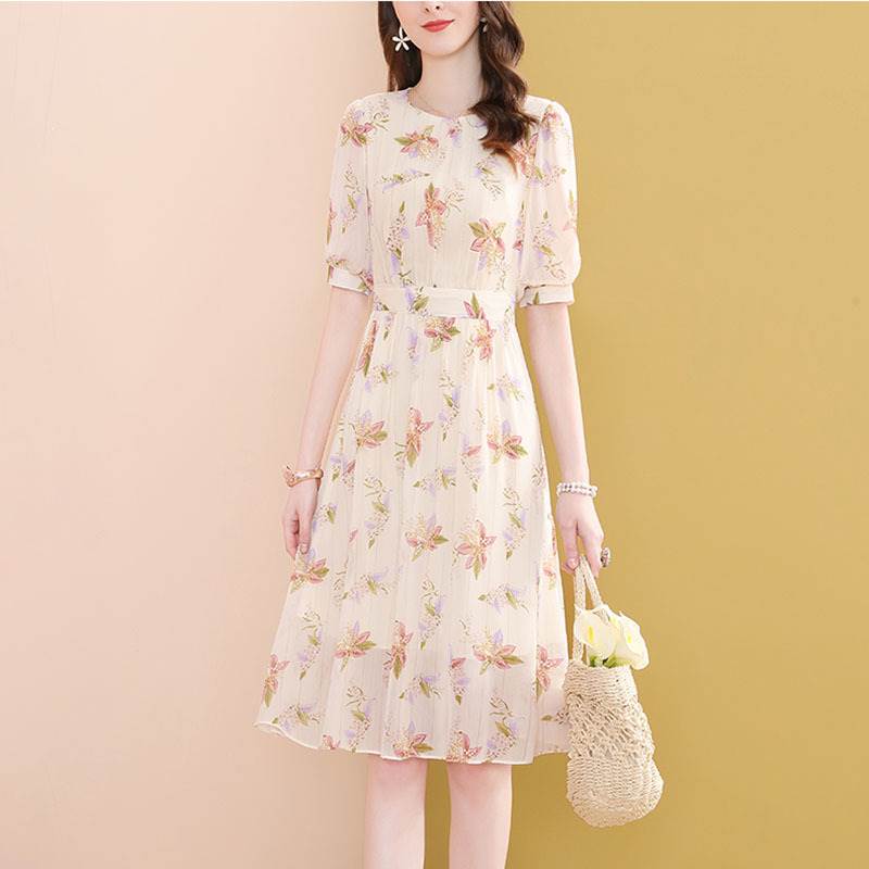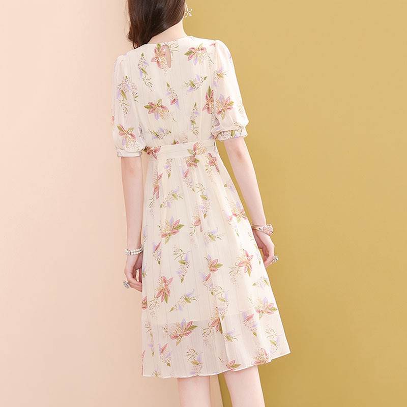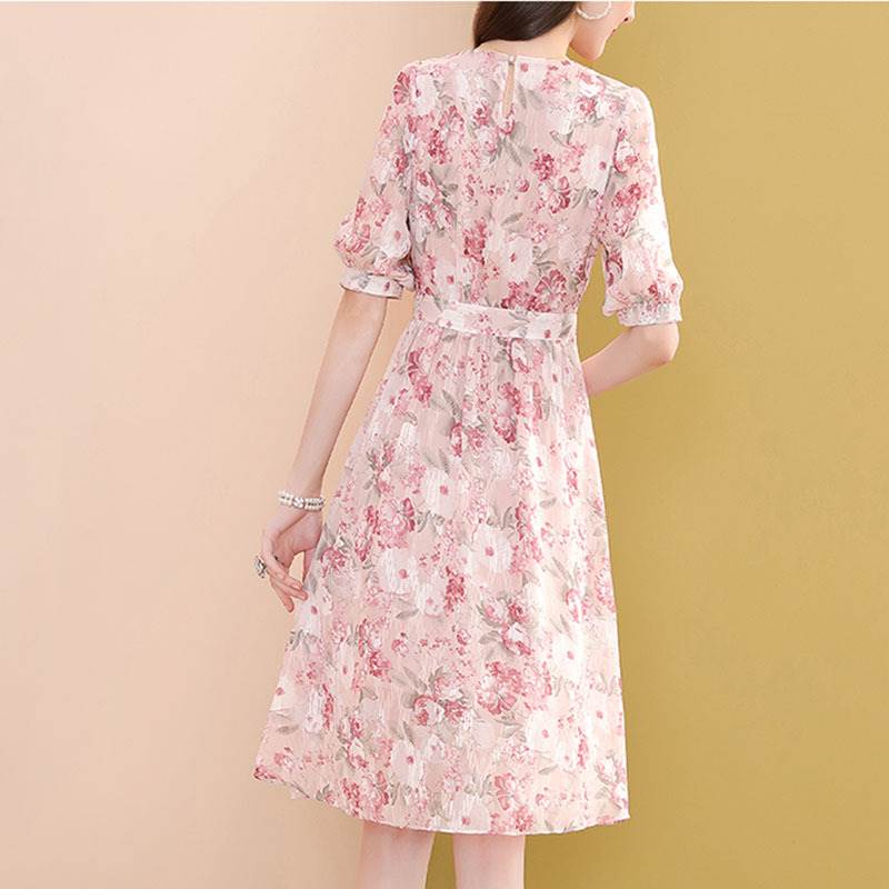 ワンピース レディース 花柄 フラワー きれいめ かわいい おしゃれ 膝丈 エレガント 顔合わせ 細見え 産後 Aライン 発表会 ふわふわ フォーマル ミドル丈 半袖 クルーネック