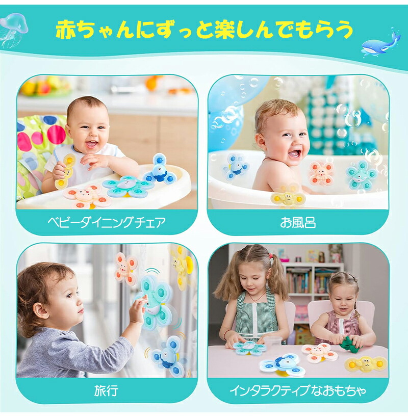 親子のインタラクティブ: 回転する風車は、子供たちの注意を引き付け、ゲームに子供たちの興味を喚起し、子供たちの感情的な圧力を軽減することができます。吸盤付きハイチェアおもちゃは、食事中、入浴中、睡眠中などに泣いている赤ちゃんに役立ちます。