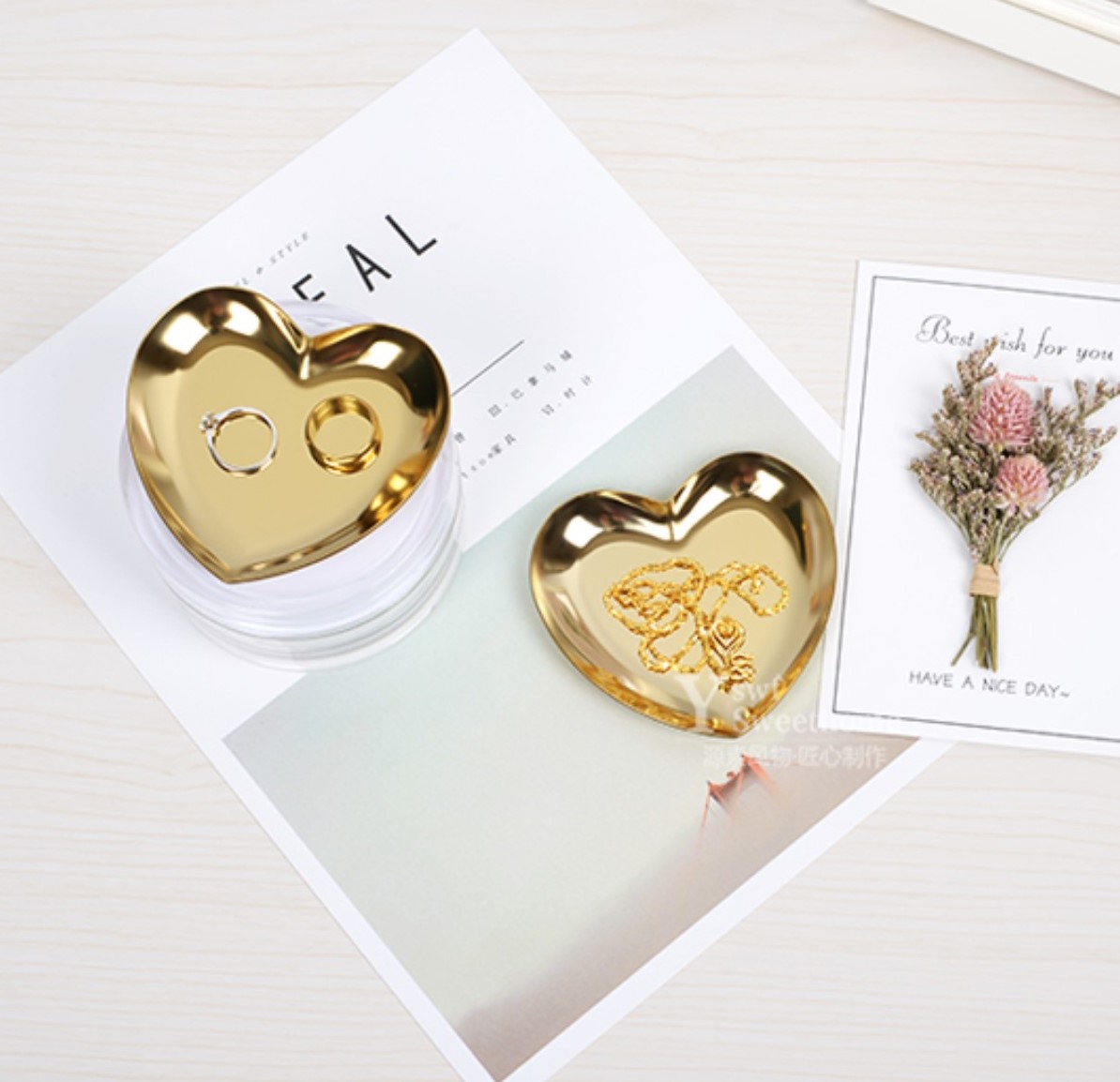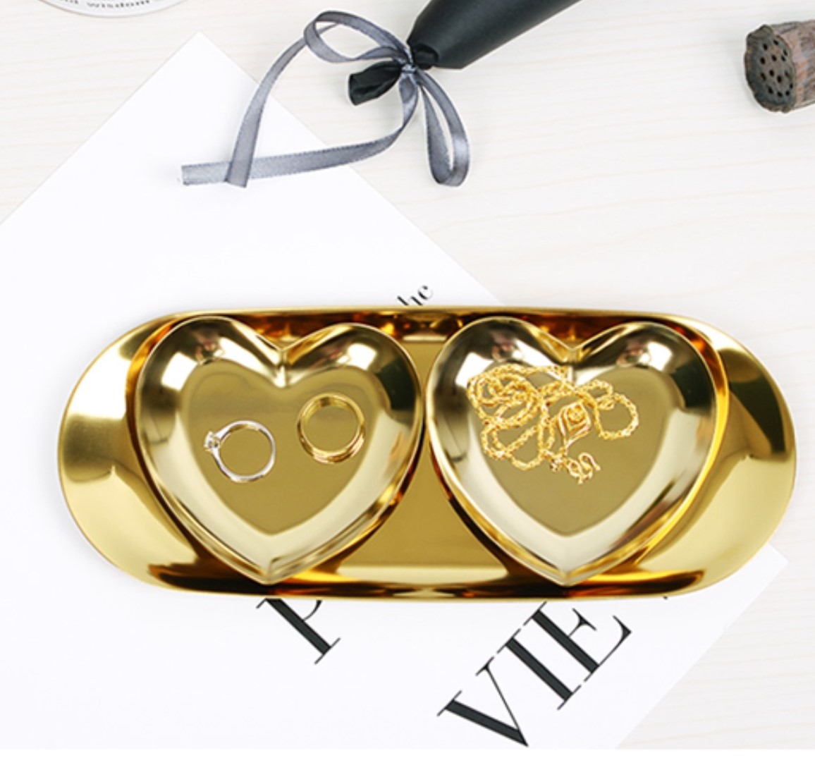 2点セットハートプレートゴールド韓国雑貨北欧インテリアディスプレイアンティークセット可愛いおしゃれ収納小物入れアクセサリー小さい小さめ整理ケース卓上割れないステンレス トレイレトロ時計鍵