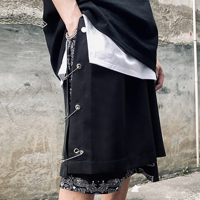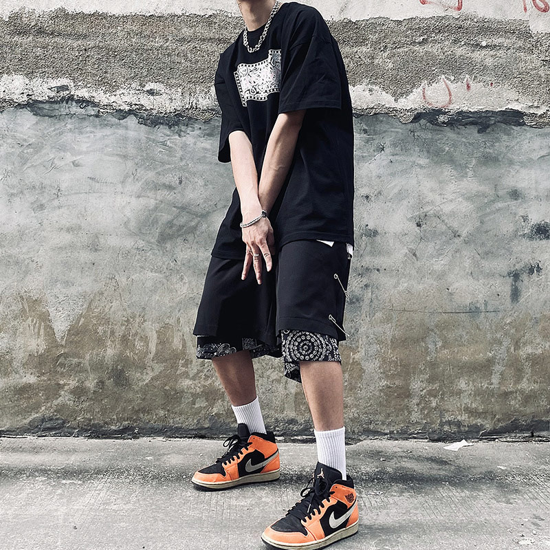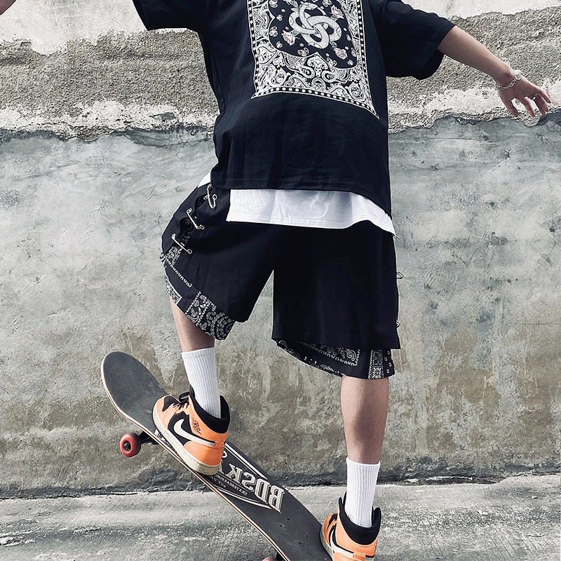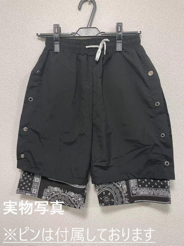 シルバーピン付 ペイズリー ハーフパンツ ズボン ボトムス パンツ ジャージ 半ズボン 黒 ブラック ゴム ハイウエスト ひざ丈 膝上 ワイド ゆったり 大きいサイズ ダンス 衣装 ヒップホップ HIPHOP メンズ レディース ストリート 奇抜 派手 個性的