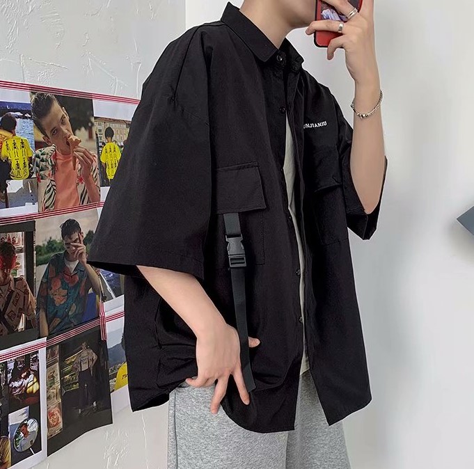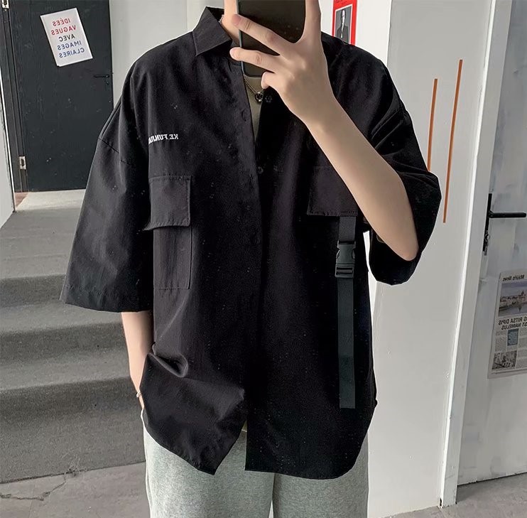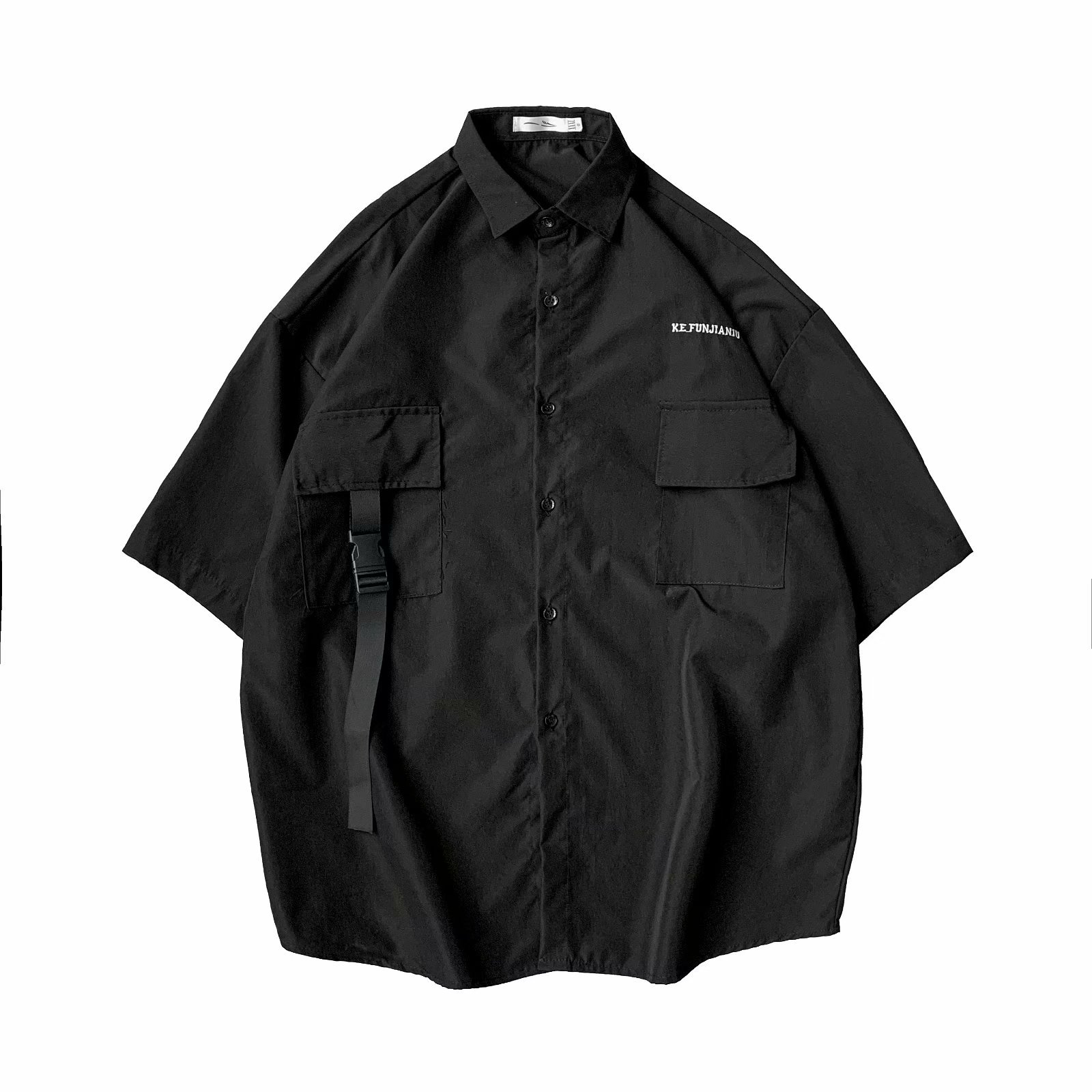 ロゴ ベルト シャツ 半袖 五分袖 トップス カットソー ブラウス 前開き ボタン 黒 ブラック 無地 シンプル ダンス 衣装 ヒップホップ HIPHOP レディース メンズ ガールズ 羽織 服 上 ストリート 大きい ビッグ ポケット かっこいい 韓国 奇抜