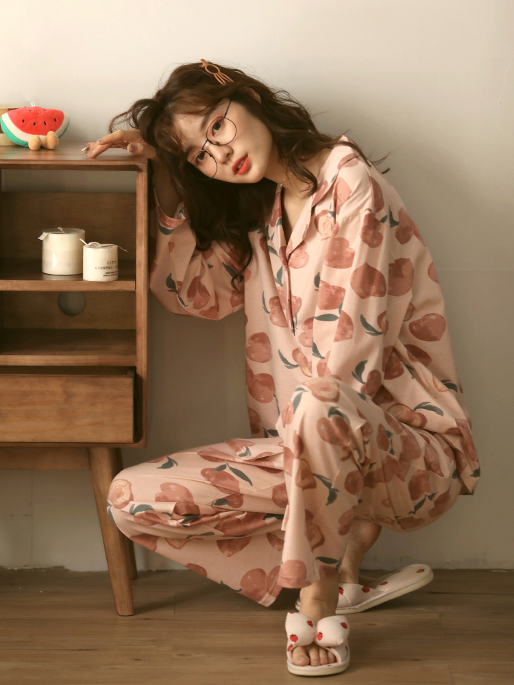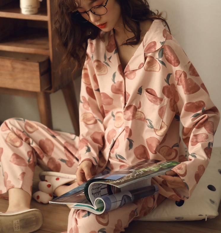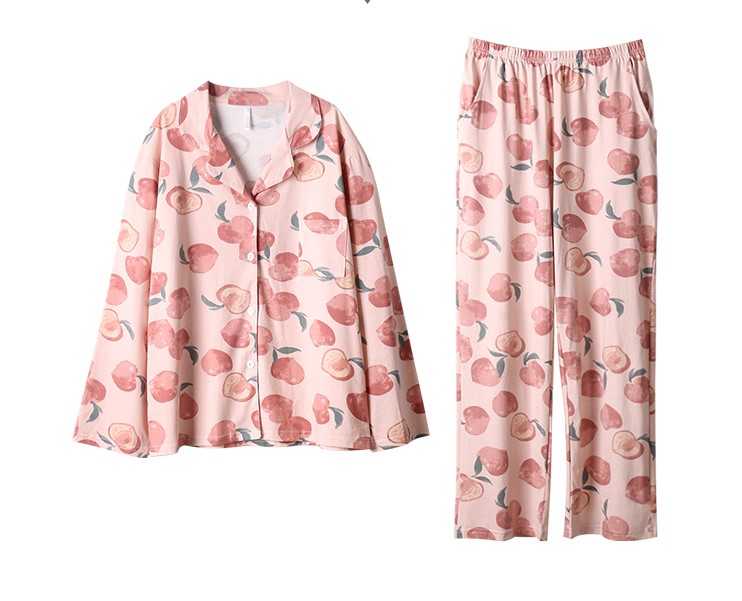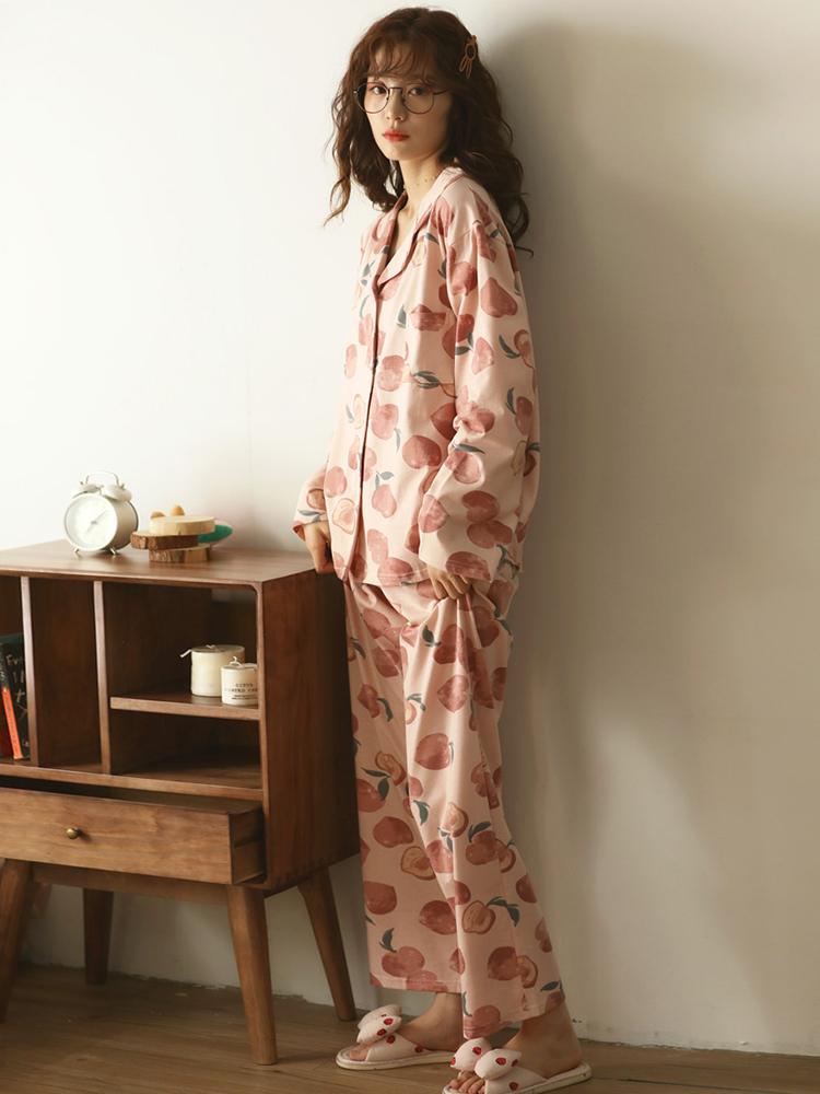 上下セット 桃 ピーチ 柄 パジャマ ルームウェア レディース ガールズ 長袖 長ズボン ピンク 韓国 おしゃれ 可愛い コットン 綿 前開き 部屋着 セットアップ 2点セット 総柄 ゴム ロング ストレート セット