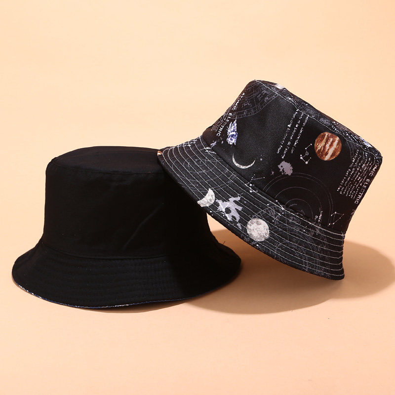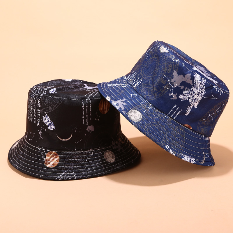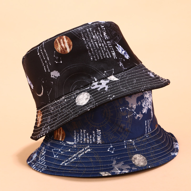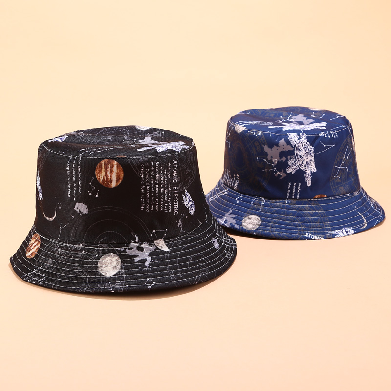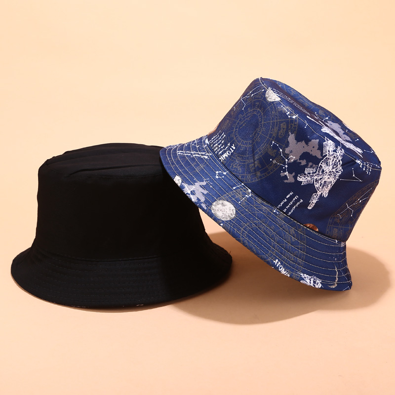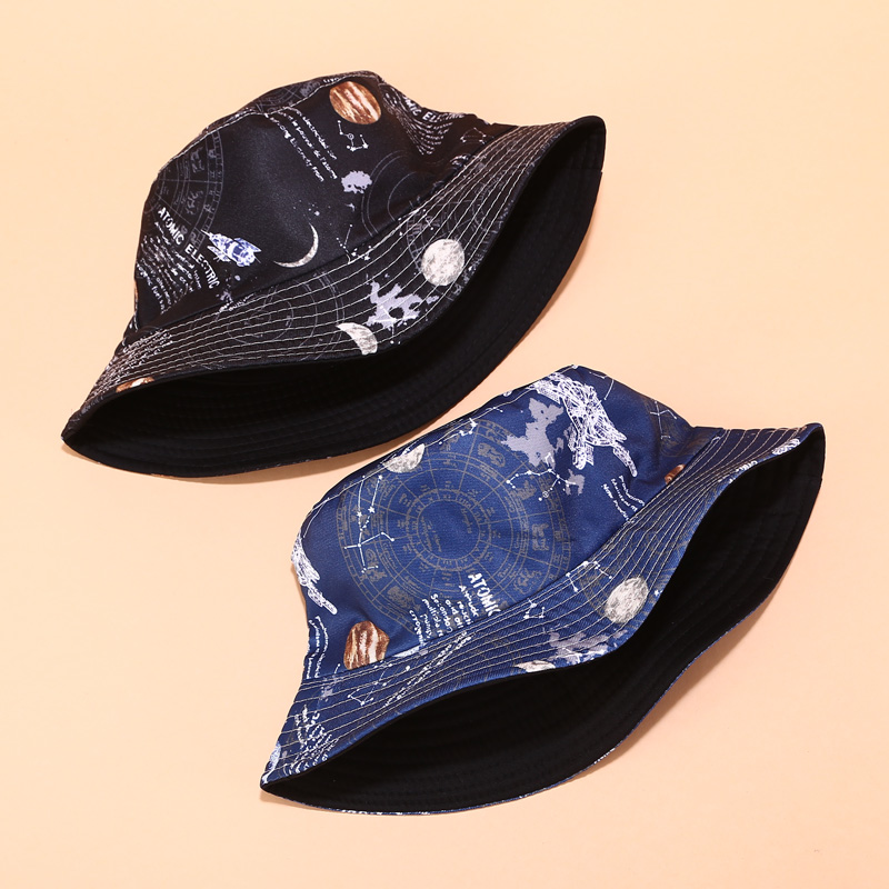 2wayバケットハット2色帽子ハットリバーシブルダンス衣装ヒップホップHIPHOPレディースメンズガールズストリート個性的奇抜派手総柄宇宙デザイン地図青ブルー黒ブラックシンプル韓国おしゃれかっこいい