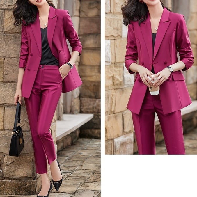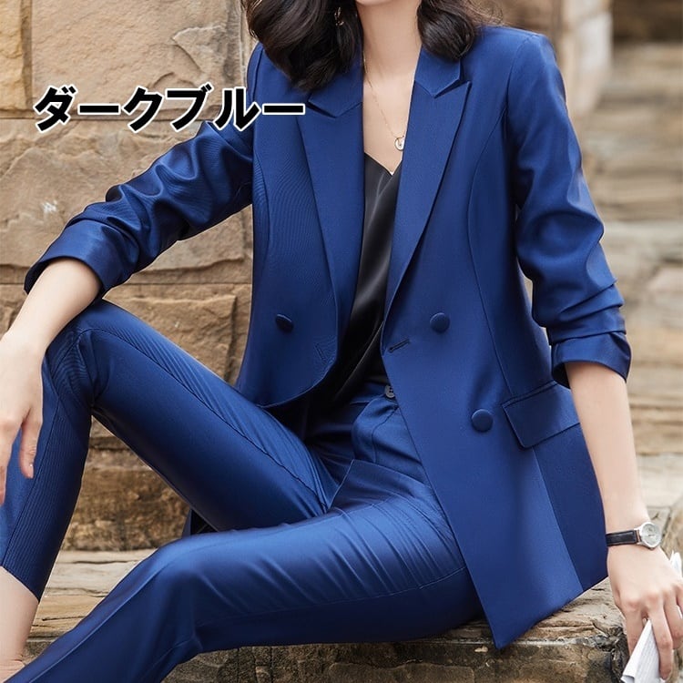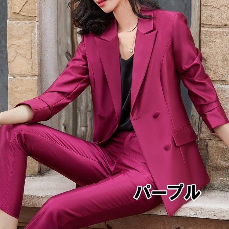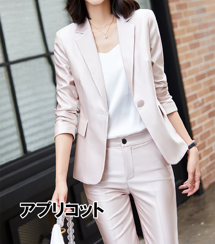 セットアップ ジャケット 上着 スーツ ロング丈 袖あり サテン調 ツヤ感 長袖 スラックス センタープレス スリム アンクルパンツ タイト 上下セット 2点セット ツーピース かわいい