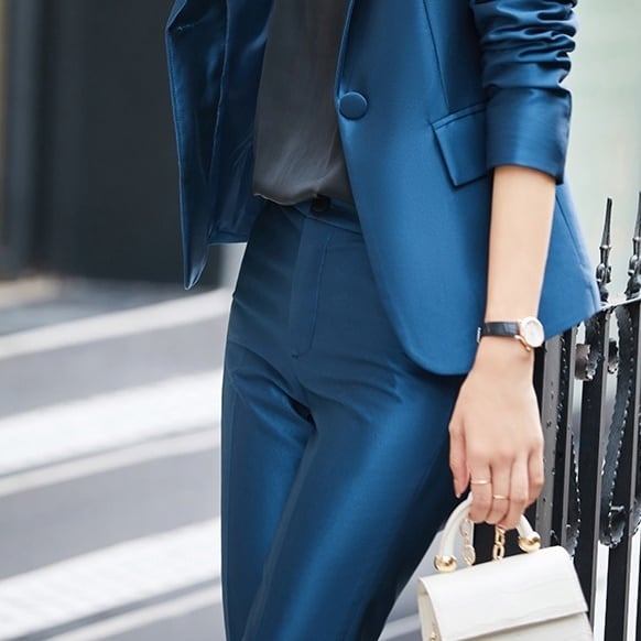 サテン調の控えめなツヤ感のジャケットとパンツのセットアップです。