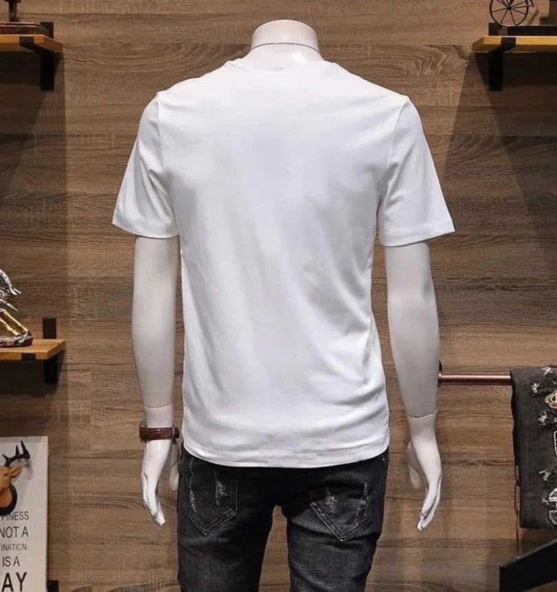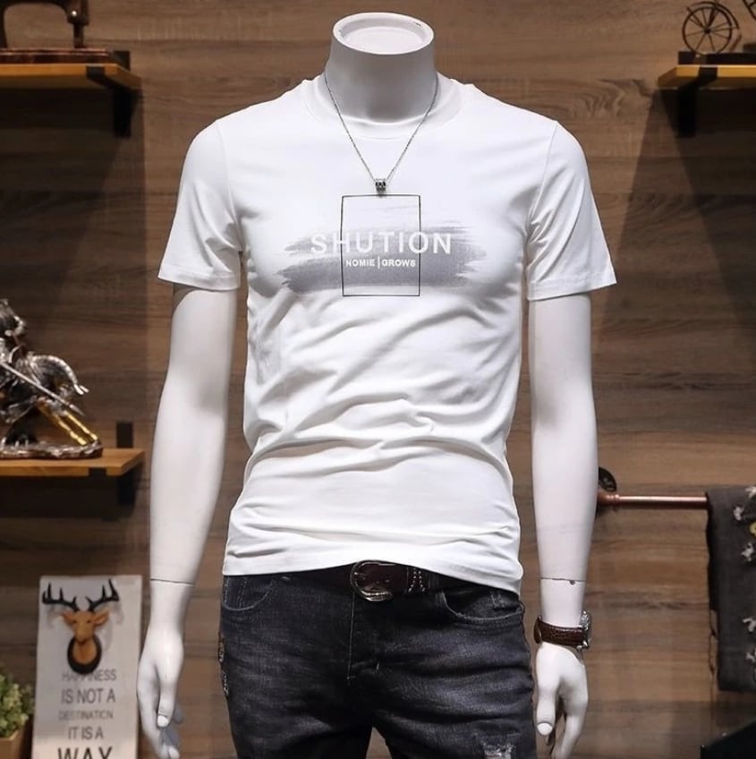 胸元のモノトーンプリントがクールな半袖Tシャツ。