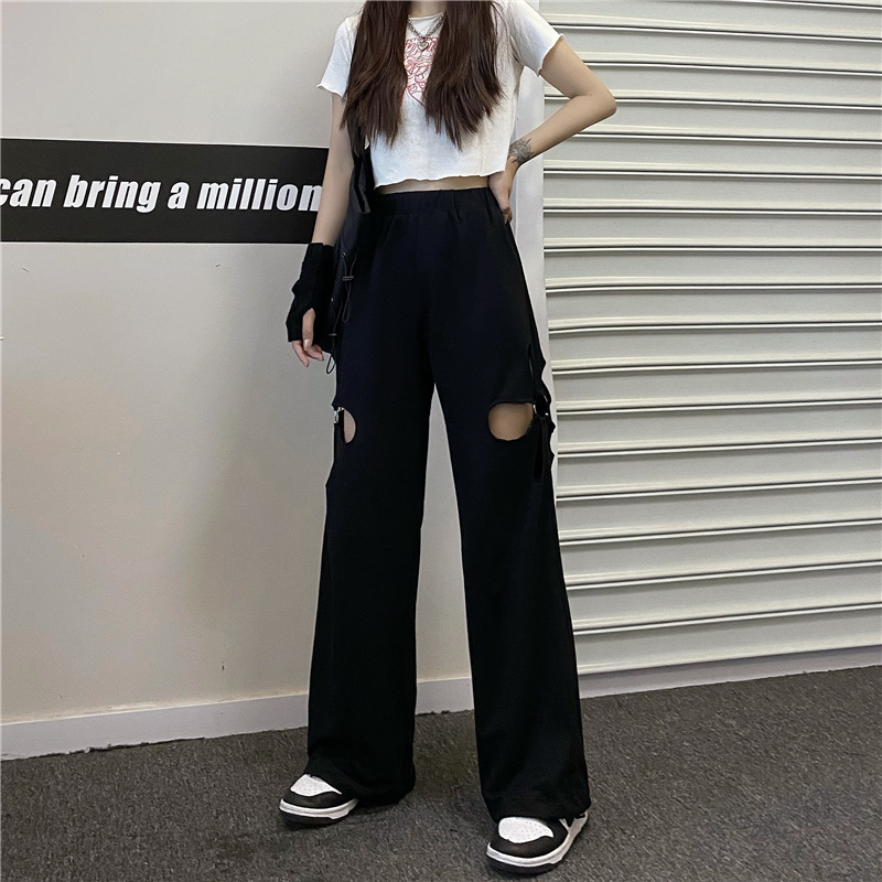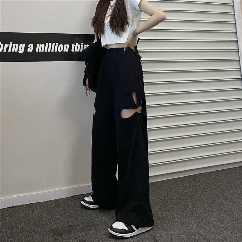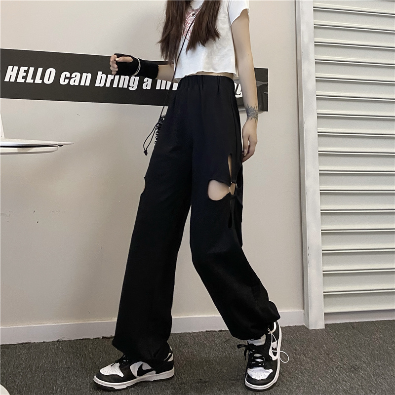 フラワー 穴あき パンツ ズボン ボトムス ジャージ スウェット 黒 ブラック 無地 シンプル ハイウエスト ゴム ロング ストレート ワイド ジョガーパンツ ダンス 衣装 ヒップホップ HIPHOP レディース ガールズ ストリート 韓国 フラワー 花柄