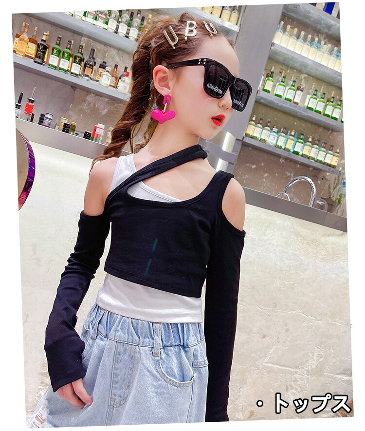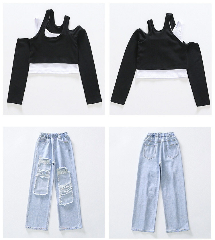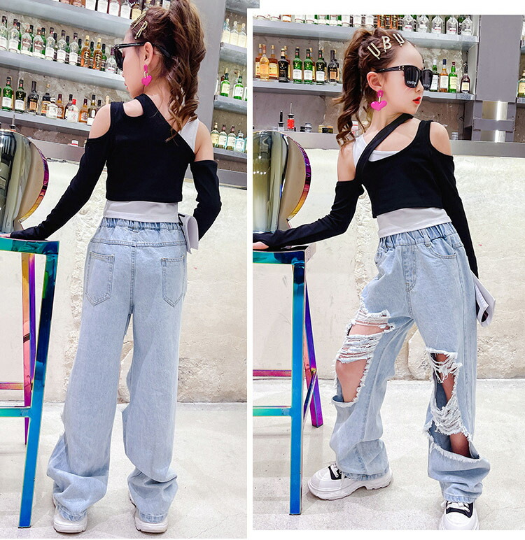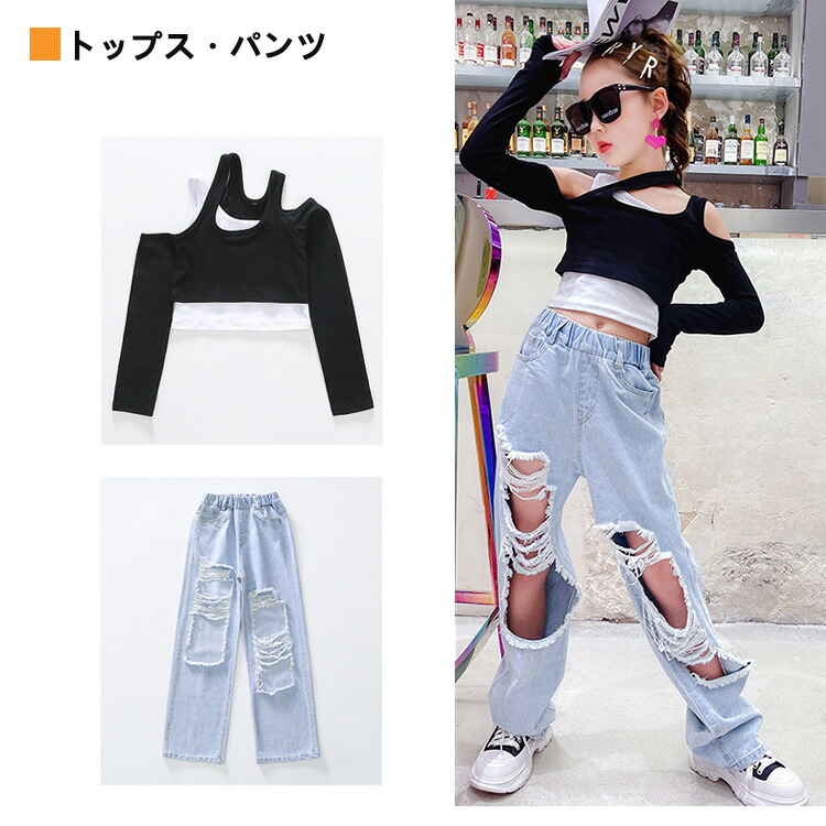 キッズダンス衣装 セットアップ キッズ へそ出し 黒 トップス デニムパンツ ダメージパンツ ジーンズ k-pop衣装 ヒップホップ 肩出し ジャズダンス ヒップホップ 120 130 140 150