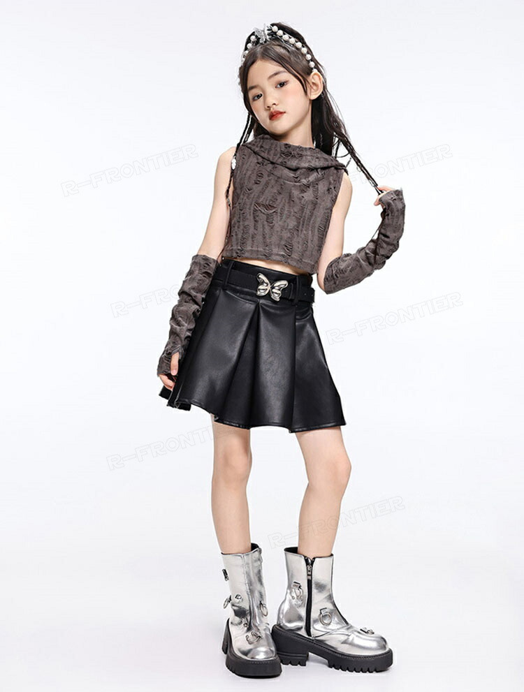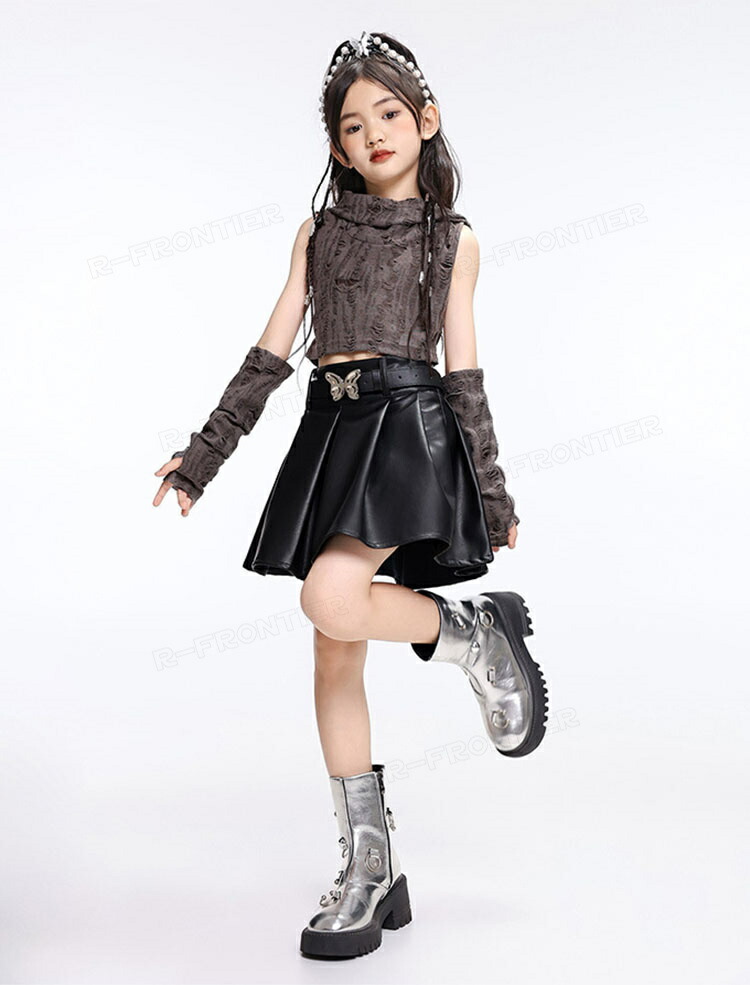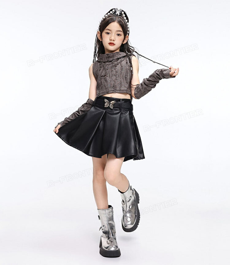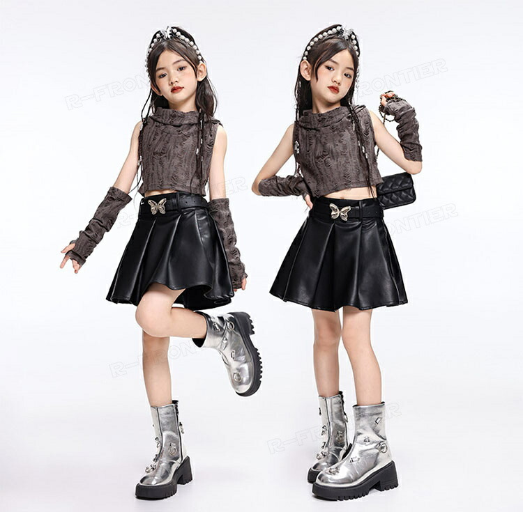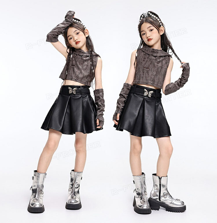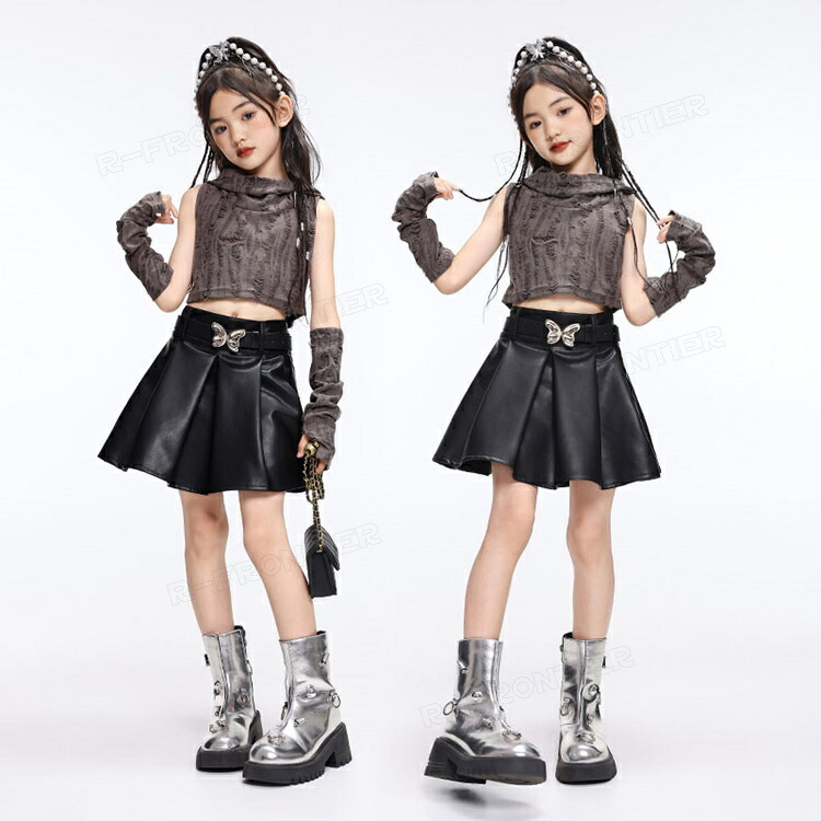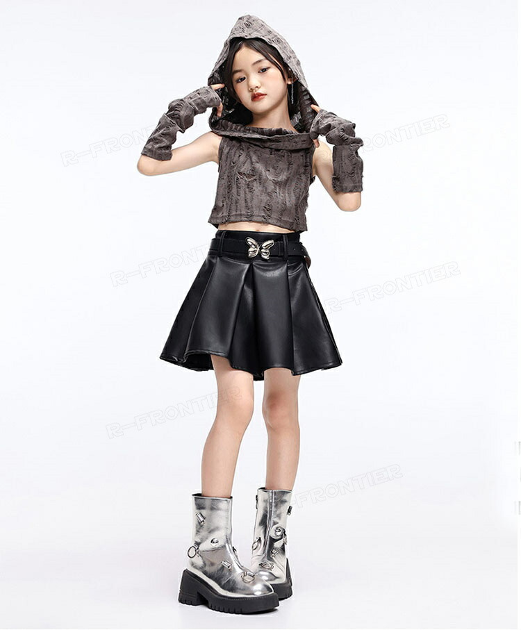 ジャズダンス 衣装 キッズ セットアップ PU スカート へそ出しトップス フード付き ヒップホップ ジャズダンス 女の子 ガールズ 演出服 応援団 ステージ衣装 110-180