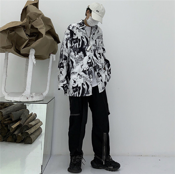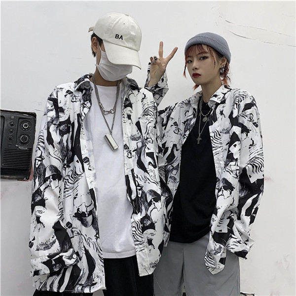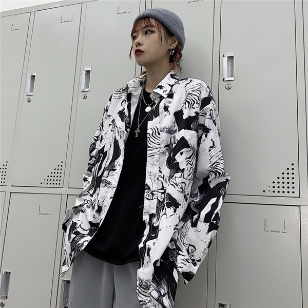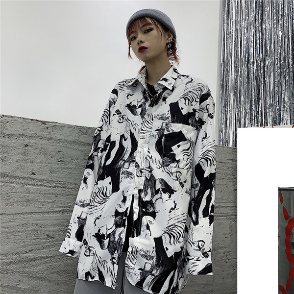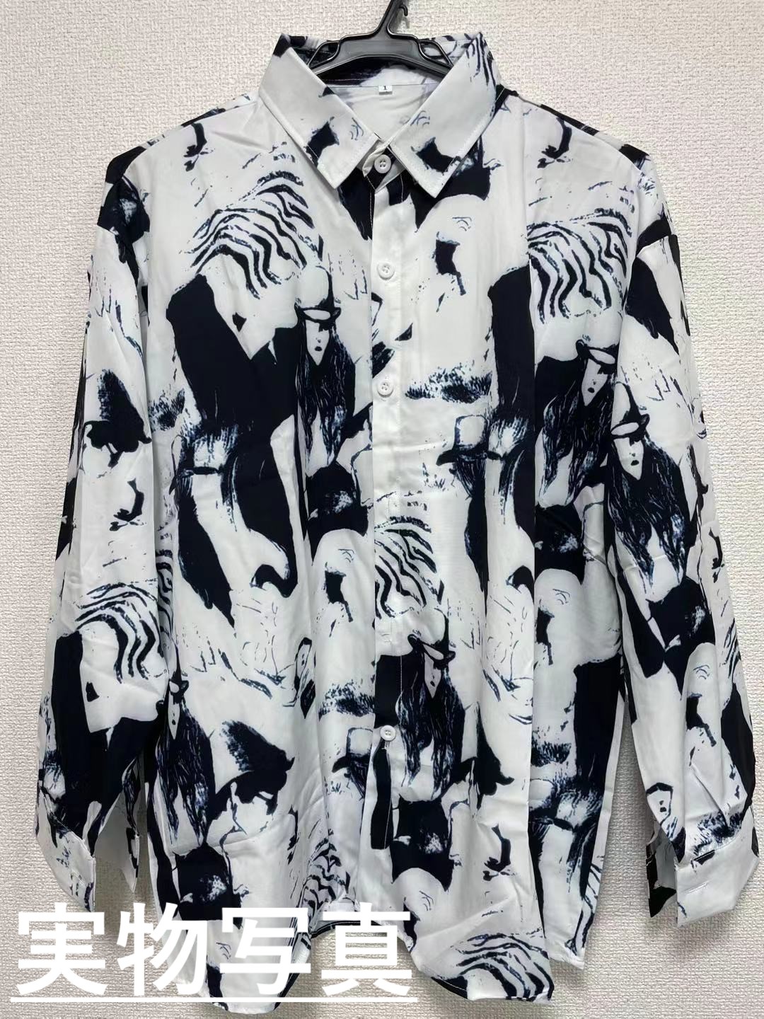 ブラウス シャツ プリント 切り替え バイカラー 配色 体型カバー ヴィンテージ風 レトロ調 原宿系ファッション 韓国風ダンス 衣装 ヒップホップ HIPHOP 個性 奇抜 かわいい 青文字系 トップ