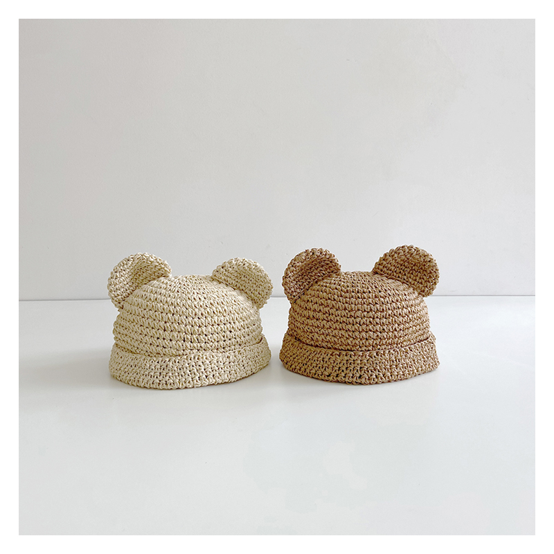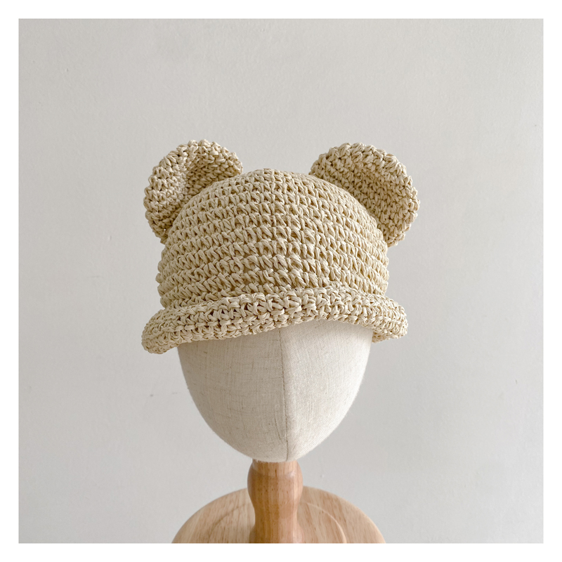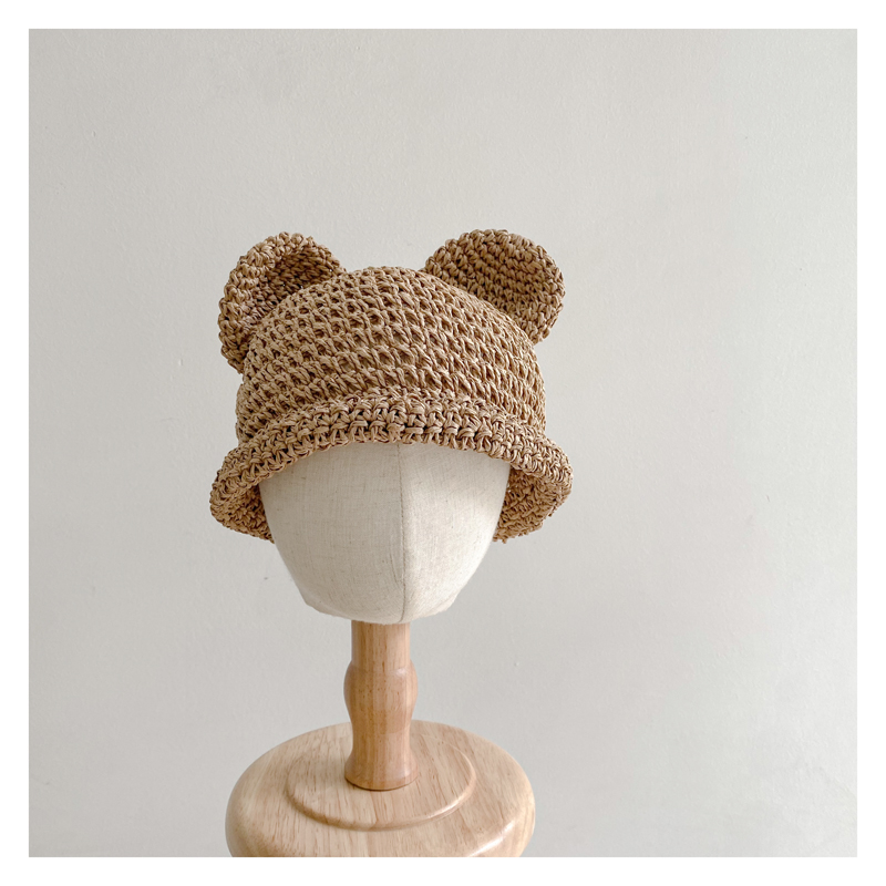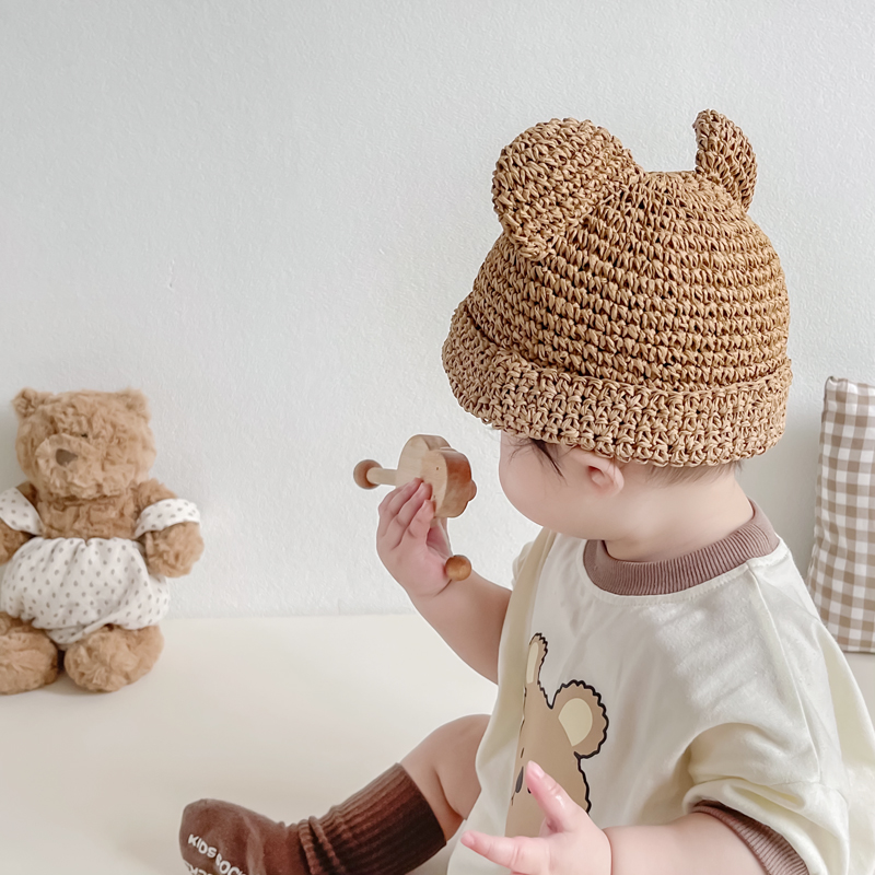 ベビーくま麦わら帽子赤ちゃんベージュブラウンくま耳おしゃれ可愛い韓国0歳~3歳柔らかいキッズ日よけカジュアルナチュラルシンプルプレゼントギフトベビーハット春夏秋ハット無地帽子耳付き