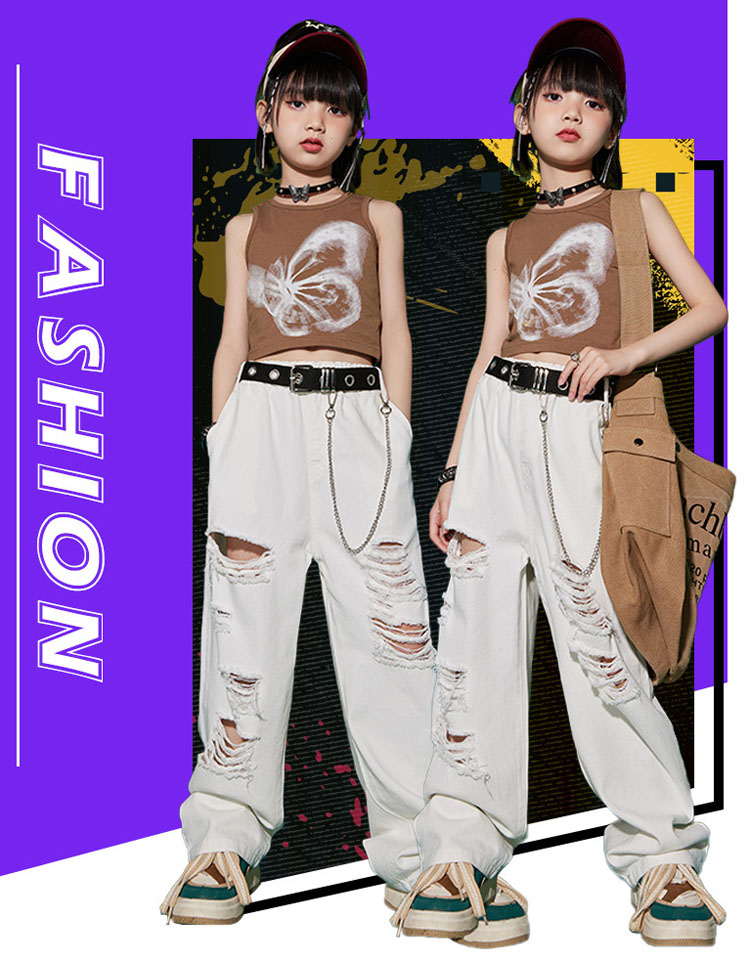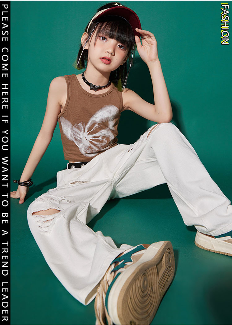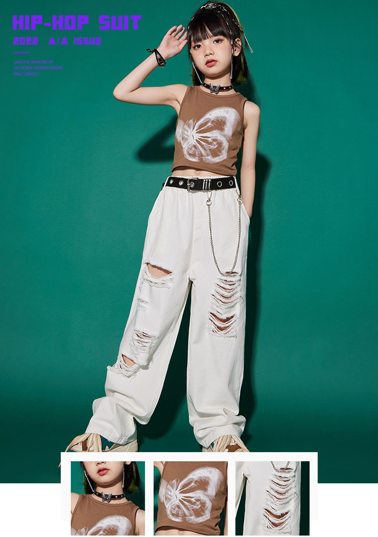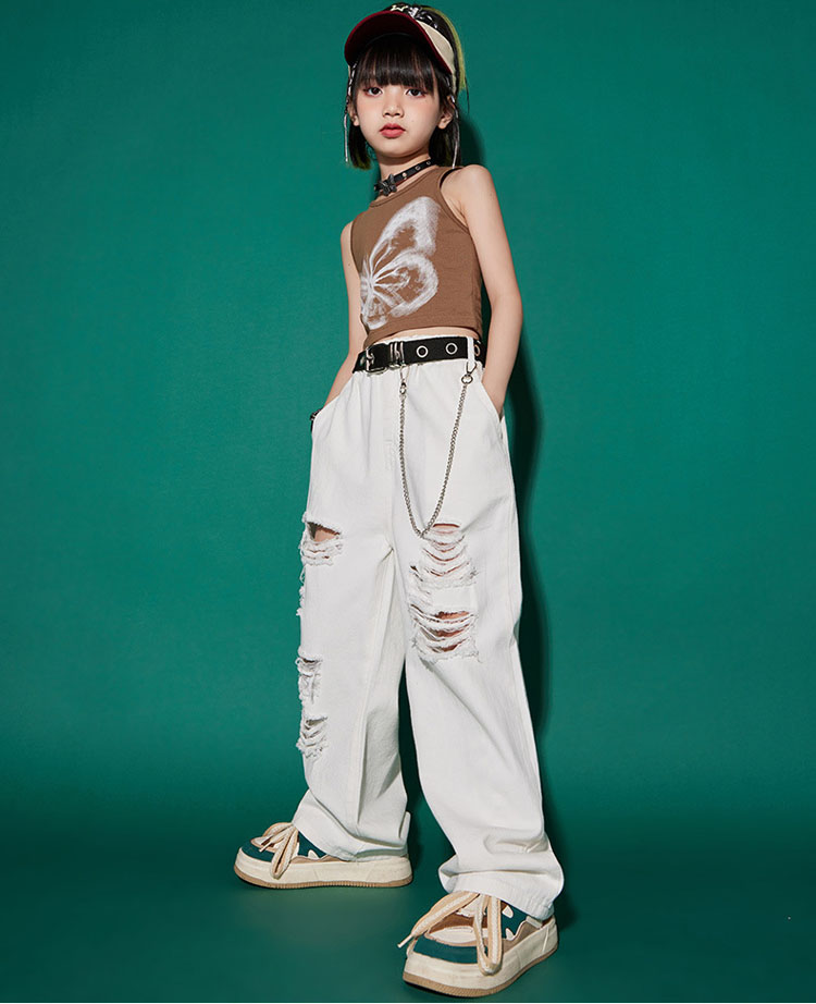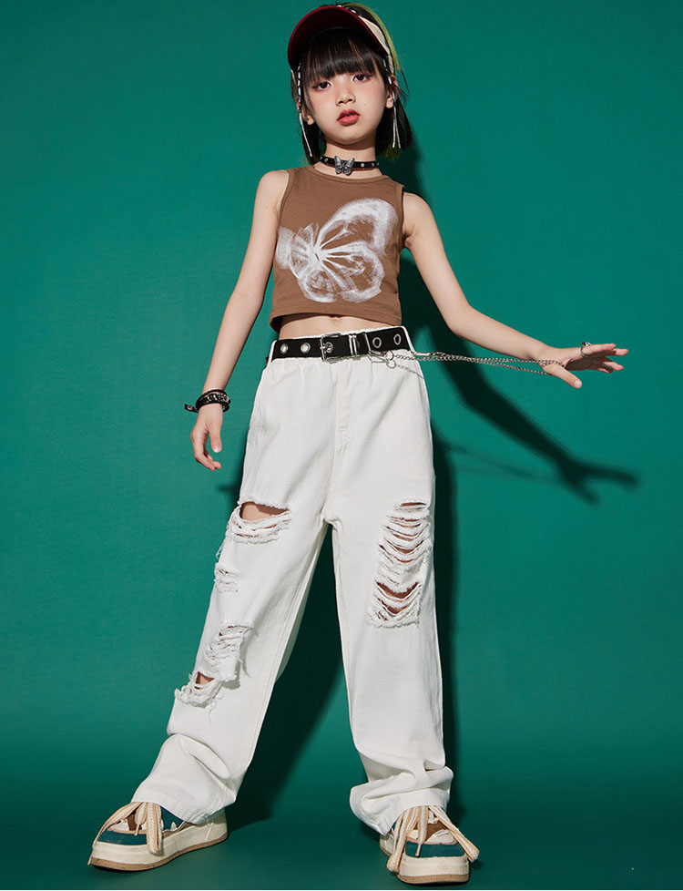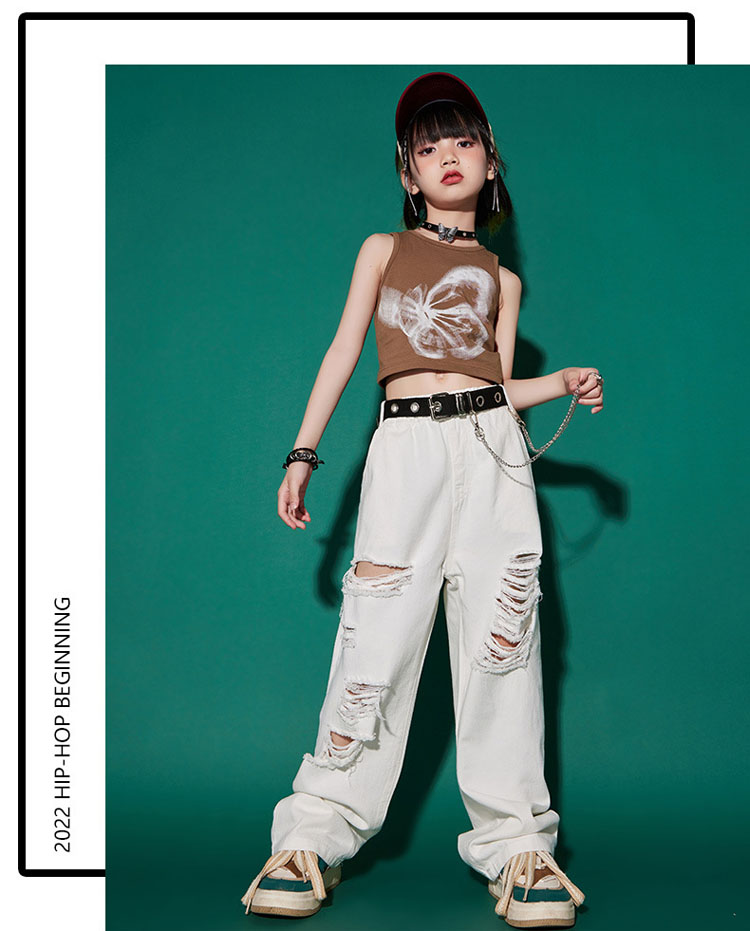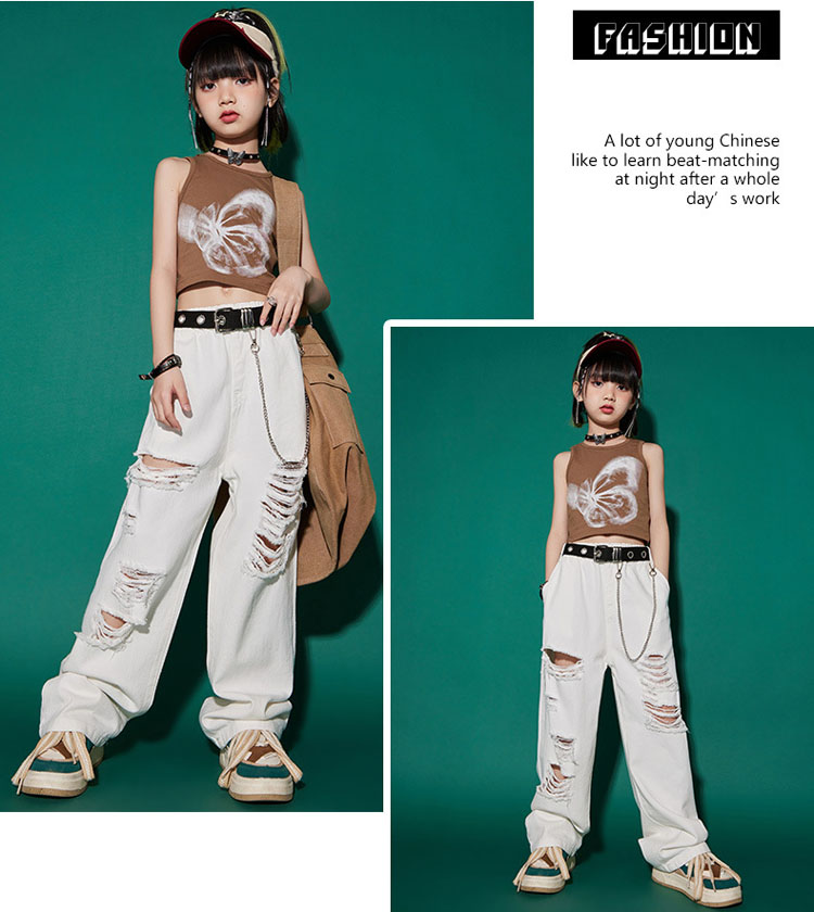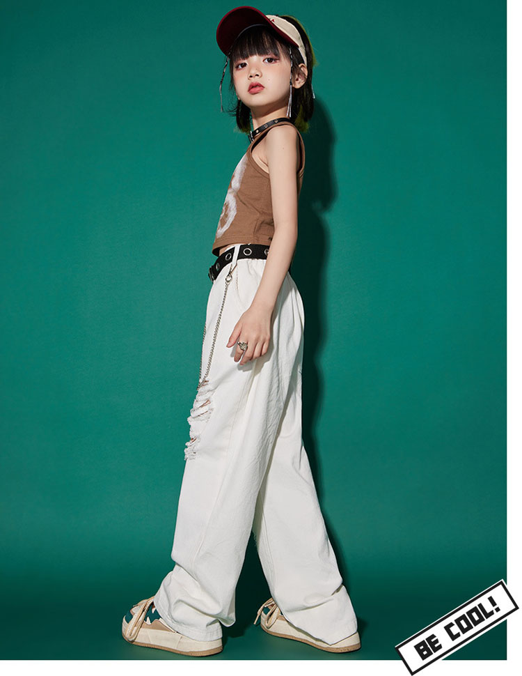 キッズダンス衣装 へそ出し トップス ダンス衣装 カーキトップス デニムパンツ ダメージ パンツ ヒップホップ 団体 HIPHOP ダンス衣装 女の子 イベント 110 120 130 140 150