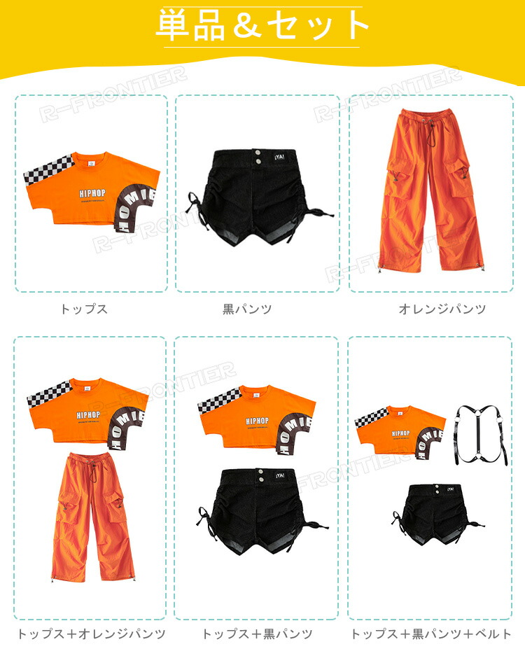 horizontal-key: トップス+黒パンツ トップス+オレンジパンツ トップス+黒パンツ+ベルト トップス 黒パンツ オレンジパンツ