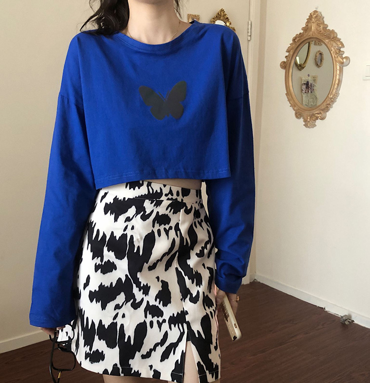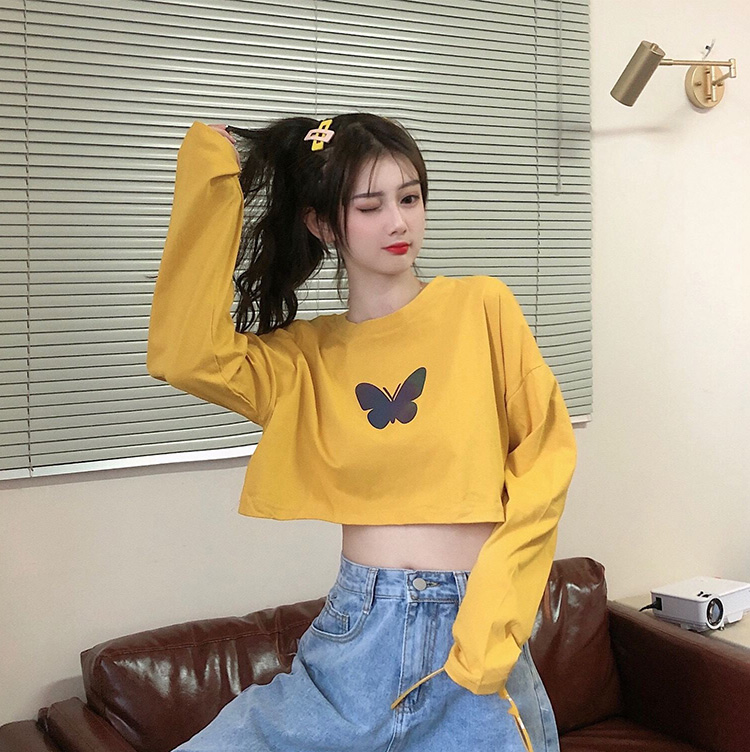 ちょうちょ蝶プリント3色デザイントップスカットソー長袖TシャツロンTホワイト白ブルー青イエローダンス衣装ヒップホップHIPHOPレディースキッズガールズ短めショート丈短いへそ出しセクシーおしゃれ