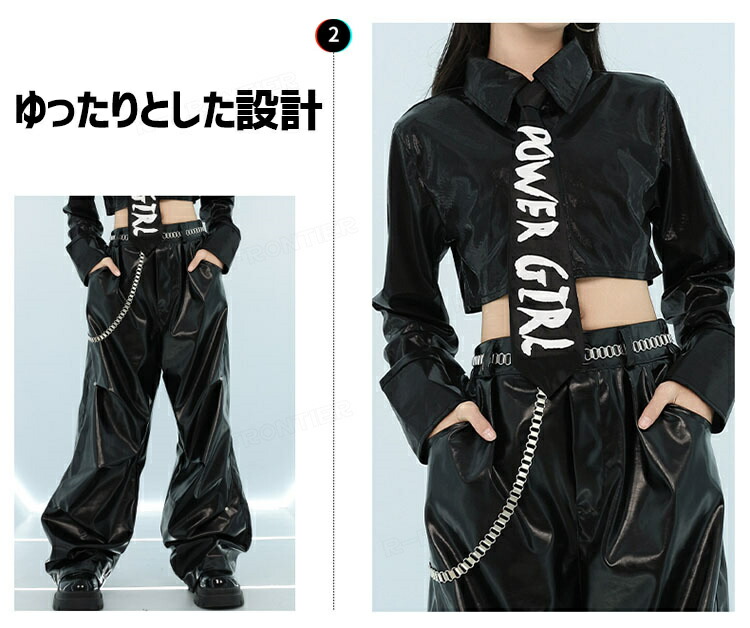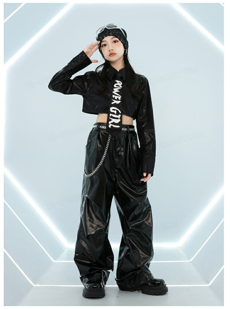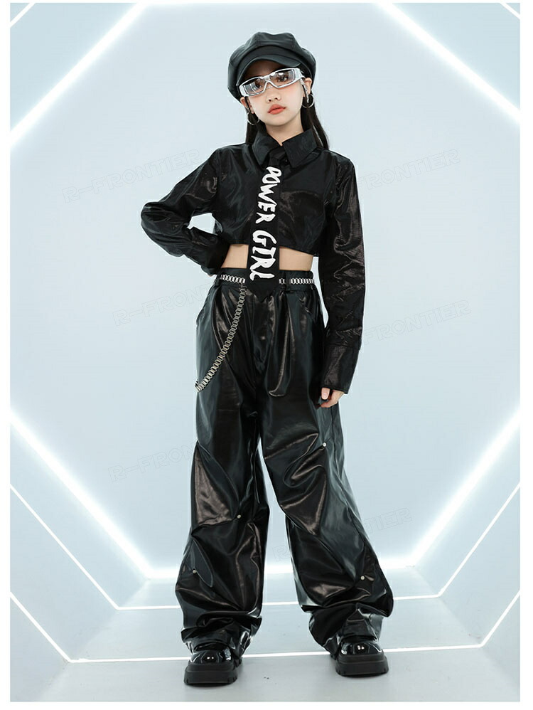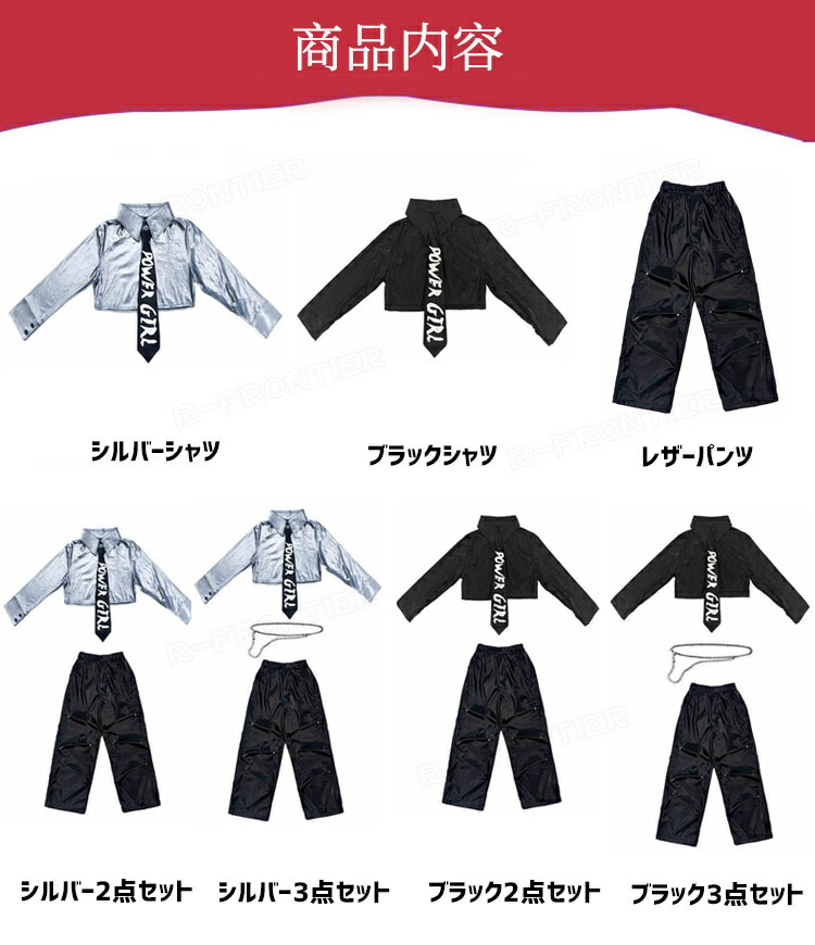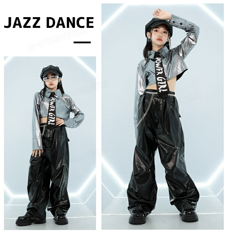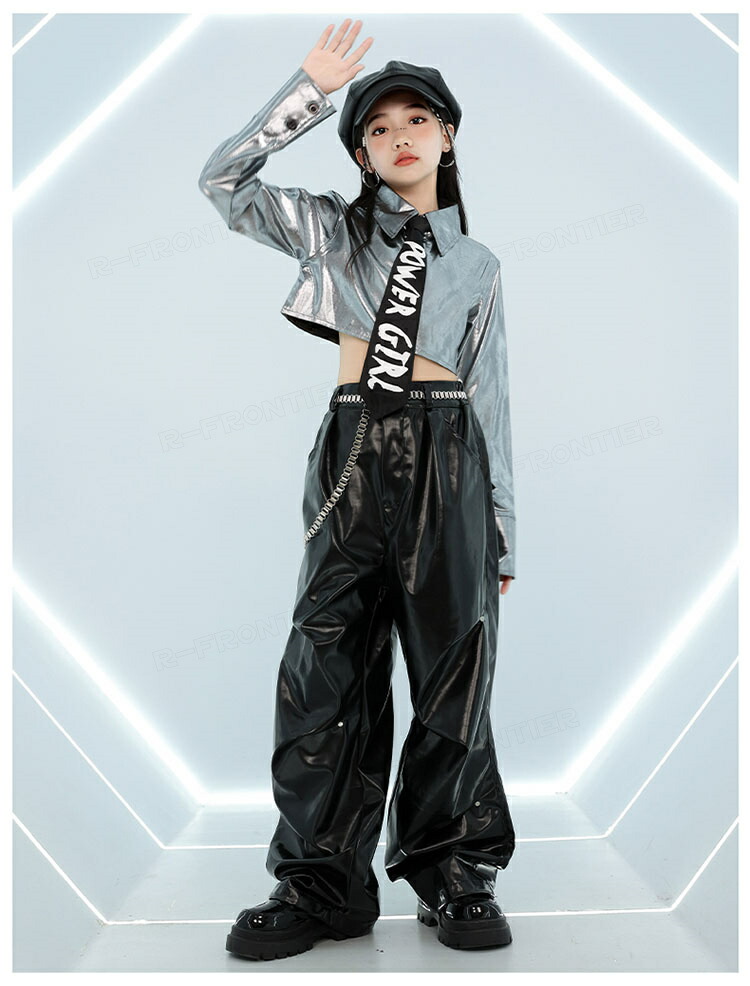 ダンス衣装 キッズ ヒップホップ 女の子 黒 レザーパンツ シルバートップス 黒シャツ 子供 女の子 ステージ衣装 団体服 発表会 演出服 韓国