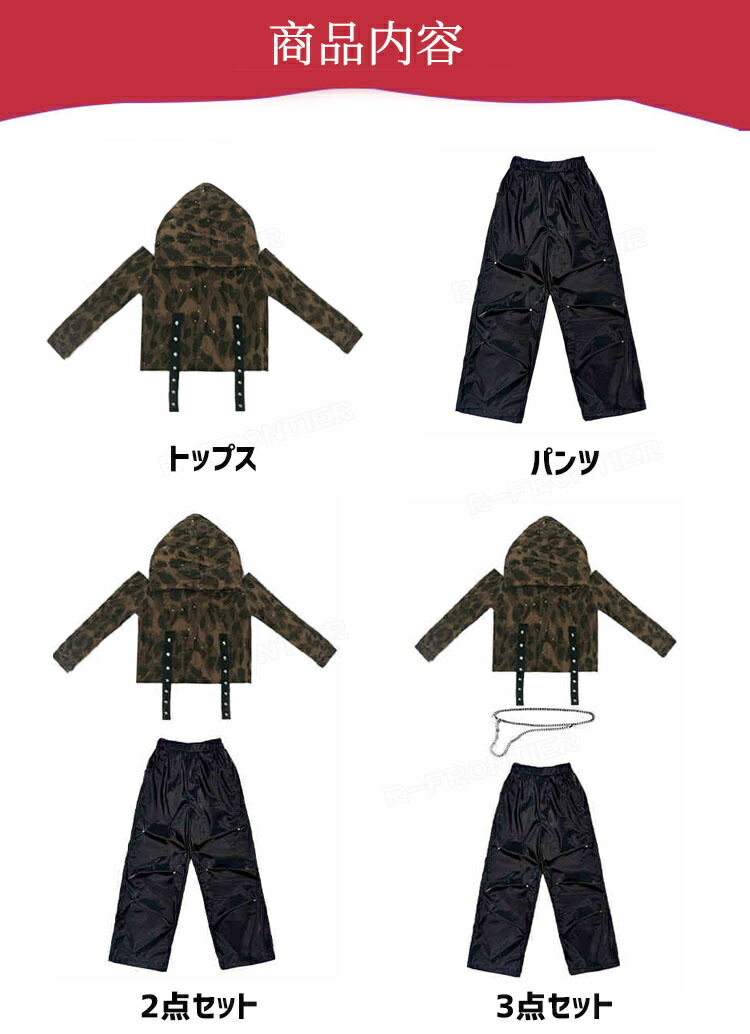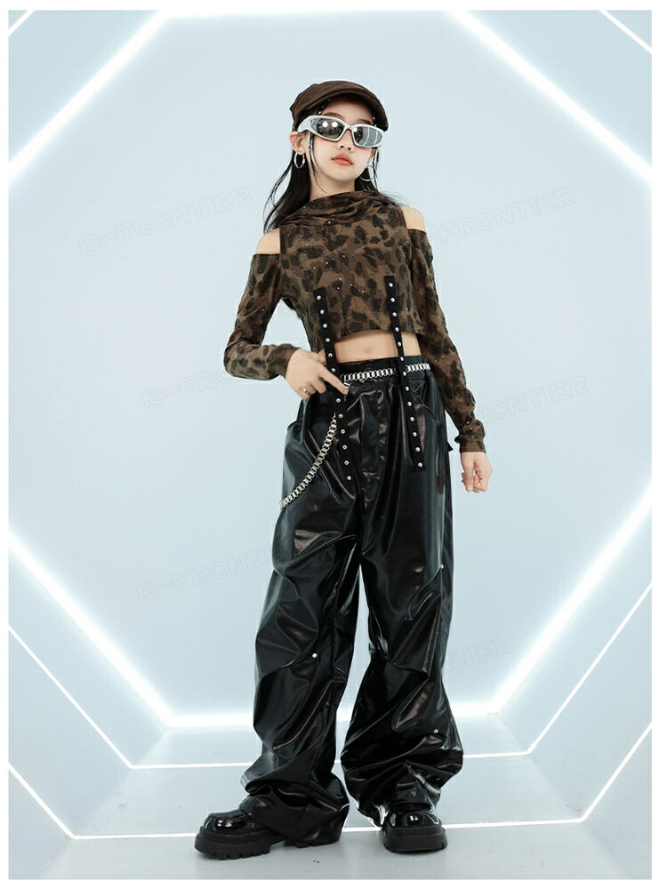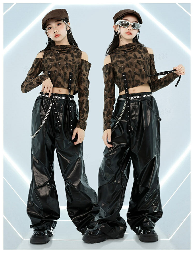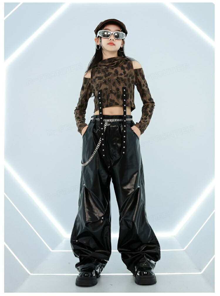 ダンス衣装 キッズ ヒップホップ 女の子 黒 レザーパンツ ヒョウ柄 へそ出しトップス 長ズボン 子供 女の子 ステージ衣装 団体服 発表会 演出服 韓国