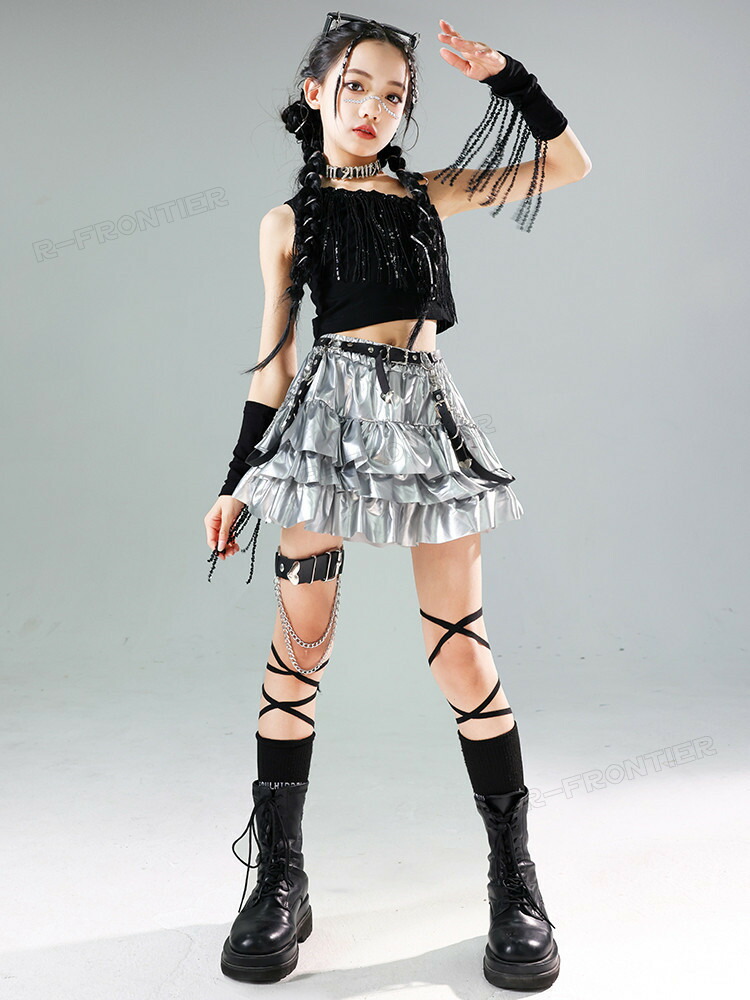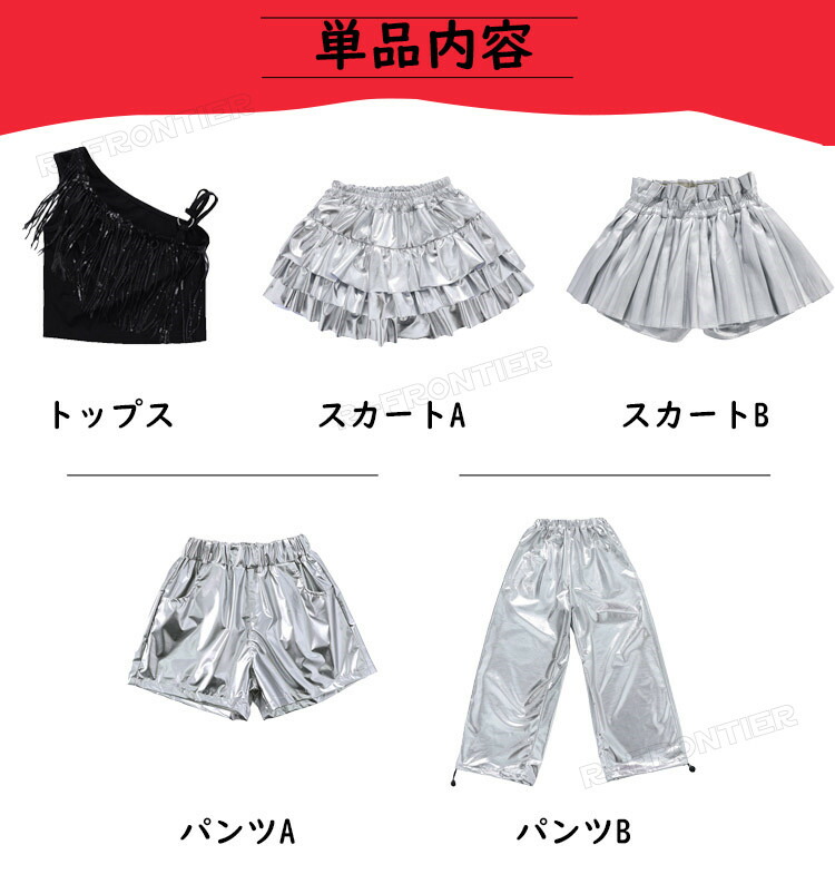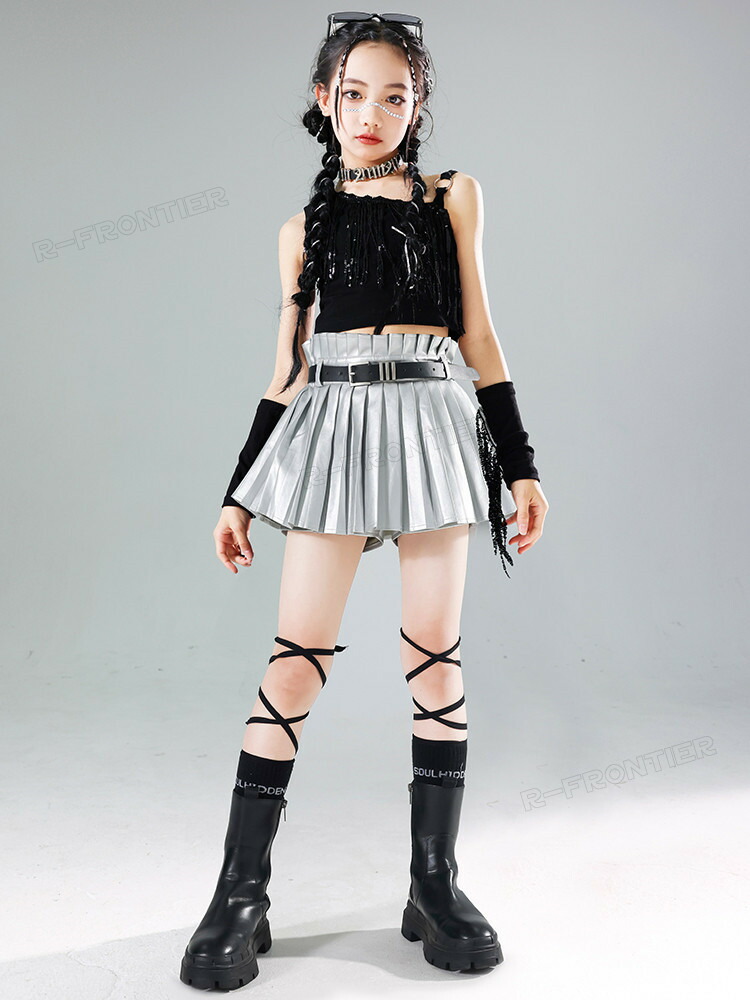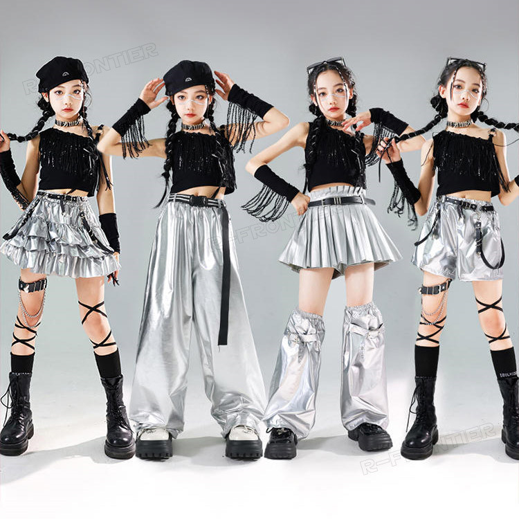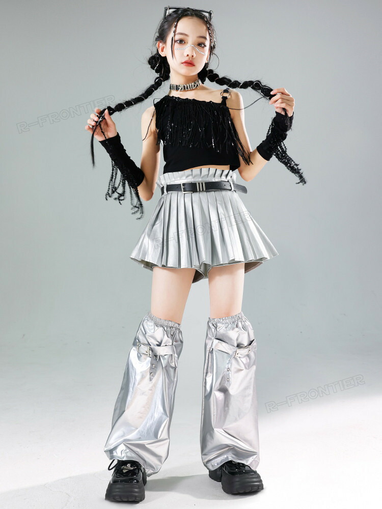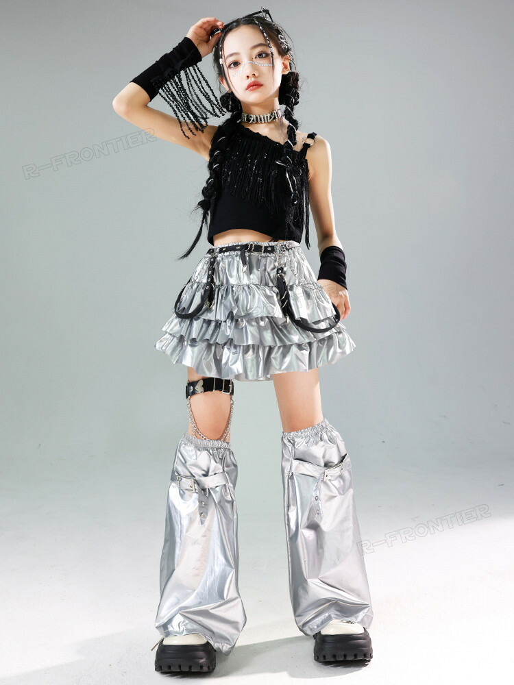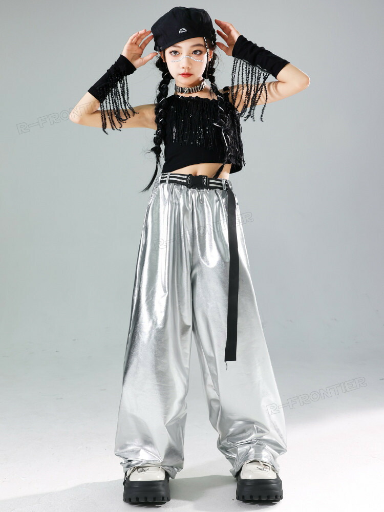 キッズ ダンス衣装 セットアップ 女の子 へそ出し トップス シルバー レザーパンツ かっこいい ヒップホップ ワイドパンツ 韓国 k-pop衣装 チアガール 演出服 応援団 イベント 110-170