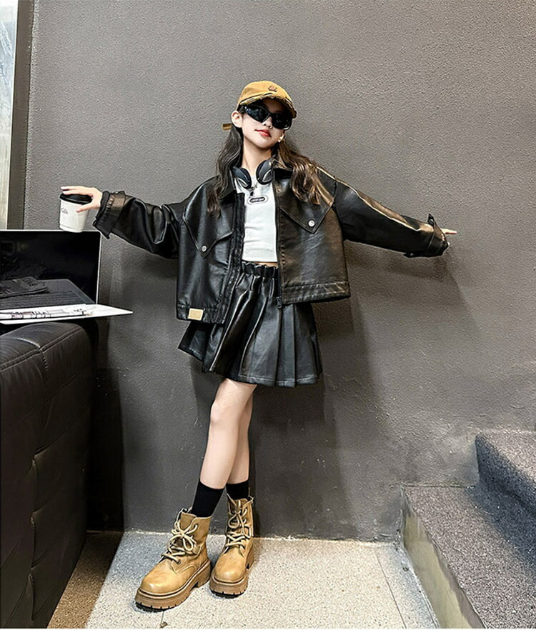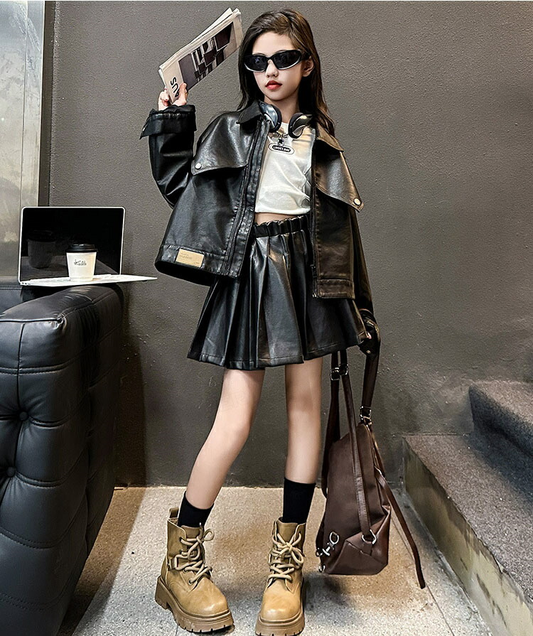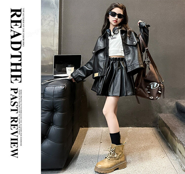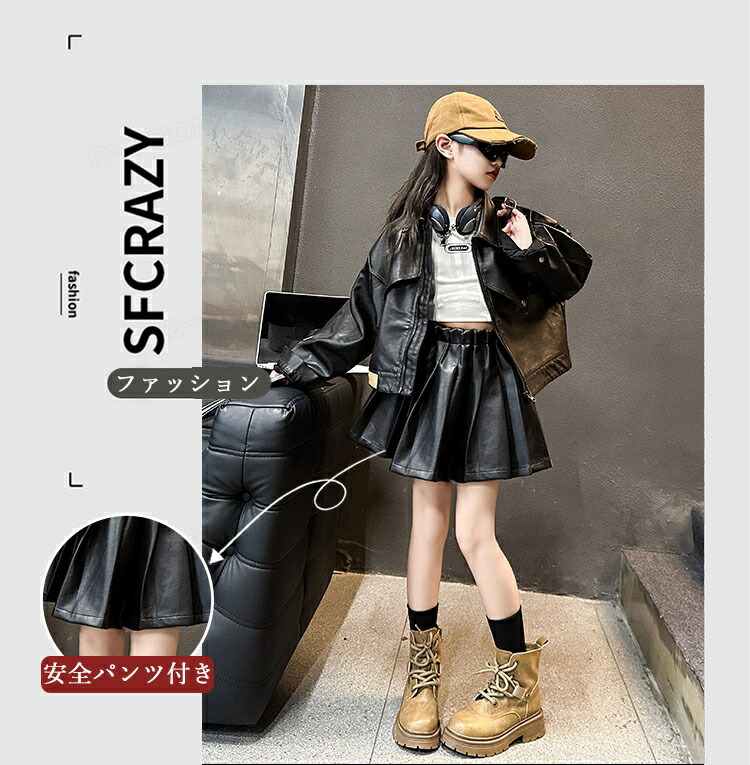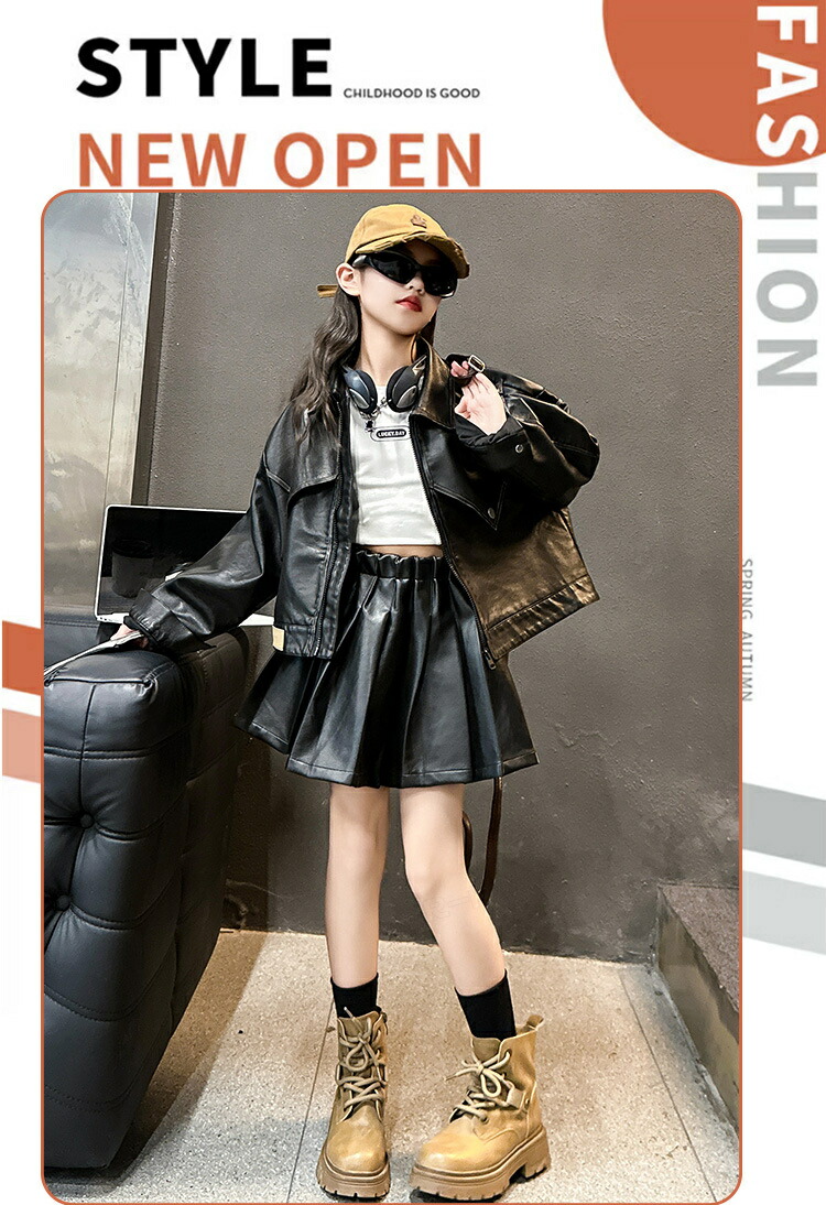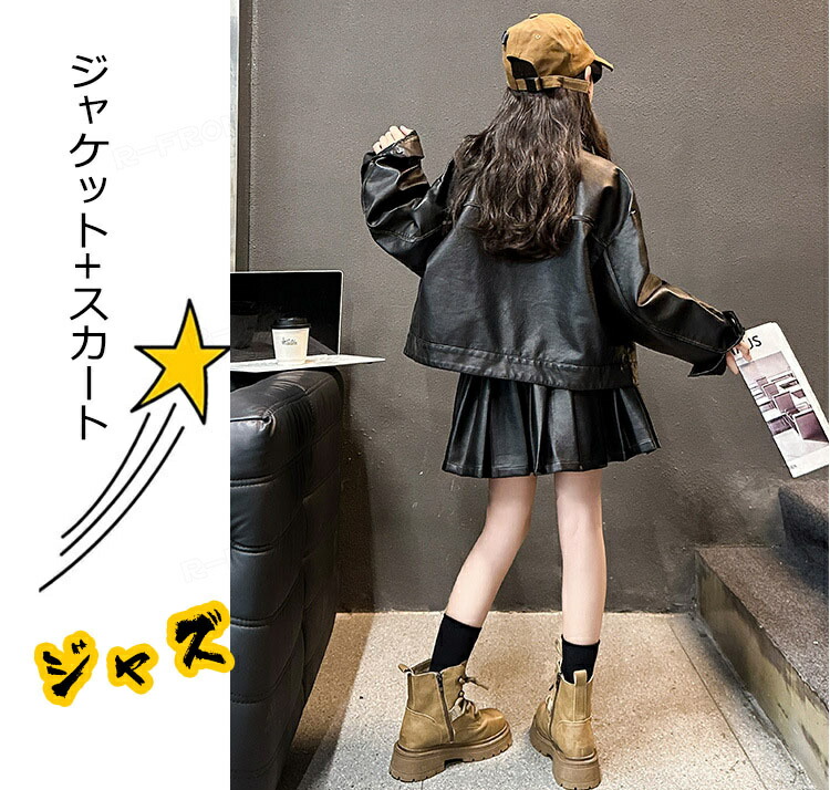 ジャズダンス 衣装 キッズ 女の子 セットアップ PU ジャケット プリーツスカート ヒップホップ ジャズダンス 女の子 ガールズ 演出服 応援団 ステージ衣装 120-170