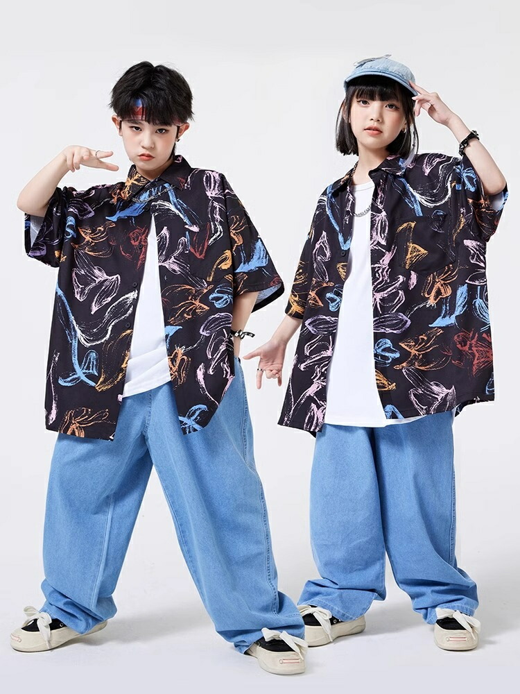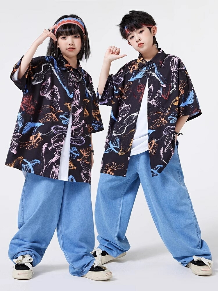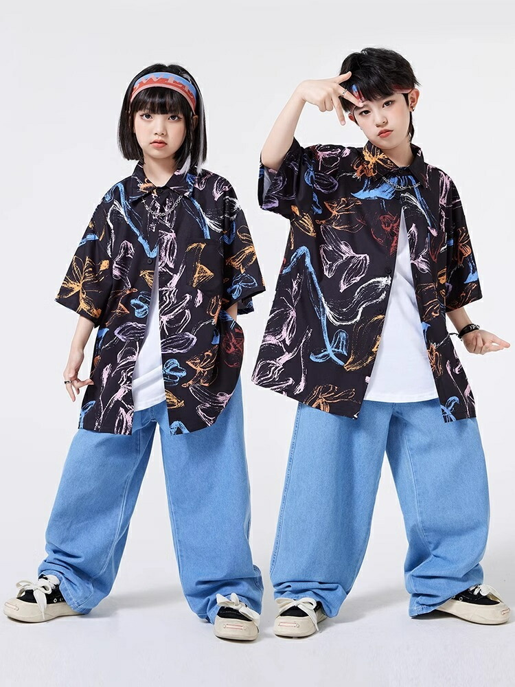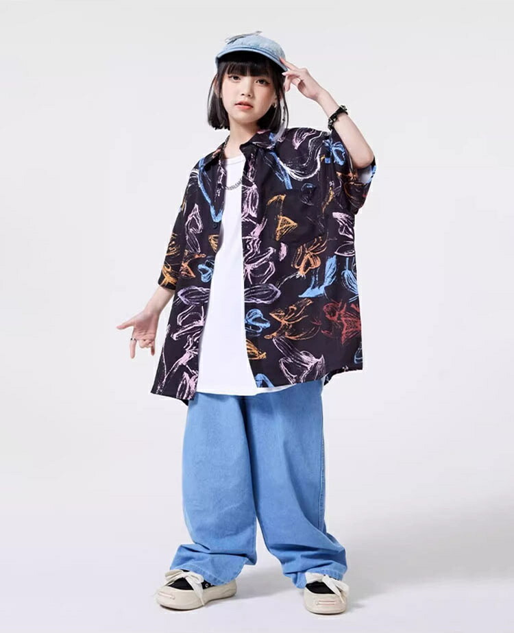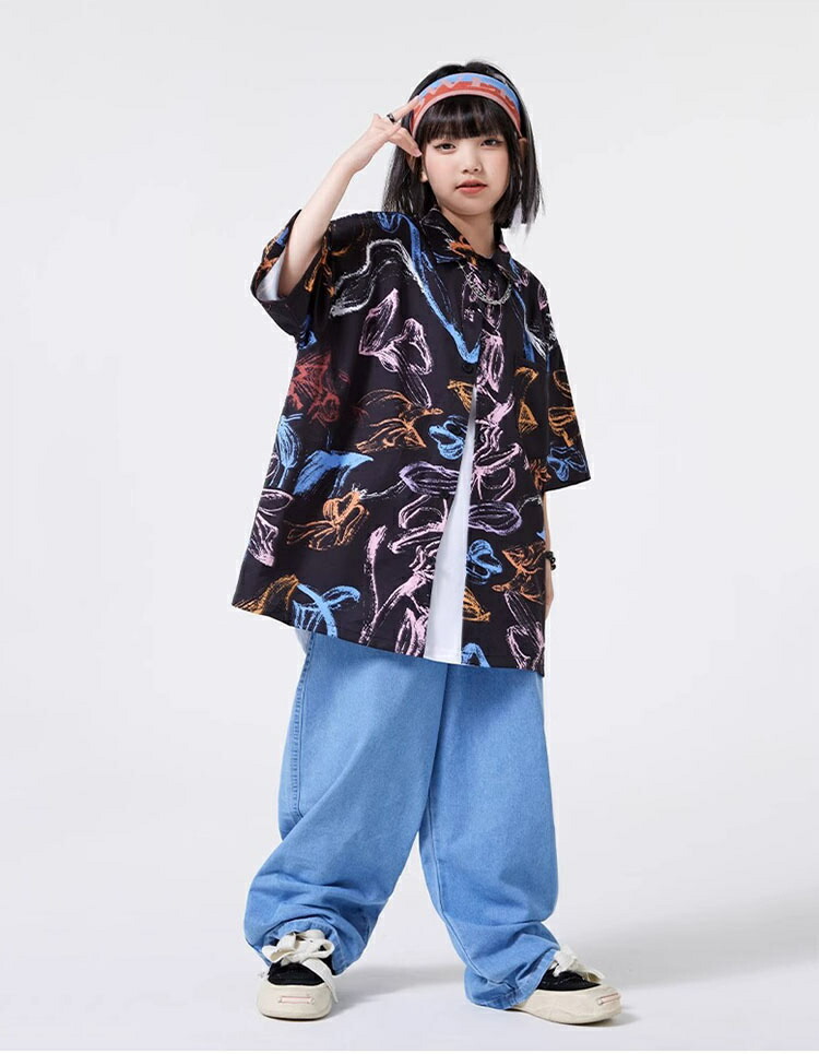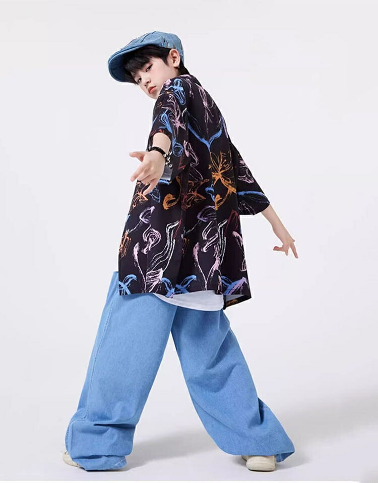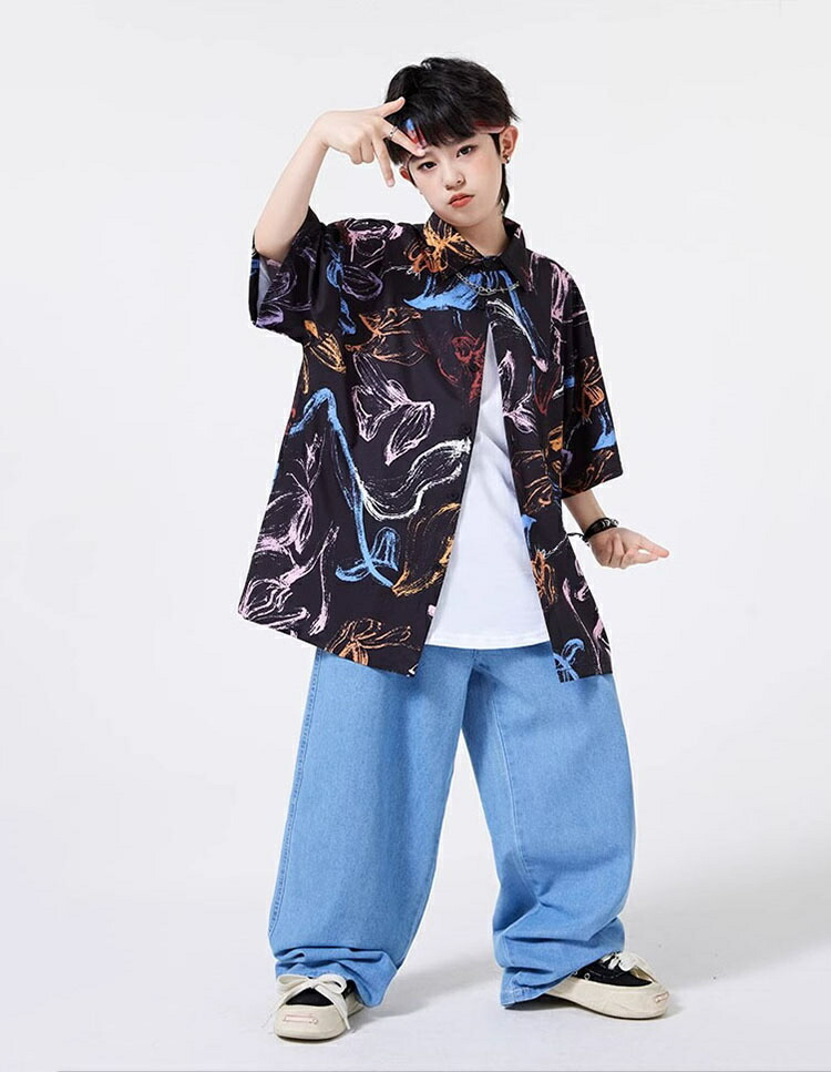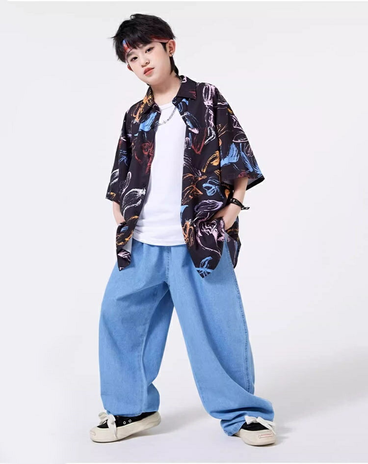 キッズダンス衣装 セットアップ 柄シャツ デニムパンツ かっこいい 韓国 k-pop ダンス衣装 ヒップホップ hiphop 演出服 110-180cm