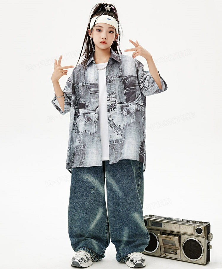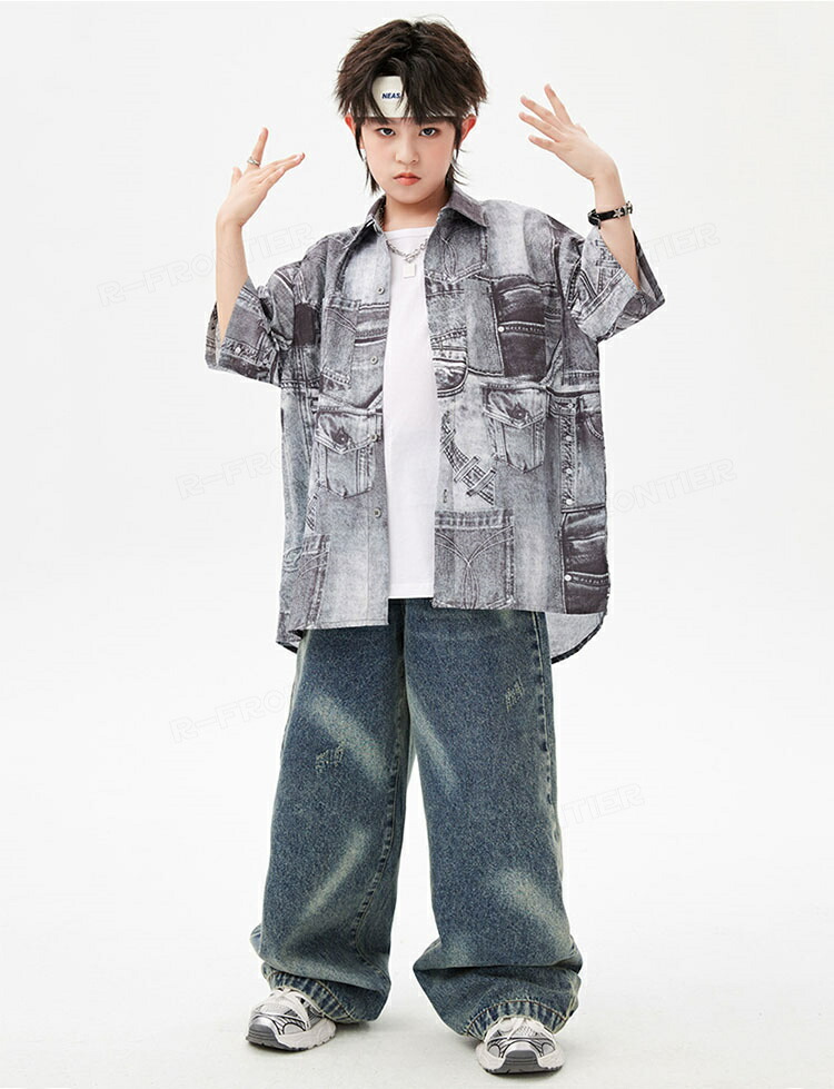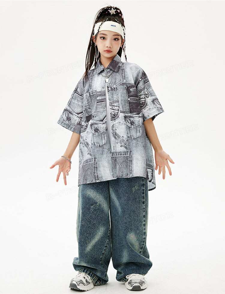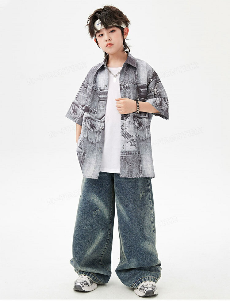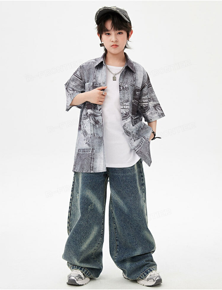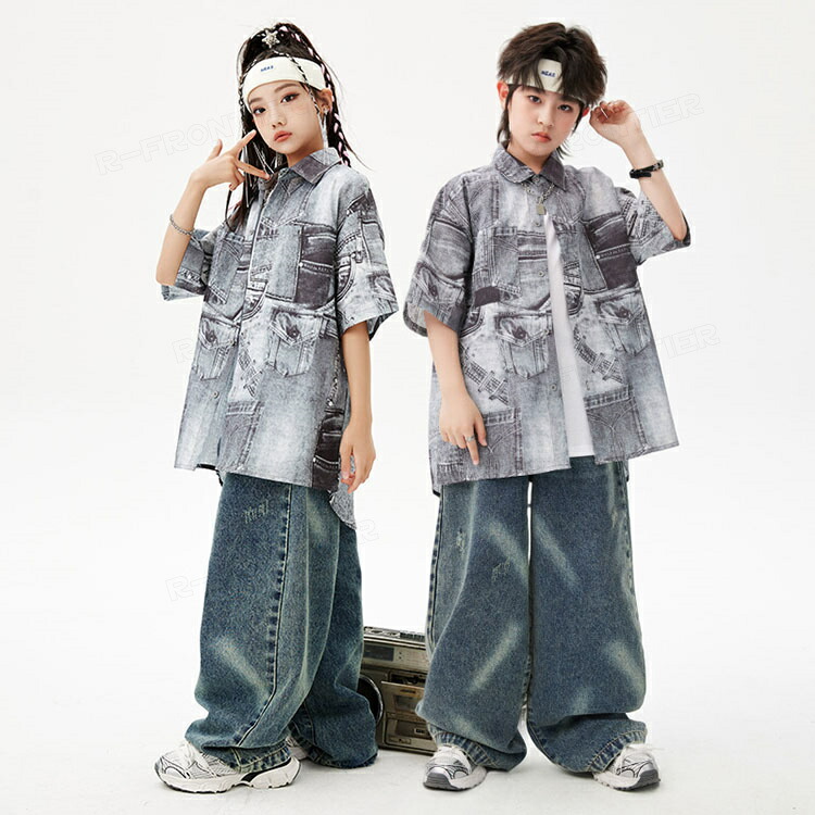 キッズダンス衣装 セットアップ 柄シャツ デニムパンツ かっこいい 韓国 k-pop ダンス衣装 ヒップホップ hiphop 演出服 110-180cm