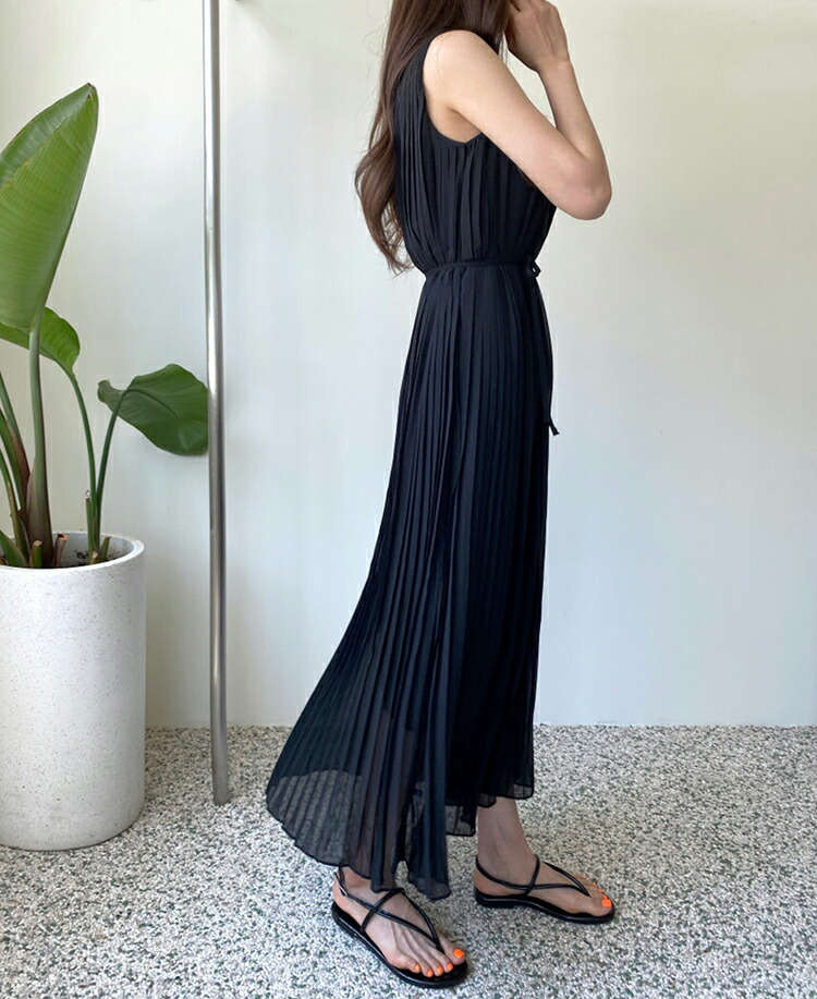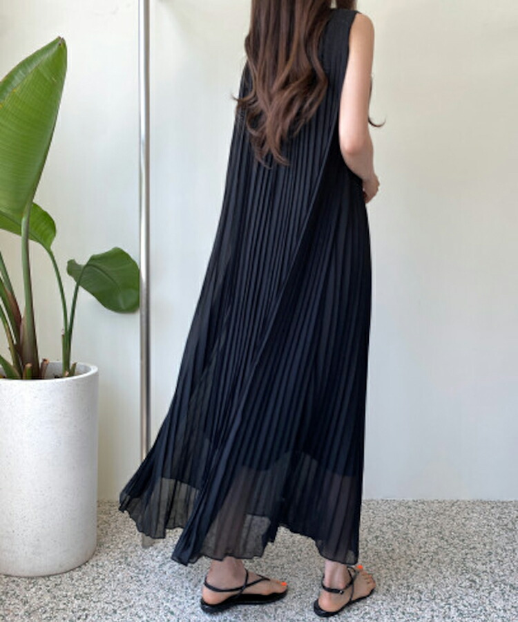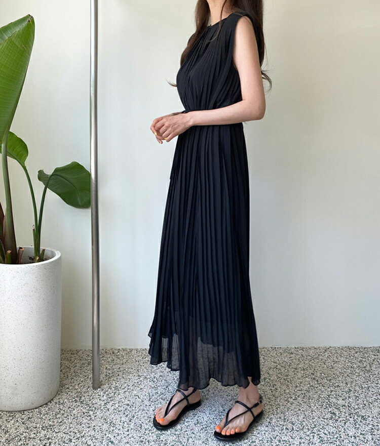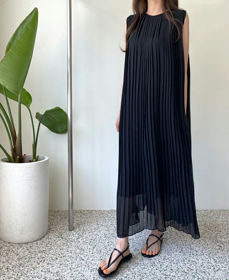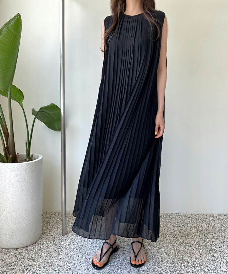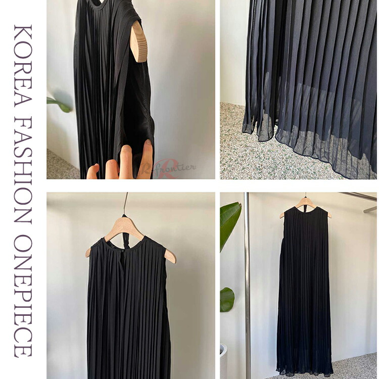 ワンピース ロング丈 ノースリーブ 無地 黒 韓国 シック 夏 プリーツ ゆったり ラウンドネック おしゃれ 大人可愛い プルオーバー お出かけ