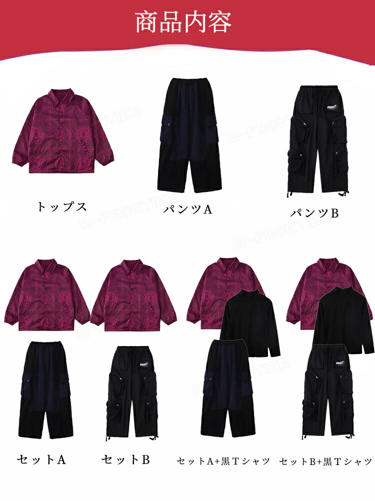 horizontal-key: トップスのみ パンツAのみ パンツBのみ セットA セットB セットA+黒Tシャツ セットB+黒Tシャツ