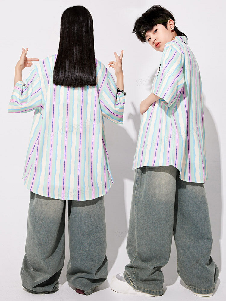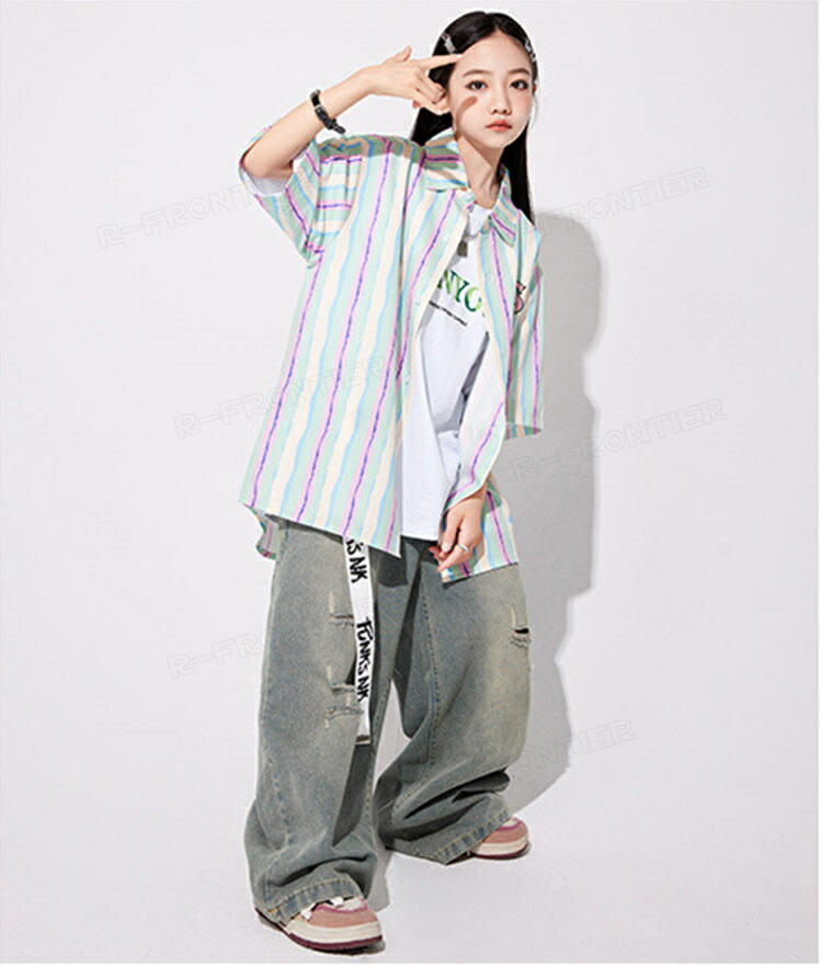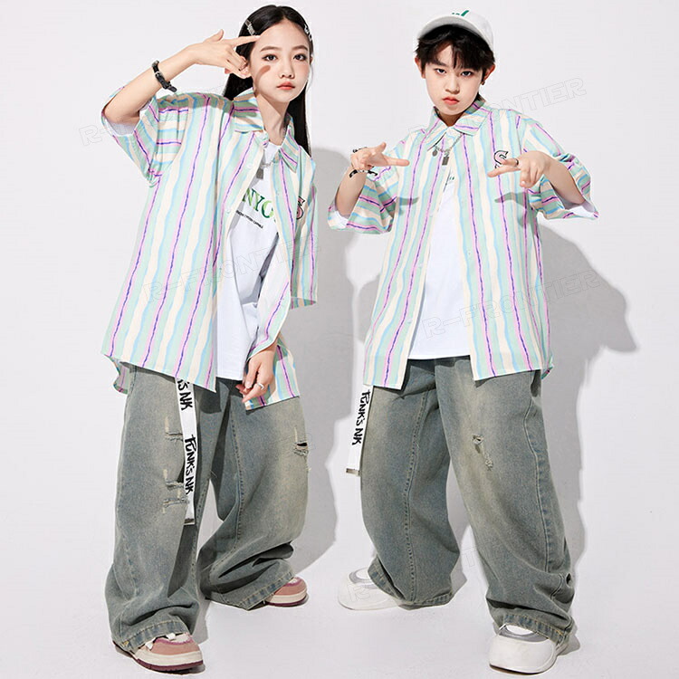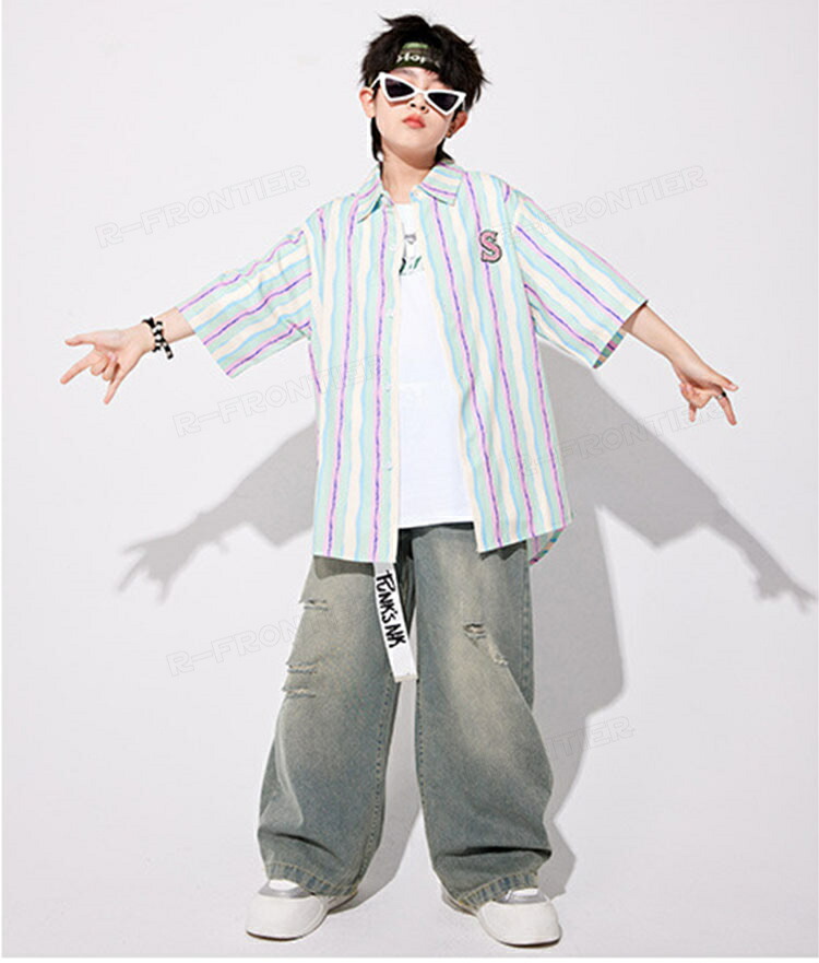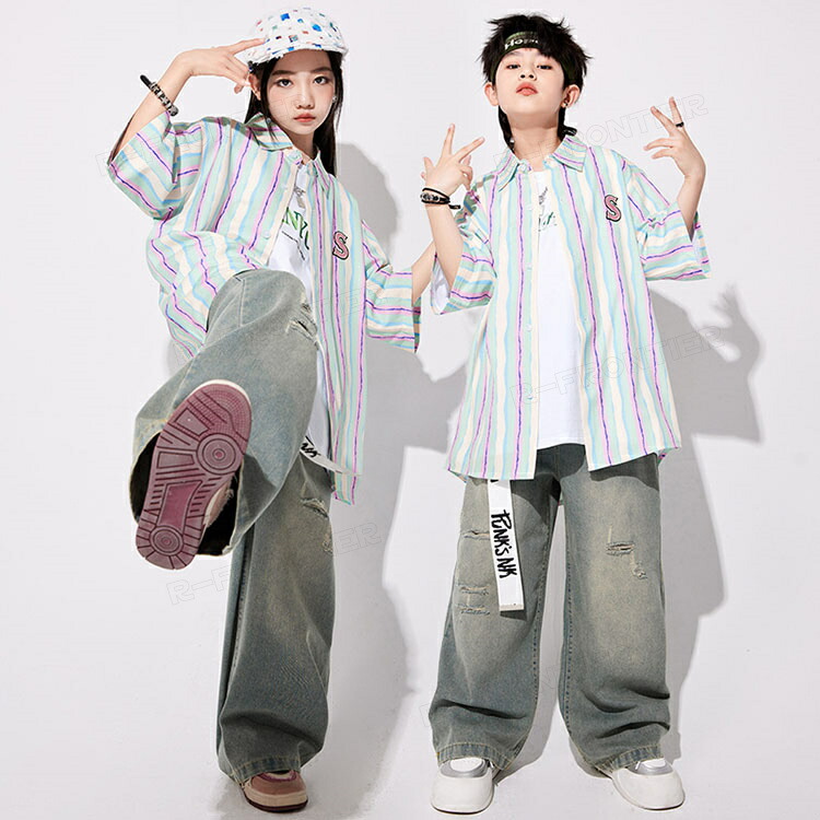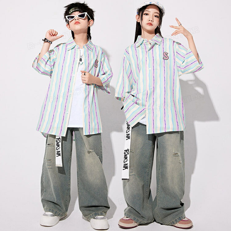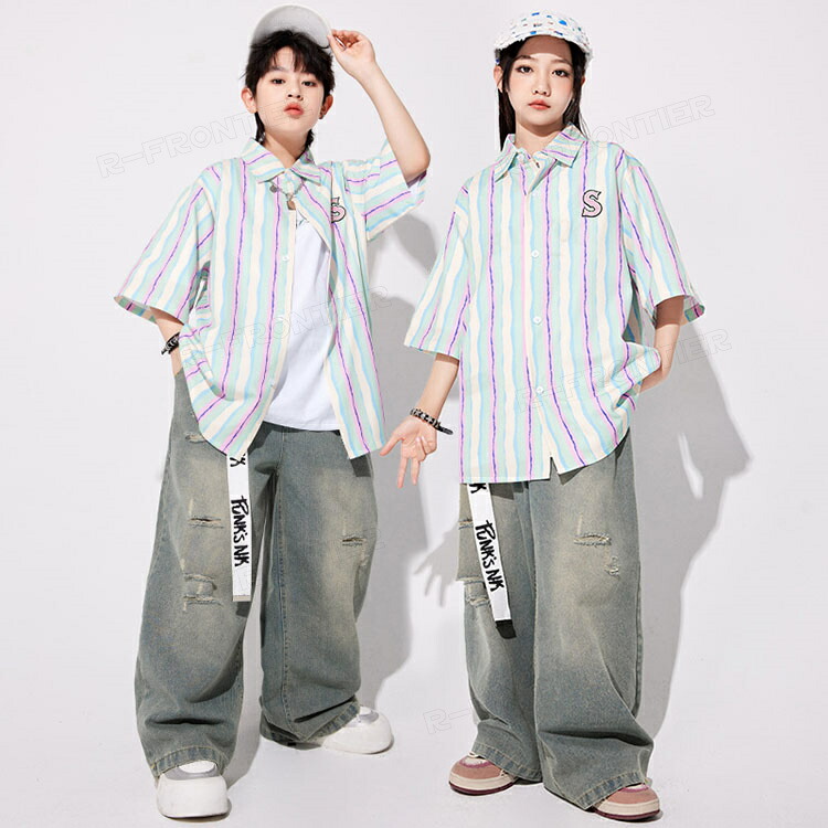 ダンス衣装 キッズ セットアップ 縞柄 シャツ 長パンツ ジャズダンス ユニセックス 男の子 女の子 韓国 ヒップホップ hiphop 演出服 応援団 練習着 110-180cm